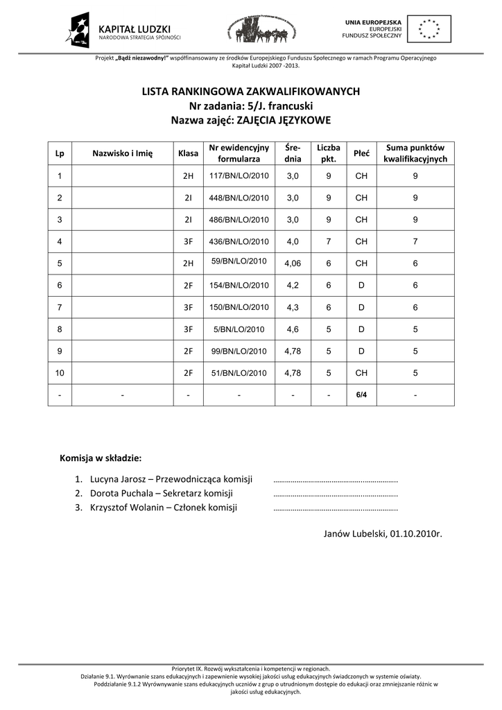 Projekt „Bądź niezawodny!” współfinansowany ze środków Europejskiego Funduszu Społecznego w ramach Programu Operacyjnego Kapitał Ludzki 2007 -2013. LISTA RANKINGOWA ZAKWALIFIKOWANYCH Nr zadania: 5/J. francuski Nazwa zajęć: ZAJĘCIA JĘZYKOWE Klasa Nr ewidencyjny formularza Średnia Liczba pkt. Płeć Suma punktów kwalifikacyjnych 1 2H 117/BN/LO/2010 3,0 9 CH 9 2 2I 448/BN/LO/2010 3,0 9 CH 9 3 2I 486/BN/LO/2010 3,0 9 CH 9 4 3F 436/BN/LO/2010 4,0 7 CH 7 5 2H 59/BN/LO/2010 4,06 6 CH 6 6 2F 154/BN/LO/2010 4,2 6 D 6 7 3F 150/BN/LO/2010 4,3 6 D 6 8 3F 5/BN/LO/2010 4,6 5 D 5 9 2F 99/BN/LO/2010 4,78 5 D 5 10 2F 51/BN/LO/2010 4,78 5 CH 5 - - - - 6/4 - Lp - Nazwisko i Imię - Komisja w składzie: 1. Lucyna Jarosz – Przewodnicząca komisji 2. Dorota Puchala – Sekretarz komisji 3. Krzysztof Wolanin – Członek komisji ………………………………………..…………….. ………………………………………..…………….. ………………………………………..…………….. Janów Lubelski, 01.10.2010r. Priorytet IX. Rozwój wykształcenia i kompetencji w regionach. Działanie 9.1. Wyrównanie szans edukacyjnych i zapewnienie wysokiej jakości usług edukacyjnych świadczonych w systemie oświaty. Poddziałanie 9.1.2 Wyrównywanie szans edukacyjnych uczniów z grup o utrudnionym dostępie do edukacji oraz zmniejszanie różnic w jakości usług edukacyjnych. Projekt „Bądź niezawodny!” współfinansowany ze środków Europejskiego Funduszu Społecznego w ramach Programu Operacyjnego Kapitał Ludzki 2007 -2013. LISTA REZERWOWA Nr zadania: 5/J. francuski Nazwa zajęć: ZAJĘCIA JĘZYKOWE Klasa Nr ewidencyjny formularza Średnia Liczba punktów Płeć Suma punktów kwalifikacyjnych 1 1H 325/BN/LO/2010 5,46 4 D 4 2 1F 43/BN/LO/2010 5,73 3 D 3 Lp Nazwisko i Imię Komisja w składzie: 1. Lucyna Jarosz – Przewodnicząca komisji 2. Dorota Puchala – Sekretarz komisji 3. Krzysztof Wolanin – Członek komisji ………………………………………..…………….. ………………………………………..…………….. ………………………………………..…………….. Janów Lubelski, 01.10.2010r. Priorytet IX. Rozwój wykształcenia i kompetencji w regionach. Działanie 9.1. Wyrównanie szans edukacyjnych i zapewnienie wysokiej jakości usług edukacyjnych świadczonych w systemie oświaty. Poddziałanie 9.1.2 Wyrównywanie szans edukacyjnych uczniów z grup o utrudnionym dostępie do edukacji oraz zmniejszanie różnic w jakości usług edukacyjnych.