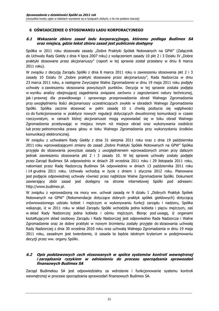 Sprawozdanie z działalności Spółki za 2011 rok (wszystkie kwoty ujęte w tabelach wyrażone są w tysiącach złotych, o ile nie podano inaczej) 6 OŚWIADCZENIE O STOSOWANIU ŁADU KORPORACYJNEGO 6.1 Wskazanie zbioru zasad ładu korporacyjnego, któremu podlega Budimex SA oraz miejsca, gdzie tekst zbioru zasad jest publicznie dostępny Spółka w 2011 roku stosowała zasady „Dobre Praktyki Spółek Notowanych na GPW” (Załącznik do Uchwały Rady Giełdy z dnia 4 lipca 2007 roku) z wyłączeniem zasady 10 pkt 2 i 3 Działu IV „Dobre praktyki stosowane przez akcjonariuszy” (raport w tej sprawie został przesłany w dniu 8 marca 2011 roku). W związku z decyzją Zarządu Spółki z dnia 8 marca 2011 roku o zawieszeniu stosowania pkt 2 i 3 zasady 10 Działu IV „Dobre praktyki stosowane przez akcjonariuszy”, Rada Nadzorcza w dniu 23 marca 2011 roku, a następnie Zwyczajne Walne Zgromadzenie w dniu 19 maja 2011 roku podjęły uchwały o zawieszeniu stosowania powyższych punktów. Decyzja w tej sprawie została podjęta w wyniku analizy obejmującej zagadnienia związane zarówno z zagrożeniami natury technicznej, jak i prawnej dla prawidłowego i sprawnego przeprowadzenia obrad Walnego Zgromadzenia przy uwzględnieniu ilości akcjonariuszy uczestniczących zwykle w obradach Walnego Zgromadzenia Spółki. Spółka zacznie stosować w pełni zasadę 10 z chwilą pozbycia się wątpliwości co do funkcjonowania w praktyce nowych regulacji dotyczących dwustronnej komunikacji w czasie rzeczywistym, w ramach której akcjonariusze mogą wypowiadać się w toku obrad Walnego Zgromadzenia przebywając w miejscu innym niż miejsce obrad oraz wykonywania osobiście lub przez pełnomocnika prawa głosu w toku Walnego Zgromadzenia przy wykorzystaniu środków komunikacji elektronicznej. W związku z uchwałami Rady Giełdy z dnia 31 sierpnia 2011 roku oraz z dnia 19 października 2011 roku wprowadzającymi zmiany do zasad „Dobre Praktyki Spółek Notowanych na GPW” Spółka przyjęła do stosowania powyższe zasady z uwzględnieniem wprowadzonych zmian przy dalszym jednak zawieszeniu stosowania pkt 2 i 3 zasady 10. W tej sprawie uchwały zostały podjęte przez Zarząd Budimex SA odpowiednio w dniach 28 września 2011 roku i 29 listopada 2011 roku, natomiast przez Radę Nadzorczą Budimex SA odpowiednio w dniach 13 października 2011 roku i 14 grudnia 2011 roku. Uchwały wchodzą w życie z dniem 1 stycznia 2012 roku. Planowane jest podjęcie odpowiedniej uchwały również przez najbliższe Walne Zgromadzenie Spółki. Dokument zawierający zbiór zasad jest dostępny na stronie internetowej Spółki pod adresem: http://www.budimex.pl. W związku z wprowadzoną na mocy ww. uchwał zasadą nr 9 działu I „Dobrych Praktyk Spółek Notowanych na GPW” (Rekomendacje dotyczące dobrych praktyk spółek giełdowych) dotyczącą zrównoważonego udziału kobiet i mężczyzn w wykonywaniu funkcji zarządu i nadzoru, Spółka wskazuje, iż w 2011 roku w skład Zarządu Spółki wchodziła jedna kobieta i pięciu mężczyzn, zaś w skład Rady Nadzorczej jedna kobieta i ośmiu mężczyzn. Biorąc pod uwagę, iż organami kształtującymi skład osobowy Zarządu i Rady Nadzorczej jest odpowiednio Rada Nadzorcza i Walne Zgromadzenie oraz że dobre praktyki w nowym brzmieniu zostały przyjęte do stosowania uchwałą Rady Nadzorczej z dnia 30 września 2010 roku oraz uchwałą Walnego Zgromadzenia w dniu 19 maja 2011 roku, zasadnym jest twierdzenie, iż zasada ta będzie istotnym kryterium w podejmowaniu decyzji przez ww. organy Spółki. 6.2 Opis podstawowych cech stosowanych w spółce systemów kontroli wewnętrznej i zarządzania ryzykiem w odniesieniu do procesu sporządzania sprawozdań finansowych Budimex SA Zarząd Budimeksu SA jest odpowiedzialny za wdrożenie i funkcjonowanie systemu kontroli wewnętrznej w procesie sporządzania sprawozdań finansowych Budimex SA. 21 Sprawozdanie z działalności Spółki za 2011 rok (wszystkie kwoty ujęte w tabelach wyrażone są w tysiącach złotych, o ile nie podano inaczej) Obowiązek sporządzenia sprawozdań finansowych jest realizowany w praktyce przez wykwalifikowanych pracowników pionu finansowego pod nadzorem członka Zarządu - dyrektora Pionu Ekonomiczno - Finansowego Budimeksu SA. Sporządzenie sprawozdań rocznych poprzedza spotkanie Komitetu Audytu z niezależnymi audytorami w celu ustalenia planu i zakresu badania sprawozdań finansowych oraz omówienia potencjalnych obszarów ryzyk mogących mieć wpływ na rzetelność i prawidłowość sprawozdań finansowych. Sporządzanie sprawozdań finansowych jest zaplanowanym procesem, uwzględniającym odpowiedni podział zadań pomiędzy pracowników pionu finansowego Budimeksu SA, adekwatny do ich kompetencji i kwalifikacji. Podstawą sporządzenia jednostkowych sprawozdań finansowych są księgi rachunkowe. Księgi rachunkowe Spółki są prowadzone przy użyciu programu finansowo-księgowego SAP R/3, który zapewnia podstawowe potrzeby informacyjne dla rachunkowości finansowej i zarządczej od 1 stycznia 2003 roku. System SAP R/3 jest zarządzany centralnie przez wykwalifikowanych pracowników Budimeksu SA, którzy ustalają poziomy autoryzacji w zakresie wprowadzania i modyfikacji danych transakcyjnych, układu podstawowych raportów oraz zmian w planie kont. Zespół Raportowania i Konsolidacji Budimeksu SA jest odpowiedzialny za rekomendowanie rozwiązań w zakresie modyfikacji i aktualizacji polityk księgowych oraz innych wymogów giełdowej sprawozdawczości finansowej, jak również ich wdrożenie po uprzednim zatwierdzeniu przez Zarząd. W trakcie sporządzania sprawozdań finansowych stosowane są między innymi następujące czynności kontrolne: • ocena istotnych, nietypowych transakcji pod kątem ich wpływu na sytuację finansową Spółki oraz sposób prezentacji w sprawozdaniu finansowym, • weryfikacja adekwatności przyjętych założeń do wyceny wartości sza