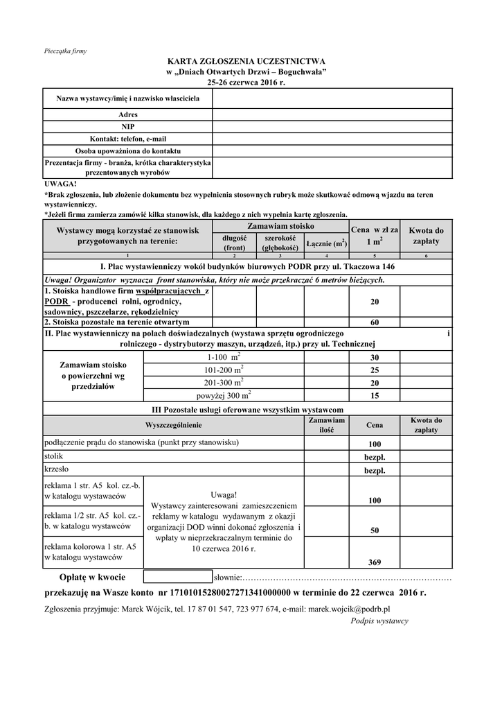 Pieczątka firmy KARTA ZGŁOSZENIA UCZESTNICTWA w „Dniach Otwartych Drzwi – Boguchwała” 25-26 czerwca 2016 r. Nazwa wystawcy/imię i nazwisko własciciela Adres NIP Kontakt: telefon, e-mail Osoba upoważniona do kontaktu Prezentacja firmy - branża, krótka charakterystyka prezentowanych wyrobów UWAGA! *Brak zgłoszenia, lub złożenie dokumentu bez wypełnienia stosownych rubryk może skutkować odmową wjazdu na teren wystawienniczy. *Jeżeli firma zamierza zamówić kilka stanowisk, dla każdego z nich wypełnia kartę zgłoszenia. Wystawcy mogą korzystać ze stanowisk przygotowanych na terenie: 1 Zamawiam stoisko długość (front) szerokość (głębokość) 2 3 Cena w zł za 1 m2 Łącznie (m ) 2 4 5 Kwota do zapłaty 6 I. Plac wystawienniczy wokół budynków biurowych PODR przy ul. Tkaczowa 146 Uwaga! Organizator wyznacza front stanowiska, który nie może przekraczać 6 metrów bieżących. 1. Stoiska handlowe firm współpracujących z PODR - producenci rolni, ogrodnicy, 20 sadownicy, pszczelarze, rękodzielnicy 2. Stoiska pozostałe na terenie otwartym 60 II. Plac wystawienniczy na polach doświadczalnych (wystawa sprzętu ogrodniczego rolniczego - dystrybutorzy maszyn, urządzeń, itp.) przy ul. Technicznej 1-100 m2 Zamawiam stoisko o powierzchni wg przedziałów i 30 2 101-200 m 25 2 201-300 m 20 2 powyżej 300 m 15 III Pozostałe usługi oferowane wszystkim wystawcom Zamawiam ilość Wyszczególnienie podłączenie prądu do stanowiska (punkt przy stanowisku) Cena 100 stolik bezpł. krzesło bezpł. reklama 1 str. A5 kol. cz.-b. w katalogu wystawaców Uwaga! Wystawcy zainteresowani zamieszczeniem reklama 1/2 str. A5 kol. cz.- reklamy w katalogu wydawanym z okazji b. w katalogu wystawców organizacji DOD winni dokonać zgłoszenia i wpłaty w nieprzekraczalnym terminie do reklama kolorowa 1 str. A5 10 czerwca 2016 r. w katalogu wystawców Opłatę w kwocie Kwota do zapłaty 100 50 369 słownie:………………………………………………………………………………… przekazuję na Wasze konto nr 17101015280027271341000000 w terminie do 22 czerwca 2016 r. Zgłoszenia przyjmuje: Marek Wójcik, tel. 17 87 01 547, 723 977 674, e-mail: [email protected] Podpis wystawcy