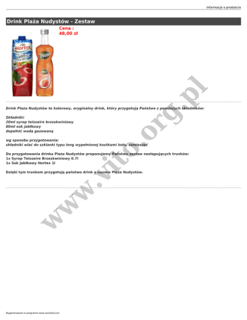 Informacje o produkcie Drink Plaża Nudystów - Zestaw or g. pl Cena : 48,00 zł Drink Plaża Nudystów to kolorowy, oryginalny drink, który przygotują Państwo z poniższych składników: Składniki: 20ml syrop teisseire brzoskwiniowy 80ml sok jabłkowy dopełnić wodą gazowaną o. wg sposobu przygotowania: składniki wlać do szklanki typu long wypełnionej kostkami lodu, zamieszać it Do przygotowania drinka Plaża Nudystów proponujemy Państwu zestaw następujących trunków: 1x Syrop Teisseire Brzoskwiniowy 0.7l 1x Sok Jabłkowy Hortex 1l w w w .v Dzięki tym trunkom przygotują państwo drink o nazwie Plaża Nudystów. Wygenerowano w programie www.oscGold.com