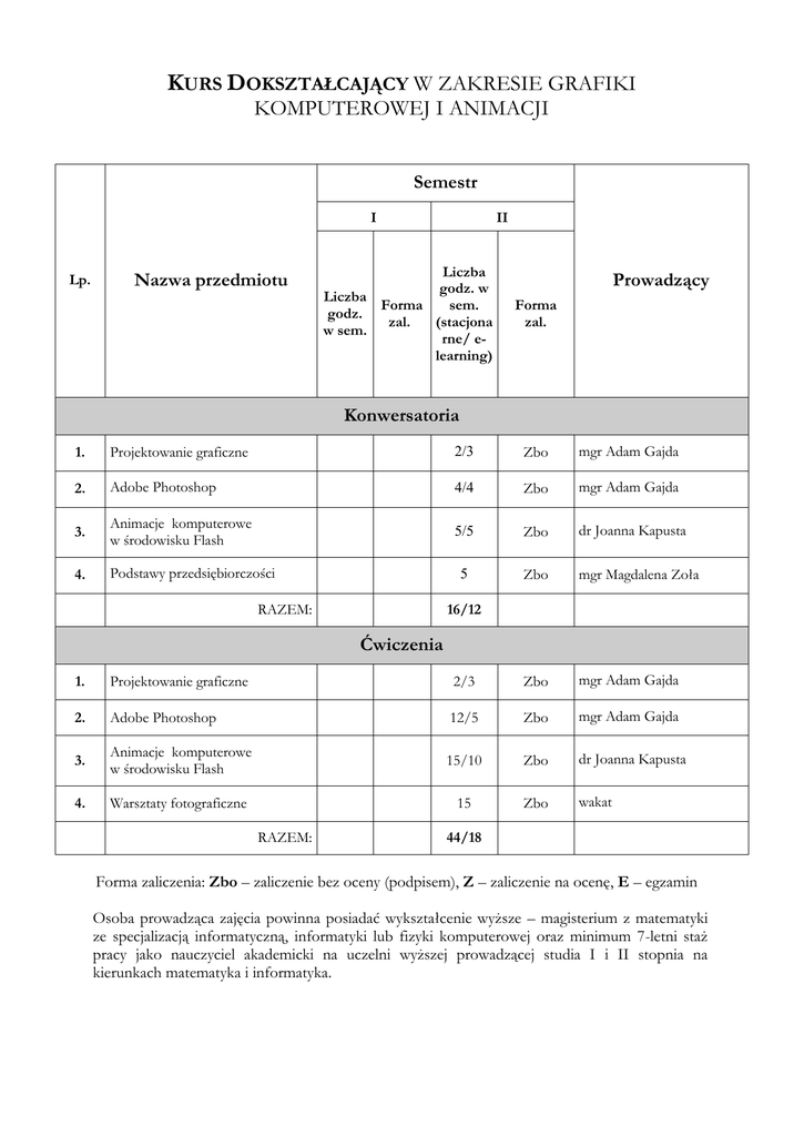 KURS DOKSZTAŁCAJĄCY W ZAKRESIE GRAFIKI KOMPUTEROWEJ I ANIMACJI Semestr I Lp. Nazwa przedmiotu II Liczba godz. w Liczba Forma sem. godz. zal. (stacjona w sem. rne/ elearning) Prowadzący Forma zal. Konwersatoria 1. Projektowanie graficzne 2/3 Zbo mgr Adam Gajda 2. Adobe Photoshop 4/4 Zbo mgr Adam Gajda 3. Animacje komputerowe w środowisku Flash 5/5 Zbo dr Joanna Kapusta 4. Podstawy przedsiębiorczości 5 Zbo mgr Magdalena Zoła RAZEM: 16/12 Ćwiczenia 1. Projektowanie graficzne 2/3 Zbo mgr Adam Gajda 2. Adobe Photoshop 12/5 Zbo mgr Adam Gajda 3. Animacje komputerowe w środowisku Flash 15/10 Zbo dr Joanna Kapusta 4. Warsztaty fotograficzne 15 Zbo wakat RAZEM: 44/18 Forma zaliczenia: Zbo – zaliczenie bez oceny (podpisem), Z – zaliczenie na ocenę, E – egzamin Osoba prowadząca zajęcia powinna posiadać wykształcenie wyższe – magisterium z matematyki ze specjalizacją informatyczną, informatyki lub fizyki komputerowej oraz minimum 7-letni staż pracy jako nauczyciel akademicki na uczelni wyższej prowadzącej studia I i II stopnia na kierunkach matematyka i informatyka. Dodatkowo od osoby prowadzącej zajęcia informatyczne wymagane jest doświadczenie w prowadzeniu zajęć dydaktycznych lub realizacji projektów w zakresie treści merytorycznych zgodnych z prowadzonym przedmiotem. Dodatkowo od osoby prowadzącej zajęcia z Podstaw przedsiębiorczości wymagane jest ukończenie studiów podyplomowych lub studiów dziennych na kierunku Zarządzanie (np. Zarządzanie Małymi i Średnimi Przedsiębiorstwami) oraz minimum roczne doświadczenie w realizacji projektów UE (kierownik projektu, podwykonawca). Warsztaty fotograficzne prowadzone będą przez specjalistę-praktyka, z wieloletnim stażem pracy w studiu fotograficznym, będącym zawodowym fotografem i grafikiem komputerowym.
