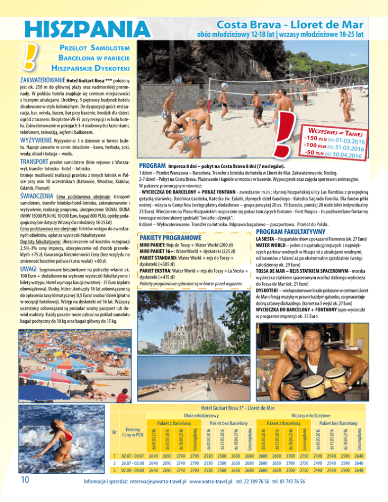 HISZPANIA ! Costa Brava - Lloret de Mar obóz młodzieżowy 12-18 lat | wczasy młodzieżowe 18-25 lat Przelot Samolotem Barcelona w pakiecie Hiszpańskie Dyskoteki ZAKWATEROWANIE Hotel Guitart Rosa *** położony jest ok. 250 m do głównej plaży oraz nadmorskiej promenady. W pobliżu hotelu znajduje się centrum miejscowości z licznymi atrakcjami. Urokliwy, 5 piętrowy budynek hotelu zbudowano w stylu kolonialnym. Do dyspozycji gości: restauracja, bar, winda, basen, bar przy basenie, brodzik dla dzieci, ogród z tarasem. Bezpłatne Wi-Fi przy recepcji i w holu hotelu. Zakwaterowanie w pokojach 3-4 osobowych z łazienkami, telefonem, telewizją, sejfem i balkonem. ! WYŻYWIENIE Wyżywienie 3 x dziennie w formie bufe- tu. Napoje zawarte w cenie: śniadanie - kawa, herbata, soki, woda; obiad i kolacja – woda. TRANSPORT przelot samolotem (linie rejsowe z Warsza- wy), transfer lotnisko - hotel – lotnisko. Istnieje możliwość realizacji przelotu z innych lotnisk w Polsce przy min 10 uczestnikach (Katowice, Wrocław, Kraków, Gdańsk, Poznań) ŚWIADCZENIA Cena podstawowa obejmuje: transport samolotem, transfer lotnisko-hotel-lotnisko, zakwaterowanie i wyżywienie, realizację programu, ubezpieczenie SIGNAL IDUNA (NNW 15000 PLN i KL 10 000 Euro, bagaż 800 PLN), opiekę pedagogiczną (nie dotyczy Wczasy dla młodzieży 18-25 lat) Cena podstawowa nie obejmuje: biletów wstępu do zwiedzanych obiektów, opłat za wycieczki fakultatywne Dopłaty fakultatywne: Ubezpieczenie od kosztów rezygnacji 2,5%-3% ceny imprezy, ubezpieczenie od chorób przewlekłych +75 zł, Gwarancja Niezmienności Ceny (bez względu na zmienność kosztów paliwa i kursu walut) +80 zł. UWAGI Sugerowane kieszonkowe na potrzeby własne ok. 100 Euro + dodatkowo na wybrane wycieczki fakultatywne i bilety wstępu. Hotel wymaga kaucji zwrotnej - 15 Euro (opłata obowiązkowa). Osoby, które ukończyły 16 lat zobowiązane są do opłacenia taxy klimatycznej: 0,5 Euro/ osoba/ dzień (płatna w recepcji hotelowej). Wstęp na dyskoteki od 16 lat. Wszyscy uczestnicy zobowiązani są posiadać ważny paszport lub dowód osobisty. Każdy pasażer może zabrać na pokład samolotu bagaż podręczny do 10 kg oraz bagaż główny do 15 kg. PROGRAM Wcześniej = Tan ie j -150 pln do 01 .03.2016 -100 pln do 31 .03.2016 -50 pln do 30.0 4.2016 Impreza 8 dni – pobyt na Costa Brava 8 dni (7 noclegów). 1 dzień – Przelot Warszawa – Barcelona. Transfer z lotniska do hotelu w Lloret de Mar. Zakwaterowanie. Nocleg. 2-7 dzień - Pobyt na Costa Brava. Plażowanie i kąpiele w morzu i w basenie. Wypoczynek oraz zajęcia sportowe i animacyjne. W pakiecie promocyjnym również: - WYCIECZKA DO BARCELONY + POKAZ FONTANN - zwiedzanie m.in.: słynnej hiszpańskiej ulicy Las Ramblas z przepiękną gotycką starówką, Dzielnica Łacińska, Katedra św. Eulalii, słynnych dzieł Gaudiego - Katedra Sagrada Familia. Dla fanów piłki nożnej - wizyta w Camp Nou (wstęp płatny dodatkowo – grupa powyżej 20 os. 19 Euro/os, poniżej 20 osób bilet indywidualny 23 Euro). Wieczorem na Placu Hiszpańskim rozpocznie się pokaz tańczących fontann - Font Magica - to podświetlane fontanny tworzące widowiskowy spektakl ”światło i dźwięk”. 8 dzień – Wykwaterowanie. Transfer na lotnisko. Odprawa bagażowo – paszportowa. Przelot do Polski.. PROGRAM FAKULTATYWNY PAKIETY PROGRAMOWE MINI PAKIET: Rejs do Tossy + Water World (200 zł) MINI PAKIET 16+: WaterWorld + dyskoteki (225 zł) PAKIET STANDARD: Water World + rejs do Tossy + dyskoteki (+305 zł) PAKIET EKSTRA: Water World + rejs do Tossy +La Siesta + dyskoteki (+415 zł) Pakiety programowe opłacane są w biurze przed wyjazem. LA SIESTA – hiszpańskie show z pokazami Flamenco (ok. 27 Euro) WATER WORLD – jeden z najatrakcyjniejszych i największych parków wodnych w Hiszpanii z atrakcjami wodnymi, od basenów z falami aż po ekstremalne zjeżdżalnie (wstęp całodzienny ok. 29 Euro) TOSSA DE MAR – REJS STATKIEM SPACEROWYM - morska wycieczka statkiem spacerowym wzdłuż dzikiego wybrzeża do Tossa de Mar (ok. 21 Euro) DYSKOTEKI – wielopoziomowe lokale położone w centrum Lloret de Mar oferują muzykę w prawie każdym gatunku, co gwarantuje dobrą zabawę dla każdego. (karnet na 5 wejść ok. 27 Euro) WYCIECZKA DO BARCELONY + FONTANNY (opis wycieczki w programie imprezy) ok. 35 Euro Hotel Guitart Rosa 3* - Lloret de Mar 1 2 3 10 Cena regularna do 30.04.2016 do 31.03.2016 do 01.03.2016 Cena regularna do 30.04.2016 do 31.03.2016 Wczasy młodzieżowe Pakiet z Barceloną Pakiet bez Barcelony do 01.03.2016 Cena regularna do 30.04.2016 do 31.03.2016 do 01.03.2016 Cena regularna do 30.04.2016 do 31.03.2016 Terminy Nr Ceny w PLN do 01.03.2016 Obóz młodzieżowy Pakiet z Barceloną Pakiet bez Barcelony 02.07 - 09.07 2640 2690 2740 2790 2530 2580 2630 2680 2600 2650 2700 2750 2490 2540 2590 2640 26.07 - 02.08 2640 2690 2740 2790 2530 2580 2630 2680 2600 2650 2700 2750 2490 2540 2590 2640 02.08 - 09.08 2640 2690 2740 2790 2530 2580 2630 2680 2600 2650 2700 2750 2490 2540 2590 2640 Informacje i sprzedaż: [email protected] www.watra-travel.pl tel. 22 389 76 56 tel. 81 743 76 56