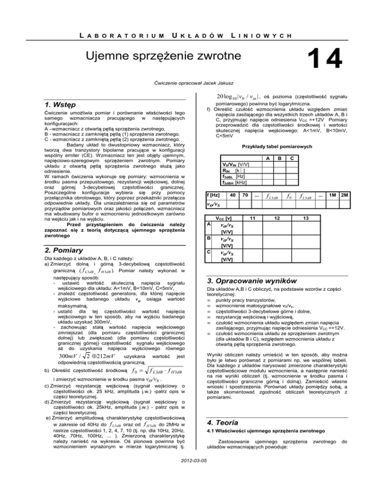L A B O R A T O R I U M U K Ł A D Ó W L I N I O W Y C H 14 Ujemne sprzężenie zwrotne Ćwiczenie opracował Jacek Jakusz 20 log 10 | v 0 / vin | , oś pozioma (częstotliwość sygnału 1. Wstęp Ćwiczenie umożliwia pomiar i porównanie właściwości tego samego wzmacniacza pracującego w następujących konfiguracjach: A –wzmacniacz z otwartą pętlą sprzężenia zwrotnego, B - wzmacniacz z zamkniętą pętlą (1) sprzężenia zwrotnego. C - wzmacniacz z zamkniętą pętlą (2) sprzężenia zwrotnego. Badany układ to dwustopniowy wzmacniacz, który tworzą dwa tranzystory bipolarne pracujące w konfiguracji wspólny emiter (CE). Wzmacniacz ten jest objęty ujemnym, napięciowo-szeregowym sprzężeniem zwrotnym. Pomiary układu z otwartą pętlą sprzężenia zwrotnego służą jako odniesienie. W ramach ćwiczenia wykonuje się pomiary: wzmocnienia w środku pasma przepustowego, rezystancji wejściowej, dolnej oraz górnej 3-decybelowej częstotliwości granicznej, Poszczególne konfiguracje wybiera się przy pomocy przełącznika obrotowego, który poprzez przekaźniki przełącza odpowiednie układy. Dla uniezależnienia się od parametrów przyrządów pomiarowych oraz jakości połączeń, wzmacniacz ma wbudowany bufor o wzmocnieniu jednostkowym zarówno na wejściu jak i na wyjściu. Przed przystąpieniem do ćwiczenia należy zapoznać się z teorią dotyczącą ujemnego sprzężenia zwrotnego Przykłady tabel pomiarowych A B C V0/VIN [V/V] RIN [kΩ] f3dBL [Hz] f3dBH [kHz] f [Hz] 40 70 ... f L 3 dB f0 f L 3 dB ... 1M 2M vo/vs VCC [v] A vo/vs B vo/vs C vo/vs 11 12 13 [V/V] [V/V] 2. Pomiary Dla każdego z układów A, B, i C należy: a) Zmierzyć dolną i górną 3-decybelową częstotliwość graniczną ( f L 3 dB , f H 3dB ). Pomiar należy wykonać w następujący sposób: - ustawić wartość skuteczną napięcia sygnału wejściowego dla układu: A<1mV, B<10mV, C<5mV, - znaleźć częstotliwość generatora, dla której napięcie wyjściowe badanego układu vo osiąga wartość maksymalną, - ustalić dla tej częstotliwości wartość napięcia wejściowego w ten sposób, aby na wyjściu badanego układu uzyskać 300mV, - zachowując stałą wartość napięcia wejściowego zmniejszać (dla pomiaru częstotliwości granicznej dolnej) lub zwiększać (dla pomiaru częstotliwości granicznej górnej) częstotliwość sygnału wejściowego aż do uzyskania napięcia wyjściowego równego 300mV / 2 ≈ 212mV uzyskana odpowiednią częstotliwością graniczną. b) Określić częstotliwość środkową pomiarowego) powinna być logarytmiczna. f) Określić czułość wzmocnienia układu względem zmian napięcia zasilającego dla wszystkich trzech układów A, B i C, przyjmując napięcie odniesienia VCC =+12V Pomiary przeprowadzić dla częstotliwości środkowej i wartości skutecznej napięcia wejściowego: A<1mV, B<10mV, C<5mV f0 = wartość jest f L 3dB ⋅ f H 3dB i zmierzyć wzmocnienie w środku pasma vo/vs . c) Zmierzyć rezystancję wejściową (sygnał wejściowy o częstotliwości ok. 25 kHz, amplituda j.w.) -patrz opis w części teoretycznej. d) Zmierzyć rezystancję wyjściową (sygnał wejściowy o częstotliwości ok. 25kHz, amplituda j.w.) - patrz opis w części teoretycznej. e) Zmierzyć amplitudową charakterystykę częstotliwościową w zakresie od 40Hz do f L 3 dB oraz od f H 3dB do 2MHz w rastrze częstotliwości 1, 2, 4, 7, 10 (tj. np. dla 10Hz, 20Hz, 40Hz, 70Hz, 100Hz, ... ). Zmierzoną charakterystykę należy nanieść na wykresie. Oś pionowa powinna być wzmocnieniem wyrażonym w mierze logarytmicznej tj. 2012-03-05 [V/V] 3. Opracowanie wyników Dla układów A,B i C obliczyć, na podstawie wzorów z części teoretycznej: • punkty pracy tranzystorów, • wzmocnienie małosygnałowe v0/vs, • częstotliwości 3-decybelowe górne i dolne, • rezystancję wejściową i wyjściową, • czułość wzmocnienia układu względem zmian napięcia zasilającego, przyjmując napięcie odniesienia VCC =+12V. • czułość wzmocnienia układu ze sprzężeniem zwrotnym (dla układów B i C), względem wzmocnienia układu z otwartą pętlą sprzężenia zwrotnego. Wyniki obliczeń należy umieścić w ten sposób, aby można było je łatwo porównać z pomiarami np. we wspólnej tabeli. Dla każdego z układów narysować zmierzone charakterystyki częstotliwościowe modułu wzmocnienia, a następnie nanieść na nie wyniki obliczeń (tj. wzmocnienie w środku pasma i częstotliwości graniczne górną i dolną). Zamieścić własne wnioski i spostrzeżenia. Porównać układy pomiędzy sobą, a także skomentować zgodność obliczeń teoretycznych z pomiarami. 4. Teoria 4.1 Właściwości ujemnego sprzężenia zwrotnego Zastosowanie ujemnego sprzężenia układów wzmacniających powoduje: zwrotnego do 14-2 1) stabilizację wzmocnienia – uniezależnianie się od wpływu zmian wzmocnienia elementu aktywnego w pod wpływem temperatury, napięcia zasilającego itp.; 2) możliwość modyfikacji impedancji wejściowej i wyjściowej; 3) zmniejszenie zniekształceń nieliniowych; 4) poszerzenie pasma układu. Wady ujemnego sprzężenia zwrotnego: zmniejszenie wzmocnienia możliwość wzbudzania się układu Schemat idealnego sprzężenia zwrotnego przedstawiono na rys. 1 xs + Σ xi xf − A xo B Rys. 1. Schemat idealnego sprzężenia zwrotnego Wzmocnienie zwrotnego: Af ≡ układu z zamkniętą pętlą sprzężenia A A SAf = ∆A f ponieważ Af górną ω Lf = (1 + AM B ) pulsację = ωL F , dA dA Uz = A = dUz dUz A Uz A vi Avi vo B vf vo Rys. 3. Model wzmacniacza sprzężeniem zwrotnym. z napięciowo-szeregowym Rif vs Rof Afvs vo Rys. 4. Model zastępczy wzmacniacza. Wzmocnienie układu: Af = vo A = v s 1 + AB Rezystancja wejściowa: Rif = Ri (1 + AB ) A SUz = ∆A Uz ∆Uz A Ważnym parametrem jest czułość wzmocnienia układu z ujemnym sprzężeniem zwrotnym na zmianę wzmocnienia układu z otwartą pętlą sprzężenia. Wyraża się ona wzorem