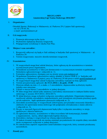 REGULAMIN Amatorskiej Ligi Tenisa Stołowego 2016/2017 I. Organizator: Ośrodek Sportu i Rekreacji w Malanowie, ul. Parkowa 29 ( I piętro Sali sportowej), - tel. 63 278 05 30, - e-mail: [email protected] II. Cel rozgrywek: 1. Promocja aktywnego trybu życia. 2. Wyłonienie najlepszej drużyny rozgrywek. 3. Propagowanie rywalizacji w duchu Fair Play. III. Miejsce i czas zawodów: 1. Rozgrywki odbywać się będą w Sali szklanej w budynku Sali sportowej w Malanowie - ul. Parkowa 29. 2. Termin rozgrywania meczów określa terminarz rozgrywek. IV. Uczestnictwo: 1. W rozgrywkach mogą brać udział drużyny, które zgłoszą się do uczestnictwa w terminie wyznaczonym przez organizatora. 2. Warunkiem uczestnictwa w lidze jest dostarczenie w wyznaczonym terminie wypełnionego formularza zgłoszeniowego ( załącznik nr. 1). 3. Formularz zgłoszeniowy dostępny jest na stronie www.osir.malanow.pl 4. Wypełnione formularze zgłoszeniowe należy składać w biurze OSiR tj. w budynku sali sportowej w Malanowie (I piętro), przy ul. Parkowej 29 lub przez e-mail [email protected]. 5. W rozgrywkach mogą brać udział wyłącznie zawodnicy wpisani na listę zgłoszeń. 6. Termin przyjmowania zgłoszeń: do 15.11.2016 r. do godz. 15:00 7. Drużyna składa się min. z 2, a maks. z 3 zawodników, dopuszczalne są drużyny męskie, żeńskie oraz mieszane. 8. Udział w meczu bierze 2 zawodników w jednej drużynie. 9. W lidze mogą brać udział tylko amatorzy (zawodnicy niezrzeszeni w żadnym klubie tenisa stołowego w sezonie 2015/2016 i 2016/2017). 10. W skład drużyny mogą wchodzić wyłącznie zawodnicy pełnoletni. Organizator dopuszcza możliwość udziału zawodników niepełnoletnich, pod warunkiem otrzymania pisemnej zgody od ich rodziców, bądź opiekunów prawnych (załącznik nr. 2). 11. Zawodnik uczestniczący w rozgrywkach zobowiązany jest posiadać orzeczenie lekarskie o zdolności do uprawiania tenisa stołowego lub podpisanie oświadczenia o stanie zdrowia ( załącznik nr. 3). 12. Do gry w meczach ligowych dopuszczeni będą tylko i wyłącznie zawodnicy w stroju sportowym i obuwiu halowym. 13. Za zgłoszenie drużyny, uczestnictwo w lidze (wycofanie lub kontynuację), kontakt z organizatorem, nazwę, skład odpowiada kapitan drużyny. 14. Zawodnicy startują w rozgrywkach na własną odpowiedzialność. 15. W trakcie trwania rozgrywek nie można zmieniać przynależności do zespołu (dany zawodnik może występować wyłącznie w jednej drużynie). 16. Po zakończeniu zapisów organizator ustali kalendarz rozgrywek, który zostanie przekazany uczestnikom. V. Zasady gry: 1. System rozgrywek jest uzależniony od liczby zgłoszeń i zostanie ustalony po zakończeniu przyjmowania formularzy zgłoszeniowych. 2. Mecze rozgrywane będą zgodnie z obowiązującymi przepisami PZTS. 3. Mecz ligowy składa się z 4 partii singlowych i jednej deblowej. 4. Mecz rozgrywany jest wg. schematu 2 partie singlowe – debel – 2 partie singlowe. 5. Partie singlowe w meczu będą rozgrywane systemem „ każdy z każdym”. 6. Na wygranie partii składa się wygranie 3 setów (11-punktowy system liczenia), w przypadku stanu 2:2 w setach rozgrywany jest tie-break, również do 11 pkt. 7. Dopuszczalne są zmiany zawodników w trakcie meczu. 8. Sędziami spotkań ligowych będą sami zawodnicy. 9. Mecz zostaje zweryfikowany jako walkower dla przeciwnika jeżeli: a. drużyna nie stanęła do zawodów lub spóźniła się więcej niż 15 minut, b. drużyna stawi się na mecz zdekompletowana – mniej niż 2 zawodników, c. drużyna wystawiła do gry zawodnika nieuprawnionego, 10. Drużyna, która odda 3 mecze walkowerem lub mecze zostaną zweryfikowane takim wynikiem, zostaje wycofana z dalszych rozgrywek, a wyniki spotkań tej drużyny jeżeli zostało rozegranych mniej niż 50% spotkań z całego sezonu zostają anulowane, w przypadku powyżej 50% wszystkie zespoły otrzymują walkower. 11. Drużyna ma prawo wystąpić do organizatora z prośbą o zmianę terminu meczu tylko w uzasadnionych przypadkach. Prośba będzie rozpatrywana jeżeli wpłynie do organizatora nie później niż 3 dni przed datą ustaloną w terminarzu rozgrywek. 12. Przesunięcie terminu meczu może nastąpić tylko za zgodą obu drużyn. W przypadku negatywnych rokowań mecz musi się odbyć zgodnie z terminarzem rozgrywek. 13. Przed każdą partią zawodnikom przysługuje dwuminutowa rozgrzewka przy stole. VI. Klasyfikacja: 1. W lidze obowiązuje następująca punktacja: a. 5:0 lub 4:1 – zwycięzca 3 pkt., przegrany 0 pkt. b. 3:2 – zwycięzca 2 pkt, przegrany 1 pkt. c. Walkower – 5:0 – 0 pkt. 2. O kolejności miejsc w tabeli decyduje suma zdobytych punktów. 3. W przypadku równej ilości punktów uzyskanych przez dwie drużyny, decyduje: a. Bilans meczów między tymi drużynami, b. Bilans gier (partii), c. Bilans setów, d. Większa liczba wygranych gier (partii). 4. W przypadku równej ilości punktów uzyskanych przez 3 i więcej drużyn decyduje tzw. „mała tabela”, w której uwzględnia się mecze tylko między zainteresowanymi zespołami. 5. W fazie play-off rozgrywek, drużyny grają o awans do dwóch zwycięstw. 6. W przypadku stanu 1:1 w meczach ¼ lub ½ finału należy rozegrać 3 spotkanie decydujące o awansie do dalszej fazy rozgrywek. 7. Punktacja ligowa, uzupełniana po każdej kolejce, będzie dostępna na stronie internetowej www.osir.malanow.pl. VII. Inne postanowienia: 1. Zawodnicy wyrażają zgodę na publikację, pokazywanie i wykorzystywanie do celów informacyjnych i promocyjnych w zależności od wyboru wizerunku, nazwiska, zdjęć z rozgrywek Amatorskiej Ligi Tenisa Stołowego, w dowolnym formacie i we wszystkich mediach istniejących obecnie i w przyszłości na całym świecie. 2. Przystąpienie do rozgrywek jest jednoznaczne z akceptacją Regulaminu. Poprzez złożenie podpisów na liście zgłoszeniowej zawodnicy oświadczają, że zapoznali się z niniejszym Regulaminem, zobowiązuj