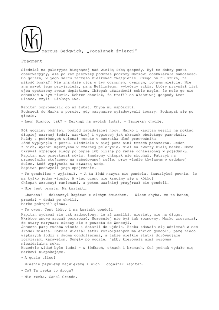 Marcus Sedgwick, „Pocałunek śmierci” Fragment Siedział na galeryjce biegnącej nad wielką izbą gospody. Był to dobry punkt obserwacyjny, ale po raz pierwszy podczas podróŜy Markowi doskwierała samotność. Co gorsza, w jego sercu zaczęło kiełkować zwątpienie. Czego on tu szuka, na miłość boską?! Nie znajdzie ojca w tym ogromnym, gwarnym, rojnym mieście. Nie zna nawet jego przyjaciela, pana Belliniego, wytwórcy szkła, który przysłał list ojca opatrzony swoim dopiskiem. Chłopak uświadomił sobie nagle, Ŝe moŜe go nie odszukać w tym tłumie. Dobrze chociaŜ, Ŝe trafił do właściwej gospody Leon Bianco, czyli Białego Lwa. Kapitan odprowadził go aŜ tutaj. Chyba mu współczuł. Podszedł do Marka w porcie, gdy marynarze wyładowywali towary. Podrapał się po głowie. – Leon Bianco, tak? – Zerknął na swoich ludzi. – Zaczekaj chwilę. Pół godziny później, pośród zapadającej nocy, Marko i kapitan weszli na pokład długiej czarnej łodzi, wąs-kiej i wygiętej jak skrawek obciętego paznokcia. KaŜdy z podróŜnych wcisnął monetę w szorstką dłoń przewoźnika. Łódź wypłynęła z portu. Siedziało w niej poza nimi trzech pasaŜerów. Jeden z nich, wysoki męŜczyzna w czarnej pelerynie, miał na twarzy białą maskę. MoŜe ukrywał szpecące ślady po ospie lub bliznę po ranie odniesionej w pojedynku. Kapitan nie przestawał mówić. Znudzony chłopak nie słuchał. Patrzył na przewoźnika stojącego na zabudowanej rufie, przy wiośle tkwiącym w ozdobnej dulce. Łódź wypłynęła na otwartą wodę. Kapitan pochwycił jego spojrzenie. – To gondolier – wyjaśnił. – A ta łódź nazywa się gondola. ZauwaŜyłeś pewnie, Ŝe ma tylko jedno wiosło. A więc czemu nie kręcimy się w kółko? Chłopak wzruszył ramionami, a potem uwaŜniej przyjrzał się gondoli. – Nie jest prosta. Ma kształt… – …banana! – dokończył kapitan z cichym śmiechem. – Wiesz chyba, co to banan, prawda? – dodał po chwili. Marko pokręcił głową. – To owoc. Jest Ŝółty i ma kształt gondoli. Kapitan wydawał się tak zadowolony, Ŝe aŜ zamilkł, niestety nie na długo. Wkrótce znowu zaczął perorować. Wcześniej nie był tak rozmowny. Marko zrozumiał, Ŝe stary marynarz cieszy się z powrotu do Wenecji. Jeszcze parę ruchów wiosła i dotarli do ujścia. Rzeka zdawała się wdzierać w sam środek miasta. Dokoła widział setki rozkołysanych maleńkich gondoli, parę nieco większych łodzi z dwoma gondolierami, a takŜe wielkie statki dorównujące rozmiarami karawelom. Sunęły po wodzie, jakby kierowała nimi ogromna niewidzialna ręka. Wszędzie widać było ludzi – w łódkach, oknach i bramach. Coś jednak wydało się Markowi niepokojące. – A gdzie ulice? – Właśnie płyniemy największą z nich – objaśnił kapitan. – Co? Ta rzeka to droga? – Nie rzeka. Canal Grande. – Sztuczny kanał? – Całe to miasto jest sztucznym tworem. Ponoć wzniesiono je ponad tysiąc lat temu na trzęsawiskach. Gdy nadciągnęli Mongołowie, którzy zaczęli grabić i mordować ludność Ŝyjącą na wybrzeŜu, rybacy uciekli na trzęsawiska i zbudowali chatki na palach. Zostali w tym miejscu na zawsze. Patrz! Nadal tu są! Kapitan wskazał strzeliste domy. NajwyŜsze miały pięć pięter. – Postawili te domy na błotnistych wzniesieniach, a potem zmienili kurs płynących do laguny rzek, Ŝeby wymywały muł. Woda stała się głębsza. A teraz spójrz na nich! Rybacy? Najbogatsi na świecie! Marko skinął głową. – WciąŜ wydaje mi się, Ŝe śnię. To miasto nie moŜe istnieć naprawdę. Czy ono wcale nie ma ulic? – Ma, ale bardzo wąskie. Widzisz przed sobą archipelag maleńkich wysepek połączonych mostami. Na kaŜdej znajdują się uliczki, jak wszędzie, ale nieduŜe, bo większość stałego lądu zabrały palazzi – domy. Marko znowu pogrąŜył się we własnych myślach. Ale kapitan jakby tego nie dostrzegał. – Oczywiście zwykle nie zatrzymujemy się w Białym Lwie. Tam jest dla nas za drogo. PrzewaŜnie zadowalamy się małym albergo, zajazdem w porcie. Ale rejs był udany, więc gdy powiedziałeś, Ŝe wybierasz się do Leon Bianco, pomyślałem: czemu nie? Zasługujesz na to. A moi marynarze zasługują, Ŝeby ode mnie odpocząć. I perorował dalej, aŜ gondola zatrzymała się przed drzwiami gospody. Obaj męŜczyźni stanęli na drewnianym podeście, z którego trafili w środek gwaru. Niemal natychmiast Marko został sam w tłumie ludzi. Kapitan spotkał jakąś kobietę, z którą najwyraźniej łączyła go dawna zaŜyłość. Zanim zniknęli razem na pięterku, ze schodów dobiegł jeszcze jego głos: – Dlaczego nie, powiedziałem sobie. Zasługujesz na to! Dziewczyna przemknęła obok, niosąc nad głową tacę z kielichami i dzbanek. Marko zrobił krok do tyłu, aby się z nią nie zderzyć, zawadził o czyjąś stopę i runął na wznak. Na chwilę zaparło mu dech. Spojrzał na twarz osoby, o której nogę się potknął. Bardzo wysoki i stary męŜczyzna w czarnej opończy, o zupełnie białych włosach i twarzy pobruŜdŜonej głębokimi zmarszczkami, podał mu rękę. Z niespodziewaną siłą podniósł go z ziemi. – UwaŜaj, jak upadasz – odezwał się cicho. Były to dziwne słowa, w dodatku wypowiedziane z obcym akcentem, który przypomniał Markowi mowę matki, pochodzącej z gór na wschodzie. Potem męŜczyzna gdzieś zniknął, a chłopak postanowił nie robić z siebie dłuŜej widowiska. Znalazł stolik na galerii, z dala od tłumu, i usiadł nad winem, które przyniosła mu dziewczyna – a właściwie kobieta dwa razy starsza od niego. – Lepiej tego pilnuj – powiedziała, gdy wysupływał monetę z sakiewki na szyi. Zerknął na nią i przekonał się, Ŝe nie ma złych zamiarów. Posłała mu łagodny uśmiech. – Nie pokazuj całemu światu tego woreczka, chyba Ŝe juŜ ci się znudził. Ukryj go pod ubraniem. Marko jęknął w duchu, kładąc monetę