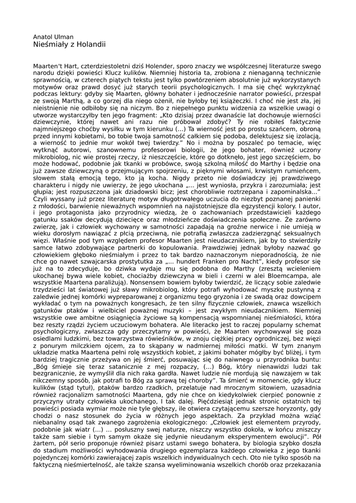 Anatol Ulman Nieśmiały z Holandii Maarten't Hart, czterdziestoletni dziś Holender, sporo znaczy we współczesnej literaturze swego narodu dzięki powieści Klucz kulików. Niemniej historia ta, zrobiona z nienaganną technicznie sprawnością, w czterech piątych tekstu jest tylko powtórzeniem absolutnie już wykorzystanych motywów oraz prawd dosyć już starych teorii psychologicznych. I ma się chęć wykrzyknąć podczas lektury: gdyby się Maarten, główny bohater i jednocześnie narrator powieści, przespał ze swoją Marthą, a co gorzej dla niego ożenił, nie byłoby tej książeczki. I choć nie jest zła, jej nieistnienie nie odbiłoby się na niczym. Bo z niepełnego punktu widzenia za wszelkie uwagi o utworze wystarczyłby ten jego fragment: „Kto dzisiaj przez dwanaście lat dochowuje wierności dziewczynie, której nawet ani razu nie próbował zdobyć? Ty nie robiłeś faktycznie najmniejszego choćby wysiłku w tym kierunku (…) Ta wierność jest po prostu szańcem, obroną przed innymi kobietami, bo tobie twoja samotność całkiem się podoba, delektujesz się izolacją, a wierność to jednie mur wokół twej twierdzy.” No i można by poszaleć po temacie, więc wytknąć autorowi, szanownemu profesorowi biologii, że jego bohater, również uczony mikrobiolog, nic wie prostej rzeczy, iż nieszczęście, które go dotknęło, jest jego szczęściem, bo może hodować, podobnie jak tkanki w probówce, swoją szkolną miłość do Marthy i będzie ona już zawsze dziewczyną o przejmującym spojrzeniu, z pięknymi włosami, krwistym rumieńcem, słowem stałą emocją tego, kto ją kocha. Nigdy przeto nie doświadczy jej prawdziwego charakteru i nigdy nie uwierzy, że jego ukochana „... jest wyniosła, przykra i zarozumiała; jest głupia; jest rozpuszczona jak dziadowski bicz; jest chorobliwie roztrzepana i zapominalska...” Czyli wyssany już przez literaturę motyw długotrwałego uczucia do niezbyt poznanej panienki z młodości, barwienie nieważnych wspomnień na najistotniejsze dla egzystencji kolory. I autor, i jego protagonista jako przyrodnicy wiedzą, że o zachowaniach przedstawicieli każdego gatunku ssaków decydują dziecięce oraz młodzieńcze doświadczenia społeczne. Że zarówno zwierzę, jak i człowiek wychowany w samotności zapadają na groźne nerwice i nie umieją w wieku dorosłym nawiązać z płcią przeciwną, nie potrafią zwłaszcza zadzierzgnąć seksualnych więzi. Właśnie pod tym względem profesor Maarten jest nieudacznikiem, jak by to stwierdziły samce łatwo zdobywające partnerki do kopulowania. Prawdziwiej jednak byłoby nazwać go człowiekiem głęboko nieśmiałym i przez to tak bardzo naznaczonym nieporadnością, że nie chce go nawet szwajcarska prostytutka za „... hundert Franken pro Nacht”, kiedy profesor się już na to zdecyduje, bo dziwka wydaje mu się podobna do Marthy (zresztą wcieleniem ukochanej bywa wiele kobiet, chociażby dziewczyna w bieli i czerni w alei Bloemcampa, ale wszystkie Maartena paraliżują). Nonsensem bowiem byłoby twierdzić, że liczący sobie zaledwie trzydzieści lat światowej już sławy mikrobiolog, który potrafi wyhodować myszkę pustynną z zaledwie jednej komórki wypreparowanej z organizmu tego gryzonia i ze swadą oraz dowcipem wykładać o tym na poważnych kongresach, że ten silny fizycznie człowiek, znawca wszelkich gatunków ptaków i wielbiciel poważnej muzyki – jest zwykłym nieudacznikiem. Niemniej wszystkie owe ambitne osiągnięcia życiowe są kompensacją wspomnianej nieśmiałości, która bez reszty rządzi życiem uczuciowym bohatera. Ale literacko jest to raczej popularny schemat psychologiczny, zwłaszcza gdy przeczytamy w powieści, że Maarten wychowywał się poza osiedlami ludzkimi, bez towarzystwa rówieśników, w znoju ciężkiej pracy ogrodniczej, bez więzi z ponurym milczkiem ojcem, za to skąpany w nadmiernej miłości matki. W tym znanym układzie matka Maartena pełni rolę wszystkich kobiet, z jakimi bohater mógłby być bliżej, i tym bardziej tragicznie przeżywa on jej śmierć, posuwając się do naiwnego u przyrodnika buntu: „Bóg śmieje się teraz satanicznie z mej rozpaczy, (…) Bóg, który nienawidzi ludzi tak bezgranicznie, że wymyślił dla nich raka gardła. Nawet ludzie nie mordują się nawzajem w tak nikczemny sposób, jak potrafi to Bóg za sprawą tej choroby”. Ta śmierć w momencie, gdy klucz kulików (stąd tytuł), ptaków bardzo rzadkich, przelatuje nad mrocznym sitowiem, uzasadnia również racjonalizm samotności Maartena, gdy nie chce on kiedykolwiek cierpieć ponownie z przyczyny utraty człowieka ukochanego, I tak dalej. Pięćdziesiąt jednak stronic ostatnich tej powieści posiada wymiar może nie tyle głębszy, ile otwiera czytającemu szersze horyzonty, gdy chodzi o nasz stosunek do życia w różnych jego aspektach. Za przykład można wziąć niebanalny osąd tak zwanego zagrożenia ekologicznego: „Człowiek jest elementem przyrody, podobnie jak wiatr (…) … posłuszny swej naturze, niszczy wszystko dokoła, w końcu zniszczy także sam siebie i tym samym okaże się jedynie nieudanym eksperymentem ewolucji”. Pół żartem, pół serio proponuje również pisarz ustami swego bohatera, by biologia szybko doszła do stadium możliwości wyhodowania drugiego egzemplarza każdego człowieka z jego tkanki pojedynczej komórki zawierającej zapis wszelkich indywidualnych cech. Oto nie tylko sposób na faktyczną nieśmiertelność, ale także szansa wyeliminowania wszelkich chorób oraz przekazania swemu alter ego życiowych doświadczeń, by popełniał mniej błędów. Duży urok tek książki polega na jej egzotyce. O codziennym bowiem bytowaniu Holendrów, o ich mentalności nie mamy raczej pojęcia, a powieść 't Harta, w całości realistyczna, dostarcza mnóstwa interesujących szczegółów w tym względzie. Jak każdy ambitny pisarz próbował autor Klucza kulików wymyśli