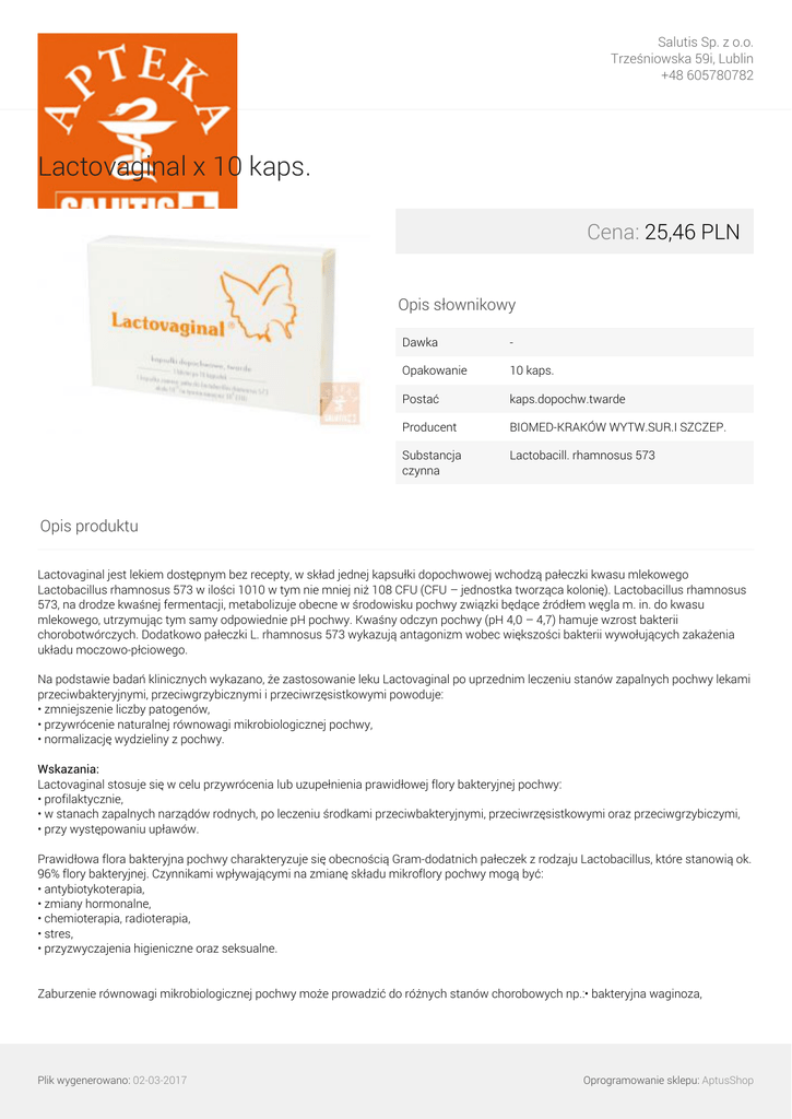 Salutis Sp. z o.o. Trześniowska 59i, Lublin +48 605780782 Lactovaginal x 10 kaps. Cena: 25,46 PLN Opis słownikowy Dawka - Opakowanie 10 kaps. Postać kaps.dopochw.twarde Producent BIOMED-KRAKÓW WYTW.SUR.I SZCZEP. Substancja czynna Lactobacill. rhamnosus 573 Opis produktu Lactovaginal jest lekiem dostępnym bez recepty, w skład jednej kapsułki dopochwowej wchodzą pałeczki kwasu mlekowego Lactobacillus rhamnosus 573 w ilości 1010 w tym nie mniej niż 108 CFU (CFU – jednostka tworząca kolonię). Lactobacillus rhamnosus 573, na drodze kwaśnej fermentacji, metabolizuje obecne w środowisku pochwy związki będące źródłem węgla m. in. do kwasu mlekowego, utrzymując tym samy odpowiednie pH pochwy. Kwaśny odczyn pochwy (pH 4,0 – 4,7) hamuje wzrost bakterii chorobotwórczych. Dodatkowo pałeczki L. rhamnosus 573 wykazują antagonizm wobec większości bakterii wywołujących zakażenia układu moczowo-płciowego. Na podstawie badań klinicznych wykazano, że zastosowanie leku Lactovaginal po uprzednim leczeniu stanów zapalnych pochwy lekami przeciwbakteryjnymi, przeciwgrzybicznymi i przeciwrzęsistkowymi powoduje: • zmniejszenie liczby patogenów, • przywrócenie naturalnej równowagi mikrobiologicznej pochwy, • normalizację wydzieliny z pochwy. Wskazania: Lactovaginal stosuje się w celu przywrócenia lub uzupełnienia prawidłowej flory bakteryjnej pochwy: • profilaktycznie, • w stanach zapalnych narządów rodnych, po leczeniu środkami przeciwbakteryjnymi, przeciwrzęsistkowymi oraz przeciwgrzybiczymi, • przy występowaniu upławów. Prawidłowa flora bakteryjna pochwy charakteryzuje się obecnością Gram-dodatnich pałeczek z rodzaju Lactobacillus, które stanowią ok. 96% flory bakteryjnej. Czynnikami wpływającymi na zmianę składu mikroflory pochwy mogą być: • antybiotykoterapia, • zmiany hormonalne, • chemioterapia, radioterapia, • stres, • przyzwyczajenia higieniczne oraz seksualne. Zaburzenie równowagi mikrobiologicznej pochwy może prowadzić do różnych stanów chorobowych np.:• bakteryjna waginoza, Plik wygenerowano: 02-03-2017 Oprogramowanie sklepu: AptusShop Salutis Sp. z o.o. Trześniowska 59i, Lublin +48 605780782 • grzybica pochwy, • zakażenie bakteriami pochodzącymi z przewodu pokarmowego Sposób użycia: Lactovaginal stosuje się dopochwowo. Najlepsze rezultaty daje stosowanie od 1 do 2 kapsułek na dobę (jedna rano, a druga na noc) przez okres 7 dni. W razie potrzeby leczenie należy powtórzyć. Kapsułkę leku Lactovaginal należy umieścić głęboko w pochwie zachowując zasady higieny osobistej tzn. uprzednie umycie okolic intymnych oraz dokładne umycie rąk. Przed użyciem zapoznaj się z ulotką dołączoną do opakowania, która zawiera wskazania, przeciwwskazania, dane dotyczące działań niepożądanych i dawkowanie oraz informacje dotyczące stosowania i przechowywania produktu leczniczego, bądź skonsultuj się z lekarzem lub farmaceutą, gdyż każdy lek niewłaściwie stosowany zagraża Twojemu życiu lub zdrowiu. Plik wygenerowano: 02-03-2017 Powered by TCPDF (www.tcpdf.org) Oprogramowanie sklepu: AptusShop