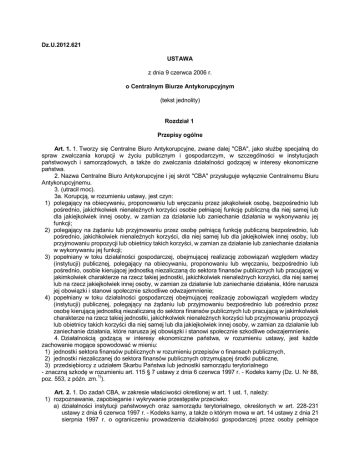 Dz.U.2012.621 USTAWA z dnia 9 czerwca 2006 r. o Centralnym Biurze Antykorupcyjnym (tekst jednolity) Rozdział 1 Przepisy ogólne Art. 1. 1. Tworzy się Centralne Biuro Antykorupcyjne, zwane dalej "CBA", jako służbę specjalną do spraw zwalczania korupcji w życiu publicznym i gospodarczym, w szczególności w instytucjach państwowych i samorządowych, a także do zwalczania działalności godzącej w interesy ekonomiczne państwa. 2. Nazwa Centralne Biuro Antykorupcyjne i jej skrót "CBA" przysługuje wyłącznie Centralnemu Biuru Antykorupcyjnemu. 3. (utracił moc). 3a. Korupcją, w rozumieniu ustawy, jest czyn: 1) polegający na obiecywaniu, proponowaniu lub wręczaniu przez jakąkolwiek osobę, bezpośrednio lub pośrednio, jakichkolwiek nienależnych korzyści osobie pełniącej funkcję publiczną dla niej samej lub dla jakiejkolwiek innej osoby, w zamian za działanie lub zaniechanie działania w wykonywaniu jej funkcji; 2) polegający na żądaniu lub przyjmowaniu przez osobę pełniącą funkcję publiczną bezpośrednio, lub pośrednio, jakichkolwiek nienależnych korzyści, dla niej samej lub dla jakiejkolwiek innej osoby, lub przyjmowaniu propozycji lub obietnicy takich korzyści, w zamian za działanie lub zaniechanie działania w wykonywaniu jej funkcji; 3) popełniany w toku działalności gospodarczej, obejmującej realizację zobowiązań względem władzy (instytucji) publicznej, polegający na obiecywaniu, proponowaniu lub wręczaniu, bezpośrednio lub pośrednio, osobie kierującej jednostką niezaliczaną do sektora finansów publicznych lub pracującej w jakimkolwiek charakterze na rzecz takiej jednostki, jakichkolwiek nienależnych korzyści, dla niej samej lub na rzecz jakiejkolwiek innej osoby, w zamian za działanie lub zaniechanie działania, które narusza jej obowiązki i stanowi społecznie szkodliwe odwzajemnienie; 4) popełniany w toku działalności gospodarczej obejmującej realizację zobowiązań względem władzy (instytucji) publicznej, polegający na żądaniu lub przyjmowaniu bezpośrednio lub pośrednio przez osobę kierującą jednostką niezaliczaną do sektora finansów publicznych lub pracującą w jakimkolwiek charakterze na rzecz takiej jednostki, jakichkolwiek nienależnych korzyści lub przyjmowaniu propozycji lub obietnicy takich korzyści dla niej samej lub dla jakiejkolwiek innej osoby, w zamian za działanie lub zaniechanie działania, które narusza jej obowiązki i stanowi społecznie szkodliwe odwzajemnienie. 4. Działalnością godzącą w interesy ekonomiczne państwa, w rozumieniu ustawy, jest każde zachowanie mogące spowodować w mieniu: 1) jednostki sektora finansów publicznych w rozumieniu przepisów o finansach publicznych, 2) jednostki niezaliczanej do sektora finansów publicznych otrzymującej środki publiczne, 3) przedsiębiorcy z udziałem Skarbu Państwa lub jednostki samorządu terytorialnego - znaczną szkodę w rozumieniu art. 115 § 7 ustawy z dnia 6 czerwca 1997 r. - Kodeks karny (Dz. U. Nr 88, 1) poz. 553, z późn. zm. ). Art. 2. 1. Do zadań CBA, w zakresie właściwości określonej w art. 1 ust. 1, należy: 1) rozpoznawanie, zapobieganie i wykrywanie przestępstw przeciwko: a) działalności instytucji państwowych oraz samorządu terytorialnego, określonych w art. 228-231 ustawy z dnia 6 czerwca 1997 r. - Kodeks karny, a także o którym mowa w art. 14 ustawy z dnia 21 sierpnia 1997 r. o ograniczeniu prowadzenia działalności gospodarczej przez osoby pełniące funkcje publiczne (Dz. U. z 2006 r. Nr 216, poz. 1584, z 2008 r. Nr 223, poz. 1458 oraz z 2009 r. Nr 178, poz. 1375 oraz z 2010 r. Nr 182, poz. 1228), b) wymiarowi sprawiedliwości, określonym w art. 233, wyborom i referendum, określonym w art. 250a, porządkowi publicznemu, określonym w art. 258, wiarygodności dokumentów, określonych w art. 270-273, mieniu, określonym w art. 286, obrotowi gospodarczemu, określonych w art. 296-297, 299 i 305, obrotowi pieniędzmi i papierami wartościowymi, określonym w art. 310 ustawy z dnia 6 czerwca 1997 r. - Kodeks karny, a także o których mowa w art. 585-592 ustawy z dnia 15 września 2000 r. - Kodeks spółek handlowych (Dz. U. Nr 94, poz. 1037, z późn. zm.2)) oraz określonych w art. 179-183 ustawy z dnia 29 lipca 2005 r. o obrocie instrumentami finansowymi (Dz. U. z 2010 r. Nr 211, poz. 1384 oraz z 2011 r. Nr 106, poz. 622, Nr 131, poz. 763 i Nr 234, poz. 1391), jeżeli pozostają w związku z korupcją lub działalnością godzącą w interesy ekonomiczne państwa, c) finansowaniu partii politycznych, określonych w art. 49d i 49f ustawy z dnia 27 czerwca 1997 r. o partiach politycznych (Dz. U. z 2011 r. Nr 155, poz. 924), jeżeli pozostają w związku z korupcją, d) obowiązkom podatkowym i rozliczeniom z tytułu dotacji i subwencji, określonych w rozdziale 6 ustawy z dnia 10 września 1999 r. - Kodeks karny skarbowy (Dz. U. z 2007 r. Nr 111, poz. 765, z 3) późn. zm. ), jeżeli pozostają w związku z korupcją lub działalnością godzącą w interesy ekonomiczne państwa, e) zasadom rywalizacji sportowej, określonych w art. 46-48 ustawy z dnia 25 czerwca 2010 r. o sporcie (Dz. U. Nr 127, poz. 857, z późn. zm.4)), f) obrotowi lekami, środkami spożywczymi specjalnego przeznaczenia żywieniowego, wyrobami medycznymi określonymi w art. 54 ustawy z dnia 12 maja 2011 r. o refundacji leków, środków spożywczych specjalnego przeznaczenia żywieniowego oraz wyrobów medycznych (Dz. U. Nr 122, poz. 696 oraz z 2012 r. poz. 95). - oraz ściganie ich sprawców; 2) ujawnianie i przeciwdziałanie przypadkom nieprzestrzegania przepisów ustawy z dnia 21 sierpnia 1997 r. o ograniczeniu prowadzenia działalności gospodarczej przez osoby pełniące funkcje publiczne; 3) dokumentowanie podstaw i inicjowanie realizacji przepisów ustawy z dnia 21 czerwca 1990 r. o zwrocie korzyści uzyskanych niesłusznie kosztem Skarbu Państwa lub innych państwowych osób prawnych (Dz. U. Nr 44, poz. 255, 