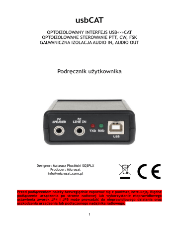 usbCAT OPTOIZOLOWANY INTERFEJS USB<->CAT OPTOIZOLOWANE STEROWANIE PTT, CW, FSK GALWANICZNA IZOLACJA AUDIO IN, AUDIO OUT Podręcznik użytkownika Designer: Mateusz Płociński SQ3PLX Producer: Microsat [email protected] Przed podłączeniem należy bezwzględnie zapoznać się z poniższą instrukcją. Błędne podłączenie urządzenia po stronie radiowej lub wykorzystanie nieprawidłowego ustawienia zworek JP4 i JP5 może prowadzić do nieprawidłowego działania oraz uszkodzenia urządzenia lub podłączonego nadajnika radiowego. 1 Spis treści 1. Parametry techniczne..............................................................................3 2. Opis urządzenia.....................................................................................4 2.1. Sposób podłączenia do PC...................................................................4 2.2. Instalacja sterowników dla systemu Windows............................................4 2.3. Zmiana numerów dla portów COM.........................................................5 2.4. Funkcje portów COM urządzenia...........................................................5 2.5. Złącze urządzenia od strony radia.........................................................6 2.6. Zworki na płytce PCB urządzenia...........................................................7 2 1. Parametry techniczne Wymiary 67x92x28mm Waga 130g Napięcie zasilania 5VDC z portu USB Pobór prądu 30mA z portu USB Temperatura pracy -30°C / +70°C Izolacja audio Galwaniczna (transformator) Izolacja interfejsu CAT Optyczna (transoptor) Izolacja PTT, CW, FSK Optyczna (transoptor) 3 2. Opis urządzenia Urządzenie usbCAT stanowi w pełni izolowany interfejs pozwalający na podłączenie radia do komputera PC. Izolowane są zarówno tory wejść/wyjść audio, jak również port szeregowy i wyjścia PTT, CW, FSK. Masy pomiędzy stroną USB i radiową są również rozdzielone i niezależne od siebie. 2.1. Sposób podłączenia do PC Od strony komputera PC urządzenie usbCAT podłączane jest za pomocą dwóch przewodów mini-jack 3.5mm (dla sygnałów wejścia i wyjścia audio) oraz przewodu USBAB (dla komunikacji szeregowej protokołu CAT i sygnałów sterujących PTT, CW, FSK). Przewód PC Speaker należy podłączyć do wyjścia liniowego karty dźwiękowej, natomiast PC Line IN do wejścia mikrofonowego. Po podłączeniu przewodu USB do komputera usbCAT pojawia się w systemie operacyjnym jako dwa wirtualne porty COM. Dzięki zastosowaniu popularnego układu FT2232D firmy FTDI urządzenie wspierane jest przez systemy operacyjne Windows, MacOS, oraz Linux. 2.2. Instalacja sterowników dla systemu Windows Instalację sterowników najlepiej przeprowadzić przed podłączeniem usbCAT. Jeżeli urządzenie jest już podłączone, należy je odłączyć aby uniknąć problemów podczas instalacji. Sterowniki dostępne na naszej stronie internetowej, na podstronie produktu. Na poniższym rysunku widoczne są dwa wirtualne porty COM urządzenia w systemie Windows XP. 4 2.3. Zmiana numerów dla portów COM Wirtualne porty COM w systemie Windows pojawiają się zazwyczaj na wyższych numerach, w powyższym przypadku są to numery 39 i 40. Dla wielu aplikacji wskazane jest przeniesienie portu na niższy numer, można tego dokonać klikając na dany port w Menedżerze urządzeń, następnie przechodząc do zakładki Ustawienia portu i klikając na przycisk Zaawansowane. Okno zmiany portu pokazano na poniższym rysunku. 2.4. Funkcje portów COM urządzenia Dla domyślnej konfiguracji zworek urządzenia (opis w dalszej części), funkcje portów COM są następujące: • port 1: • RXD – wejście interfejsu szeregowego, • TXD – wyjście interfejsu szeregowego. • port 2: • TXD – sterowanie FSK, • RTS – sterowanie PTT, • DTR – sterowanie CW. 5 2.5. Złącze urządzenia od strony radia Wszystkie sygnały po stronie izolowanej wyprowadzone na złączu DB9 typu męskiego. urządzenia (strona radia) są Opis pinów złącza DB9: Pin 1 – FSK, otwarty kolektor, Pin 2 – CW, otwarty kolektor, Pin 3 – RXD, wejście portu szeregowego, Pin 4 – audio RADIO->PC, Pin 5 – GND, masa, Pin 6 – PTT, otwarty kolektor, Pin 7 – TXD, wyjście portu szeregowego, Pin 8 – wejście zasilania strony izolowanej (radiowej), należy podłączyć zasilanie 12VDC, Pin 9 – audio PC->RADIO. 6 2.6. Zworki na płytce PCB urządzenia W celu zapewnienia zgodności z wieloma standardami i sposobami podłączeń różnych nadajników radiowych, nieuniknione stało się zastosowanie zworek dostępnych dla użytkownika. W celu dotarcia do nich konieczne jest otwarcie obudowy urządzenia po odkręceniu czterech śrub na spodzie obudowy. Opis zworek urządzenia: • JP1 w pozycji prawej (domyślne) – RTS i CTS portu 1 w pozycji rozwartej, • JP1 w pozycji lewej – RTS i CTS portu 1 w pozycji zwartej – wykorzystywane dla niektórych urządzeń jako emulacja sprzętowej kontroli transmisji, • JP2 w pozycji prawej (domyślne) – PTT podłączone do sygnału RTS portu 2, • JP2 w pozycji lewej – PTT podłączone do sygnału RTS portu 1, • JP3 w pozycji prawej (domyślne) – CW podłączone do sygnału DTR portu 2, • JP3 w pozycji lewej – CW podłączone do sygnału DTR portu 1, • JP4 w pozycji prawej – RXD w standardzie napięć RS232 (-12V - 12V), • JP4 w pozycji lewej – RXD w standardzie napięć TTL (0V – 5V), • JP5 w pozycji prawej – TXD w standardzie napięć RS232 (-12V – 12V), • JP5 w pozycji lewej – TXD w standardzie napięć TTL (0 – 5V). Przed podłączeniem urządzenia należy upewnić się, czy ustawienia zworek JP4 i JP5 są zgodne ze standardem portu szeregowego podłączanego nadajnika radiowego. 7
