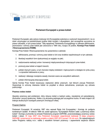 Parlament Europejski a prawa kobiet Parlament Europejski, jako jedyna instytucja Unii Europejskiej wyłaniana w wyborach bezpośrednich i na co dzień utrzymująca za pośrednictwem posłów bliski kontakt z obywatelami, jest szczególnie wyczulona na prawa człowieka, w tym prawa kobiet. "Siłą napędową" Parlamentu Europejskiego w zakresie definiowania, promowania i ochrony praw kobiet jest utworzona w 1984 roku, licząca 35 posłów, Komisja Praw Kobiet i Równouprawnienia (FEMM). Komisja Praw Kobiet i Równouprawnienia ma uprawnienia w zakresie: 1. definiowania, promocji i ochrony praw kobiet w Unii oraz środków wspólnotowych w tym zakresie; 2. likwidacji wszelkich form dyskryminacji ze względu na płeć; 3. nadzorowania realizacji umów i konwencji międzynarodowych dotyczących praw kobiet; 4. promocji praw kobiet w krajach trzecich; 5. polityki równych szans, w tym równości między kobietami i mężczyznami w dostępie do rynku pracy i w sposobie traktowania w pracy; 6. realizacji i dalszego rozwijania zasady równości szans we wszystkich sektorach; 7. polityki informacyjnej dotyczącej kobiet. Opinia Komisji Praw Kobiet towarzyszy większości aktów prawnych, nad którymi pracuje Parlament. Gwarantuje to ochronę interesów kobiet na przykład w sferze zatrudnienia, przemysłu czy zdrowia publicznego. Przemoc wobec kobiet Zjawisko przemocy jest problemem, który dotyczy kobiet w każdym wieku, niezależnie od wykształcenia, dochodów i pozycji społecznej. Walka z tą ukrywaną patologią jest szczególnie trudna. W wielu krajach UE brakuje skutecznych rozwiązań prawnych chroniących ofiarę. Program Daphne Parlament Europejski 16 września 1997 roku wezwał Radę Unii Europejskiej i Komisję do podjęcia konkretnych działań. W efekcie 1999 rok został ogłoszony "Europejskim Rokiem walki z przemocą wobec kobiet". Komisja uruchomiła na wniosek Parlamentu program DAPHNE, przeciwdziałający przemocy wobec kobiet i dzieci. W maju 2007 roku Parlament Europejski zaaprobował realizacje III etapu programu DAPHNE i przeznaczył na realizację projektu w latach 2007-2013 ponad 116 mln euro. Do najważniejszych celów Programu należą m.in.: walka z wszelkimi formami przemocy i zapewnienie wsparcia ofiarom przemocy i grupom ryzyka. Jednym z podstawowych elementów programu Daphne III jest wspieranie podmiotów realizujących jego cele w zakresie zapobiegania i zwalczania przemocy wobec dzieci, młodzieży i kobiet oraz pomocy ofiarom m.in. poprzez udzielanie dotacji operacyjnych oraz dotacji na konkretne projekty ponadnarodowe leżące w interesie UE. W lutym 2007 r. Parlament Europejski przyjął sprawozdanie w którym zaapelował o przyjęcie postawy „zero tolerancji” wobec zjawiska przemocy. Celem działań Parlamentu jest podniesienie świadomości społecznej w odniesieniu do tego problemu. By zmniejszyć przemoc domową potrzebna jest zmiana prawa. Dlatego posłowie zaapelowali do rządów państw członkowskich o uznanie przemocy seksualnej i gwałtu w małżeństwie za przestępstwo. Parlament chce zagwarantowania ofiarom przemocy bezpiecznego dostępu do policji, prokuratury i sądów oraz skutecznej egzekucji prawa. Dzieci będące świadkami przemocy wobec swoich matek powinny także zostać uznane za ofiary przemocy. W rezolucji w sprawie równouprawnienia kobiet i mężczyzn w Unii Europejskiej przyjętej we wrześniu 2007 r., Parlament Europejski zażądał gwarancji przestrzegania równouprawnienia płci i ograniczenia przypadków dyskryminacji kobiet. Handel kobietami Powszechna Deklaracja Praw Człowieka z 1948 roku głosi, że "nie wolno nikogo czynić niewolnikiem, ani nakładać na nikogo służebności; niewolnictwo i handel niewolnikami są zakazane we wszelkich postaciach". Karta Praw Podstawowych Unii Europejskiej stwierdza: "Handel ludźmi jest zakazany". Państwa Unii Europejskiej uzgodniły ramowe decyzje o walce z handlem ludźmi oraz z wykorzystaniem seksualnym dzieci i z pornografia dziecięcą. Przyjęto dyrektywę pozwalająca przyznawać zezwolenia na krótki pobyt na terenie UE ofiarom handlu ludźmi, które współpracują od odpowiednimi władzami. Finansowany ze środków unijnych program AGIS wspiera współpracę państw członkowskich w walce z handlem ludźmi w celach seksualnych, a program Daphne III - w walce z przemocą wobec kobiet i dzieci. Brak jednak unijnych przepisów odnoszących się szczegółowo do handlu kobietami w celach seksualnych. Przepisy narodowe i działania poszczególnych członków Unii w tej dziedzinie znacząco różnią się, z czego korzystają organizacje przestępcze. Problem handlu kobietami, w tym także w celach seksualnych, narasta. Parlament Europejski od lat zwraca uwagę na ten problem i nalega aby państwa członkowskie zwalczały go skuteczniej, bardziej stanowczo i w sposób lepiej skoordynowany. W styczniu 2006 roku Parlament Europejski uznał handel kobietami za jedną z form przestępczości zorganizowanej. Posłowie do Parlamentu Europejskiego przyjęli zapis pozwalający na ściganie osób, które świadomie korzystają z usług kobiet przymuszanych do prostytucji. Zdaniem Parlamentu Europejskiego, państwa członkowskie powinny uchwalić przepisy, które usprawnią ściganie i karanie handlarzy, ich wspólników, autorów stron internetowych ogłaszających usługi pośrednictwa w handlu ludźmi, osób zachęcających, organizujących lub korzystających z usług seksualnych małoletnich, a także do ścigania osób trudniących się praniem brudnych pieniędzy pochodzących z tego handlu. Przymusowa prostytucja Parlament Europejski zorganizował 8 marca 2006 r. w Brukseli konferencję poświęconą zjawiskom handlu ludźmi i przymusowej prostytucji w czasie światowych imprez sportowych. Komisja parlamentarna FEMM wskazała, że światowe imprezy sportowe, wystawy i kongresy powodują zwiększony popyt na prostytucję i usługi seksualne. Większość kobiet świadczących te u