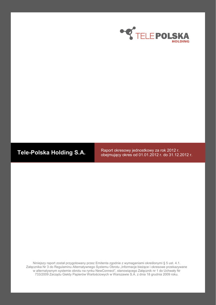 Tele-Polska Holding S.A. Raport okresowy jednostkowy za rok 2012 r. obejmujący okres od 01.01.2012 r. do 31.12.2012 r. Niniejszy raport został przygotowany przez Emitenta zgodnie z wymaganiami określonymi § 5 ust. 4.1. Załącznika Nr 3 do Regulaminu Alternatywnego Systemu Obrotu „Informacje bieżące i okresowe przekazywane w alternatywnym systemie obrotu na rynku NewConnect”, stanowiącego Załącznik nr 1 do Uchwały Nr 733/2009 Zarządu Giełdy Papierów Wartościowych w Warszawie S.A. z dnia 18 grudnia 2009 roku. Niniejszy raport zawiera 1. Pismo Zarządu .................................................................................................................................... 3 2. Wybrane dane jednostkowego sprawozdania finansowego .............................................................. 5 3. Oświadczenia Zarządu Tele-Polska Holding S.A. ............................................................................... 6 4. Roczne jednostkowe sprawozdanie finansowe ................................................................................... 8 5. Sprawozdanie Zarządu na temat działalności Emitenta ..................................................................... 8 6. Opinia i raport biegłego rewidenta ....................................................................................................... 8 7. Oświadczenie w przedmiocie przestrzegania „Dobrych Praktyk” ....................................................... 8 2013-04-24 Strona | 2 z 9 Raport okresowy roczny jednostkowy 1. Pismo Zarządu Szanowni Akcjonariusze, Miniony rok Grupa Kapitałowa Tele-Polska Holding S.A. (GK TPH) zakończyła z sukcesem, osiągając historyczne rekordy sprzedaży oraz najważniejszych wyników finansowych. Sprzedaż rok do roku zwiększyła się o 35% i osiągnęła wartość 211 mln zł. Wynik operacyjny powiększony o amortyzacje (EBITDA) zwiększył się o 112% i osiągnął wartość 13,6 mln zł, zaś zysk netto o 83% i wyniósł 5,2 mln zł. Sytuacja finansowa GK TPH wzmocniła się, jest stabilna i powinna się poprawiać w nadchodzących latach. Skuteczność wdrożonej w 2010 roku strategii, doskonale funkcjonujący model biznesowy w segmencie detalicznym, utrzymanie mocnej pozycji w segmencie usług hurtowych oraz pozytywne doświadczenia z 2011 roku, sprawiły, iż Grupa zdecydowała się na stosowanie dźwigni finansowej w większym zakresie niż dotychczas. Stanowi to istotną zmianę w dotychczasowej konserwatywnej polityce finansowej ograniczającej korzystanie z finansowania zewnętrznego. Efekty tego zabiegu są bardzo satysfakcjonujące. Rentowność kapitałów własnych Grupy (ROE) przekroczyła poziom 12% co oznacza wzrost rok do roku o 62% i co jest jednym z najlepszych wyników spośród operatorów telekomunikacyjnych notowanych na GPW. W tym samy czasie wielu konkurentów zanotowało spadki przychodów oraz wyników finansowych a niektórzy zmuszeni byli do rewizji polityki dywidendowej. Tym bardziej warto podkreślić, że dobre wyniki GK TPH zostały osiągnięte w niesprzyjających warunkach rynkowych. Nie jest to jednak jednorazowa poprawa, gdyż Grupa konsekwentnie w ostatnich latach poprawia swoją kondycję finansową oraz pozycje rynkową, i wiele wskazuje na to, że tendencja ta zostanie utrzymana. W wymiarze operacyjnym nie nastąpiły żadne wydarzenia odmienne od planowanych i zapowiadanych jeszcze w 2011 roku. Grupa przede wszystkim sukcesywnie i z determinacją umacnia swoja pozycję w segmencie detalicznym oraz poprawia rentowność wszędzie tam, gdzie jest to obecnie możliwe. Konsekwentnie także zrywa z wizerunkiem operatora hurtowego stabilizując swoje przychody poprzez dywersyfikację ich źródeł. W minionym roku Grupa znacząco powiększyła swoją bazę abonentów indywidualnych o kilkadziesiąt tysięcy klientów, jak również pozyskała kilkudziesięciu klientów biznesowych. Pomimo dużego zaangażowania kapitałów w rozbudowę bazy abonenckiej, poprawiła rentowność rok do roku o 36%. Ma to związek zarówno z utrzymaniem marż, zwiększeniem skali działalności i obniżką kosztów jednostkowych, jak i sprawną kontrolą kosztów operacyjnych w obrębie całej Grupy. Model „lekkiego operatora” w jakim obecnie działa Grupa na niepewnym i zmiennym obecnie rynku telekomunikacyjnym daje wiele korzyści a wielkość grupy, daje zarówno podstawy do rozwoju, jak i chroni przed wieloma negatywnymi tendencjami na rynku. Grupa nie posiadając dużej infrastruktury sieciowej nie ponosi kosztów jej utrzymania i nie ma konieczności jej modernizacji. Minimalne wydatki marketingowe czy outsourcing znacznej części sprzedaży, pozwalają na oszczędności które stanowią o przewadze konkurencyjnej oraz którymi Grupa może dzielić się ze swoimi abonentami. Jednakże wraz ze wzrostem bazy abonenckiej oraz potrzebą poszerzenia oferty, Grupa zamierza jednak selektywnie inwestować w rozwój własnego zaplecza technicznego związanego nie tylko z obsługą dotychczasowych klientów ale przede wszystkim w celu świadczenia nowych usług. Sytuacja sektora telekomunikacyjnego w minionym roku nie była pozytywna, choć jak pokazuje przykład GK TPH nie przeszkodziła ona osiągać zamierzonych celów. Możemy mówić o takich tendencjach jak spadek wartości oraz liczby abonentów telefonii stacjonarnej, postępujące obniżki stawek MTR, rozwój technologii LTE, pakietyzacja usług, konieczność dużych inwestycji infrastrukturalnych największych telekomów, postępującą konsolidacja a także pogłębiający się brak stabilności biznesu operatorów (umowy na czas nieokreślony, wojny cenowe, pakiety no limits) oraz coraz słabszą skuteczność dotychczasowych modeli biznesowych. Z perspektywy GK TPH rynkowa sytuacja nie jest przyczyną troski ale wręcz przeciwnie. Dostrzegamy bowiem wielką szansę dla naszego biznesu i dla naszych akcjonariuszy. Spadek telefonii stacjonarnej nie musi przekł
