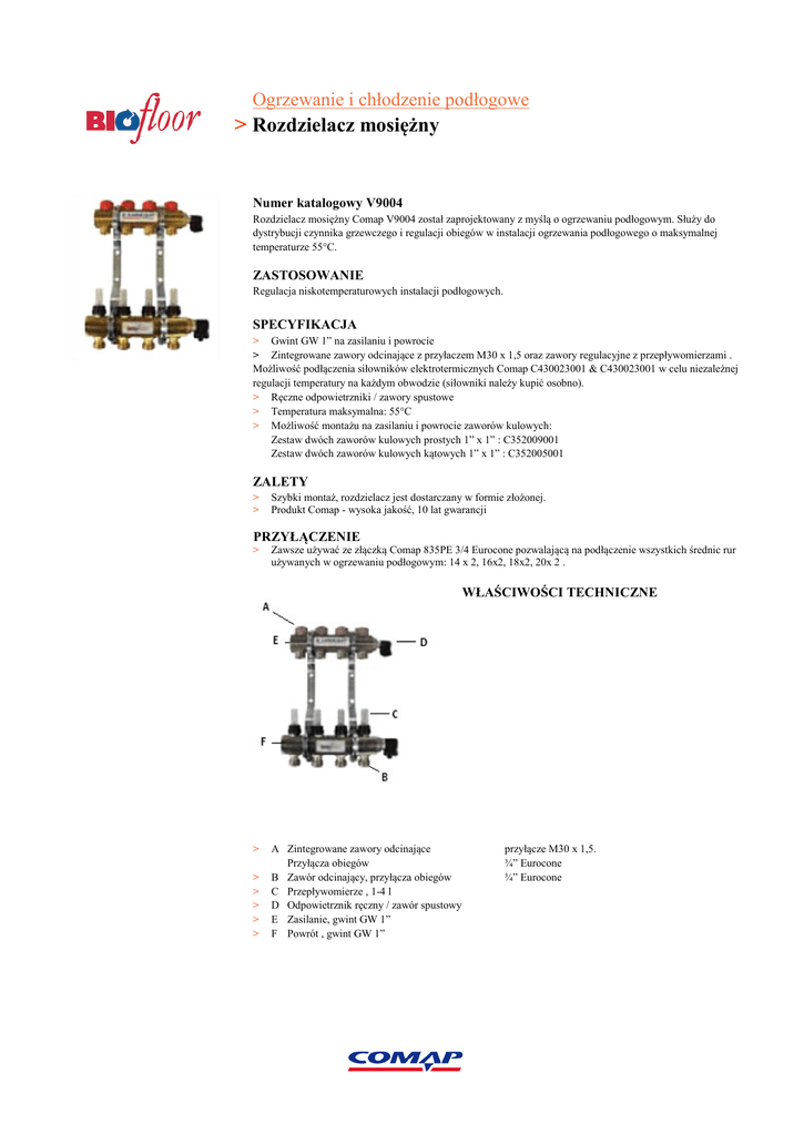 Ogrzewanie i chłodzenie podłogowe > Rozdzielacz mosiężny Numer katalogowy V9004 Rozdzielacz mosiężny Comap V9004 został zaprojektowany z myślą o ogrzewaniu podłogowym. Służy do dystrybucji czynnika grzewczego i regulacji obiegów w instalacji ogrzewania podłogowego o maksymalnej temperaturze 55°C. ZASTOSOWANIE Regulacja niskotemperaturowych instalacji podłogowych. SPECYFIKACJA > Gwint GW 1” na zasilaniu i powrocie > Zintegrowane zawory odcinające z przyłaczem M30 x 1,5 oraz zawory regulacyjne z przepływomierzami . Możliwość podłączenia siłowników elektrotermicznych Comap C430023001 & C430023001 w celu niezależnej regulacji temperatury na każdym obwodzie (siłowniki należy kupić osobno). > Ręczne odpowietrzniki / zawory spustowe > Temperatura maksymalna: 55°C > Możliwość montażu na zasilaniu i powrocie zaworów kulowych: Zestaw dwóch zaworów kulowych prostych 1” x 1” : C352009001 Zestaw dwóch zaworów kulowych kątowych 1” x 1” : C352005001Series ZALETY > > Szybki montaż, rozdzielacz jest dostarczany w formie złożonej. Produkt Comap - wysoka jakość, 10 lat gwarancji PRZYŁĄCZENIE > Zawsze używać ze złączką Comap 835PE 3/4 Eurocone pozwalającą na podłączenie wszystkich średnic rur używanych w ogrzewaniu podłogowym: 14 x 2, 16x2, 18x2, 20x 2 . WŁAŚCIWOŚCI TECHNICZNE > > > > > > A Zintegrowane zawory odcinające Przyłącza obiegów B Zawór odcinający, przyłącza obiegów C Przepływomierze , 1-4 l D Odpowietrznik ręczny / zawór spustowy E Zasilanie, gwint GW 1” F Powrót , gwint GW 1” przyłącze M30 x 1,5. ¾” Eurocone ¾” Eurocone Ogrzewanie i chłodzenie podłogowe > Rozdzielacz mosiężny WYMIARY & SZAFKI ROZDZIELACZOWE > Rozdzielacz mosiężny można zamontować w szafkach V9016 i V9018. Montażu dokonuje się za pomocą fabrycznie wywierconych otworów w uchwycie montażowym. Kod produktu Liczba obwodów Długość (mm) Głębokoś ć (mm) Wysokość (mm) Pasujące szafki V9018 Pasujące szafki V9016 C311012001 2 155 90 330 C240007001 C240001001 C311013001 3 205 90 330 C240007001 C240001001 C311014001 4 255 90 330 C240007001 C240001001 C311015001 5 305 90 330 C240007001 C240001001 C311016001 6 355 90 330 C240007001 C240001001 C311017001 7 405 90 330 C240008001 C240002001 C311018001 8 455 90 330 C240008001 C240002001 C311019001 9 505 90 330 C240009001 C240003001 C311020001 10 555 90 330 C240009001 C240003001 C311021001 11 605 90 330 C240009001 C240003001 C311022001 12 655 90 330 C240010001 C240004001 DOSTĘPNE AKCESORIA > Zestaw dwóch zaworów kulowych prostych 1” x 1” : > Zestaw dwóch zaworów kulowych kątowych 90° 1” x 1” C352009001 C352005001Series OSOBNA REGULACJA TEMPERATURY W KAŻDYM POMIESZCZENIU > Za pomocą siłowników elektrotermicznych z gwintem mocującym M30x1,5 . > Comap oferuje system sterowania ogrzewaniem podłogowym. W celu uzyskania dalszych informacji, skorzystaj z katalogu, strony internetowej, bądź skontaktuj się z dystrybutorem system Comap Biofloor. COMAP Polska Sp.z o.o. ul.Annopol 4a hala C 03-236 Warszawa Tel: (48) 22 6790025 Fax : (48) 22 6791848 E-mail: [email protected] www.comap.pl Ogrzewanie i chłodzenie podłogowe > Rozdzielacz mosiężny CHARAKTERYSTYKA HYDRAULICZNA Spadek ciśnienia na zaworze P [Pa] > Charakterystyka hydrauliczna zaworów regulacyjnych na dolnej belce rozdzielacza COMAP Polska Sp.z o.o. ul.Annopol 4a hala C 03-236 Warszawa Tel: (48) 22 6790025 Fax : (48) 22 6791848 E-mail: [email protected] www.comap.pl Przepływ przez zawór Q (l/h)
