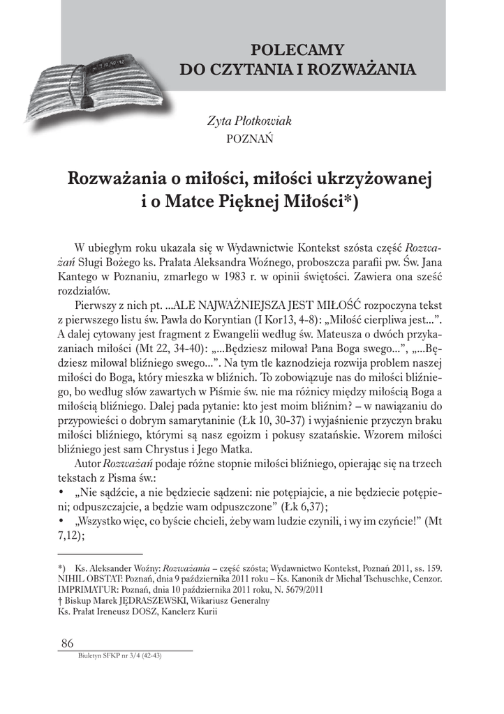 Polecamy do czytania i rozważania Zyta Płotkowiak Poznań Rozważania o miłości, miłości ukrzyżowanej i o Matce Pięknej Miłości*) W ubiegłym roku ukazała się w Wydawnictwie Kontekst szósta część Rozważań Sługi Bożego ks. Prałata Aleksandra Woźnego, proboszcza parafii pw. Św. Jana Kantego w Poznaniu, zmarłego w 1983 r. w opinii świętości. Zawiera ona sześć rozdziałów. Pierwszy z nich pt. ...ALE NAJWAŻNIEJSZA JEST MIŁOŚĆ rozpoczyna tekst z pierwszego listu św. Pawła do Koryntian (I Kor13, 4-8): „Miłość cierpliwa jest...”. A dalej cytowany jest fragment z Ewangelii według św. Mateusza o dwóch przykazaniach miłości (Mt 22, 34-40): „...Będziesz miłował Pana Boga swego...”, „...Będziesz miłował bliźniego swego...”. Na tym tle kaznodzieja rozwija problem naszej miłości do Boga, który mieszka w bliźnich. To zobowiązuje nas do miłości bliźniego, bo według słów zawartych w Piśmie św. nie ma różnicy między miłością Boga a miłością bliźniego. Dalej pada pytanie: kto jest moim bliźnim? – w nawiązaniu do przypowieści o dobrym samarytaninie (Łk 10, 30-37) i wyjaśnienie przyczyn braku miłości bliźniego, którymi są nasz egoizm i pokusy szatańskie. Wzorem miłości bliźniego jest sam Chrystus i Jego Matka. Autor Rozważań podaje różne stopnie miłości bliźniego, opierając się na trzech tekstach z Pisma św.: • „Nie sądźcie, a nie będziecie sądzeni: nie potępiajcie, a nie będziecie potępieni; odpuszczajcie, a będzie wam odpuszczone” (Łk 6,37); • „Wszystko więc, co byście chcieli, żeby wam ludzie czynili, i wy im czyńcie!” (Mt 7,12); *) Ks. Aleksander Woźny: Rozważania – część szósta; Wydawnictwo Kontekst, Poznań 2011, ss. 159. NIHIL OBSTAT: Poznań, dnia 9 października 2011 roku – Ks. Kanonik dr Michał Tschuschke, Cenzor. IMPRIMATUR: Poznań, dnia 10 października 2011 roku, N. 5679/2011 † Biskup Marek JĘDRASZEWSKI, Wikariusz Generalny Ks. Prałat Ireneusz DOSZ, Kanclerz Kurii 86 Biuletyn SFKP nr 3/4 (42-43) • „Przykazanie nowe daję wam, abyście się wzajemnie miłowali, tak jak Ja was umiłowałem; żebyście i wy tak się miłowali wzajemnie” (J 13, 34), kończąc cytatem z Ewangelii św. Mateusza: „... Zaprawdę powiadam wam: Wszystko czego nie uczyniliście jednemu z tych najmniejszych, tegoście i Mnie nie uczynili” (Mt 25, 45). Następnie podejmuje trudny temat miłości do nieprzyjaciół, która wymaga przezwyciężenia siebie i jest wielką mądrością życiową: „A Ja wam powiadam: Miłujcie waszych nieprzyjaciół i módlcie się za tych, którzy was prześladują” (Mt 5, 44). Drugi rozdział pt. MIŁOŚĆ UKRZYŻOWANA obejmuje sześć nauk: Jezu, kochamy Cię bezgranicznie; Oddać się na ślepo; Możesz czynić ze mną, co chcesz; Naucz nas milczeć; „Któż z was dowiedzie mi grzechu?”; Miłość ukrzyżowana. Kaznodzieja rozważa w nich życie, nauczanie i Mękę Pana Jezusa, a także boleść Jego Matki. Nauki zebrane w rozdziale pt. MATKA PIĘKNEJ MIŁOŚCI pochodzą z 1974 roku. W pierwszej z nich pt. „Podwojona miłość”, Kapłan mówi o potrzebie coraz większej miłości Boga i bliźniego. Wskazuje na rolę Maryi w zrozumieniu miłości Jej Syna do nas, a także tajemnicy Jego Męki, Śmierci i Zmartwychwstania. Pragnie Ona, abyśmy stali się gorliwsi w wypełnianiu woli Boga i abyśmy bardziej byli wyrozumiali w stosunku do naszych bliźnich, szczególnie ich słabości, a także abyśmy chcieli okazywać im miłość, mimo napotykanych wielu trudności w naszym zwyczajnym, codziennym życiu. Kochać Boga to znaczy przyjmować wszelkie doświadczenia życiowe bez narzekania. Trzeba spokojnie zgadzać się z wolą Boga i ją wypełniać. W stosunkach z bliźnimi trzeba wykorzystywać każdą okazję, aby im być pomocnym. W takiej postawie musimy liczyć na Boga i ufać Mu, że podołamy tej „podwojonej miłości”. Z braku miłości z naszej strony i okazywania jej innym może wynikać brak zadowolenia ze swojego życia. Będąc bardzo zaangażowanym w służbie bliźnim nie musimy rezygnować z jakichkolwiek przyjemności (Rezygnować z przyjemności?). Każda naturalna przyjemność pochodzi od Boga. Jest to nagroda za dobre życie. Wśród przyjemności ks. Aleksander WOŹNY wymienia przykładowo: • pokonywanie trudności natury fizycznej, jak np. uprawianie wspinaczki wysokogórskiej, samotne wyprawy lądem i morzem, zespołowe gry sportowe; • zdobywanie wiedzy, poznawanie praw i tajemnic przyrody, czytanie książek; • przezwyciężanie pokus, moralne oczyszczenie siebie przez spowiedź św., pokutę; • właściwe wykonywanie obowiązków rodzinnych i zawodowych. Jednak przyjemność nie może rządzić naszym życiem, ale rozum i sumienie. Szukanie przyjemności nie może być celem samym w sobie. To sprzeciwia się miłości Boga i bliźniego. luty – sierpień 2012 87 Ostatnia nauka w tym rozdziale nosi tytuł „Zwyczajnie” i dotyczy naszego zwyczajnego życia na wzór życia Świętej Rodziny w Nazarecie. Mamy więc codziennie okazywać miłość i miłością przezwyciężać wszystkie trudności i bardzo trudne sytuacje. Pan Jezus nam pomoże, bo On jest zawsze z nami. Rozdział pt. BÓG, LUDZIE, ŚWIAT zawiera trzy nauki: Prawda nas wyzwoli; ...jak Ja was umiłowałem... i Najpierw królestwo Boże, w których Kapłan przypomina, że obowiązkiem naszym jest okazywanie miłości Bogu, Najlepszemu Ojcu, bez stawiania żadnych warunków. Istnieje jednak wiele trudności zewnętrznych i wewnętrznych, które oddalają nas od Boga. Mogą to być pewne osoby lub sytuacje życiowe, a także nasza skłonność do lęku, obawa przed ludźmi, przed ich oceną. Do pokonania tych wszystkich trudności potrzebna jest nam łaska Boża, na którą możemy liczyć zawsze, gdyż Bóg jest Miłością i nią nas stale obdarza. Dla nas też stworzył ten piękny, pełen harmonii świat. Lecz człowiek 