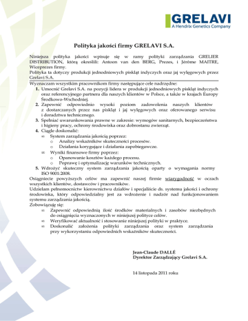 Polityka jakości firmy GRELAVI S.A. Niniejsza polityka jakości wpisuje się w ramy polityki zarządzania GRELIER DISTRIBUTION, którą określili: Antoon van den BERG, Prezes, i Jérôme MAITRE, Wiceprezes firmy. Polityka ta dotyczy produkcji jednodniowych piskląt indyczych oraz jaj wylęgowych przez Grelavi S.A. Wyznaczam wszystkim pracownikom firmy następujące cele nadrzędne: 1. Umocnić Grelavi S.A. na pozycji lidera w produkcji jednodniowych piskląt indyczych oraz referencyjnego partnera dla naszych klientów w Polsce, a także w krajach Europy Środkowo-Wschodniej. 2. Zapewnić odpowiednio wysoki poziom zadowolenia naszych klientów z dostarczanych przez nas piskląt i jaj wylęgowych oraz oferowanego serwisu i doradztwa technicznego. 3. Spełniać uwarunkowania prawne w zakresie: wymogów sanitarnych, bezpieczeństwa i higieny pracy, ochrony środowiska oraz dobrostanu zwierząt. 4. Ciągle doskonalić: • System zarządzania jakością poprzez: o Analizy wskaźników skuteczności procesów. o Działania korygujące i działania zapobiegawcze. • Wyniki finansowe firmy poprzez: o Opanowanie kosztów każdego procesu. o Poprawę i optymalizację warunków technicznych. 5. Wdrożyć skuteczny system zarządzania jakością oparty o wymagania normy ISO 9001:2008. Osiągniecie powyższych celów ma zapewnić naszej firmie wiarygodność w oczach wszystkich klientów, dostawców i pracowników. Udzielam pełnomocnictw kierownictwu działów i specjaliście ds. systemu jakości i ochrony środowiska, który odpowiedzialny jest za wdrożenie i nadzór nad funkcjonowaniem systemu zarządzania jakością. Zobowiązuję się: • Zapewnić odpowiednią ilość środków materialnych i zasobów niezbędnych do osiągnięcia wyznaczonych w niniejszej polityce celów. • Weryfikować aktualność i stosowanie niniejszej polityki w praktyce. • Doskonalić założenia polityki zarządzania oraz system zarządzania przy wykorzystaniu odpowiednich wskaźników skuteczności. Jean-Claude DALLÉ Dyrektor Zarządzający Grelavi S.A. 14 listopada 2011 roku
