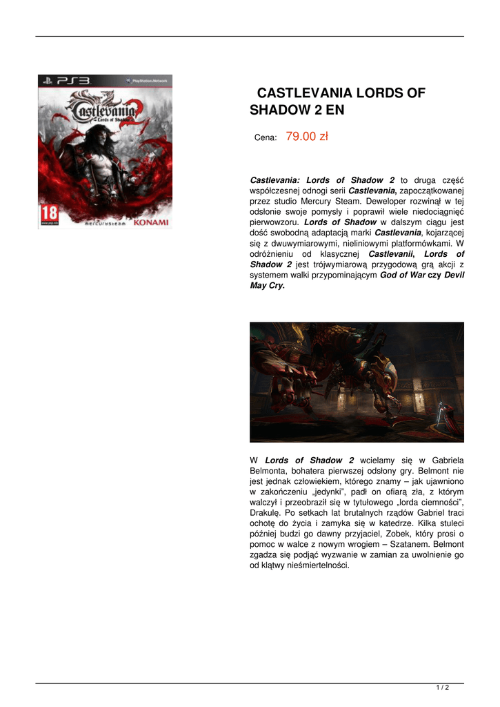 CASTLEVANIA LORDS OF SHADOW 2 EN Cena: 79.00 zł Castlevania: Lords of Shadow 2 to druga część współczesnej odnogi serii Castlevania, zapoczątkowanej przez studio Mercury Steam. Deweloper rozwinął w tej odsłonie swoje pomysły i poprawił wiele niedociągnięć pierwowzoru. Lords of Shadow w dalszym ciągu jest dość swobodną adaptacją marki Castlevania, kojarzącej się z dwuwymiarowymi, nieliniowymi platformówkami. W odróżnieniu od klasycznej Castlevanii, Lords of Shadow 2 jest trójwymiarową przygodową grą akcji z systemem walki przypominającym God of War czy Devil May Cry. W Lords of Shadow 2 wcielamy się w Gabriela Belmonta, bohatera pierwszej odsłony gry. Belmont nie jest jednak człowiekiem, którego znamy – jak ujawniono w zakończeniu „jedynki”, padł on ofiarą zła, z którym walczył i przeobraził się w tytułowego „lorda ciemności”, Drakulę. Po setkach lat brutalnych rządów Gabriel traci ochotę do życia i zamyka się w katedrze. Kilka stuleci później budzi go dawny przyjaciel, Zobek, który prosi o pomoc w walce z nowym wrogiem – Szatanem. Belmont zgadza się podjąć wyzwanie w zamian za uwolnienie go od klątwy nieśmiertelności. 1/2 Lords of Shadow 2 stanowi rozwinięcie pomysłów z pierwszej gry i w większym stopniu przypomina starsze odsłony Castlevanii. W skórze Gabriela przemierzamy dwie równoległe rzeczywistości: futurystyczne, mroczne miasto oraz średniowieczny, gotycki zamek. W obu wymiarach walczymy z potworami, zdobywamy przedmioty, rozwiązujemy łamigłówki i poznajemy wątki fabularne. Tym razem autorzy zbudowali bardziej otwarty świat, zawierający więcej sekretów. Gra nie składa się więc tylko z liniowych lokacji, ale też miejsc, do których warto wrócić po zdobyciu dodatkowych mocy. Ciekawym dodatkiem jest wykorzystanie rozmaitych właściwości Drakuli. Belmont może na przykład zamieniać się w szczura, by omijać zamknięte drzwi lub przejmować kontrolę nad innymi postaciami. Zobacz wideo: Szczegóły wersja językowa ANGIELSKA 2/2 Powered by TCPDF (www.tcpdf.org)