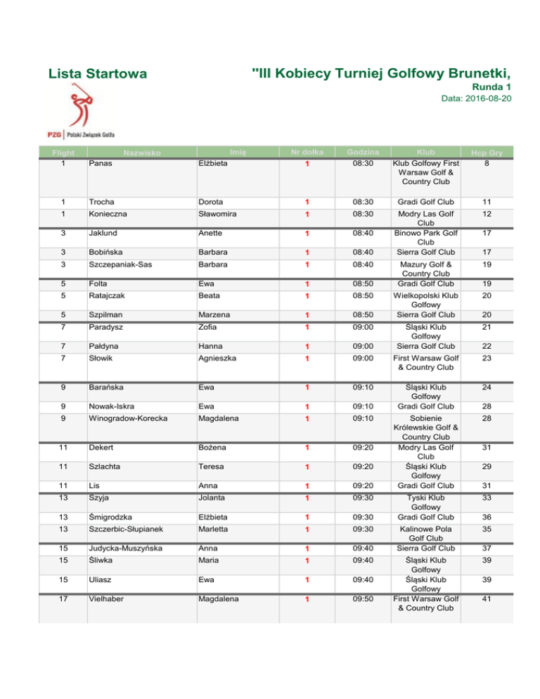 ''III Kobiecy Turniej Golfowy Brunetki, Lista Startowa Runda 1 Data: 2016-08-20 Imię Nr dołka 1 Godzina 08:30 Klub Klub Golfowy First Warsaw Golf & Country Club Hcp Gry 8 Dorota 1 08:30 Gradi Golf Club 11 Konieczna Sławomira 1 08:30 12 3 Jaklund Anette 1 08:40 3 Bobińska Barbara 1 08:40 Modry Las Golf Club Binowo Park Golf Club Sierra Golf Club 3 Szczepaniak-Sas Barbara 1 08:40 19 5 Folta Ewa 1 08:50 Mazury Golf & Country Club Gradi Golf Club 5 Ratajczak Beata 1 08:50 20 5 Szpilman Marzena 1 08:50 Wielkopolski Klub Golfowy Sierra Golf Club 7 Paradysz Zofia 1 09:00 21 7 Pałdyna Hanna 1 09:00 Śląski Klub Golfowy Sierra Golf Club 7 Słowik Agnieszka 1 09:00 First Warsaw Golf & Country Club 23 9 Barańska Ewa 1 09:10 24 9 Nowak-Iskra Ewa 1 09:10 Śląski Klub Golfowy Gradi Golf Club 9 Winogradow-Korecka Magdalena 1 09:10 28 11 Dekert Bożena 1 09:20 11 Szlachta Teresa 1 09:20 11 Lis Anna 1 09:20 Sobienie Królewskie Golf & Country Club Modry Las Golf Club Śląski Klub Golfowy Gradi Golf Club 13 Szyja Jolanta 1 09:30 33 13 Śmigrodzka Elżbieta 1 09:30 Tyski Klub Golfowy Gradi Golf Club 13 Szczerbic-Słupianek Marletta 1 09:30 35 15 Judycka-Muszyńska Anna 1 09:40 Kalinowe Pola Golf Club Sierra Golf Club 15 Śliwka Maria 1 09:40 39 15 Uliasz Ewa 1 09:40 17 Vielhaber Magdalena 1 09:50 Śląski Klub Golfowy Śląski Klub Golfowy First Warsaw Golf & Country Club Flight 1 Panas Nazwisko Elżbieta 1 Trocha 1 17 17 19 20 22 28 31 29 31 36 37 39 41 17 Mystkowska Ewa 1 09:50 Pierwszy Kaliski KG Gradi Golf Club 44 17 Olejnik Grażyna 1 09:50 19 Szymonek Jolanta 1 10:00 Tyski Klub Golfowy First Warsaw Golf & Country Club 29 19 Wygonowska Bozena 1 10:00 19 Fiszer Ewa 1 10:00 Śląski Klub Golfowy Toya Golf & Country Club Wrocław Gradi Golf Club 34 21 Turkiewicz Katarzyna 1 10:10 21 Małecka Mariola 1 10:10 21 Soroka Jolanta 1 23 Asperska Marta 1 10:10 Gradi Golf Club 59 10:20 Pierwszy Kaliski KG Tyski Klub Golfowy Śląski Klub Golfowy First Warsaw Golf & Country Club 41 23 Nagengast Katarzyna 1 10:20 23 Zdrzałka Wiesława 1 10:20 25 Jureczko Lidia 1 10:30 25 Witkowska Maria 1 10:30 Toya Golf & Country Club Wrocław 59 46 31 51 59 41 55 49