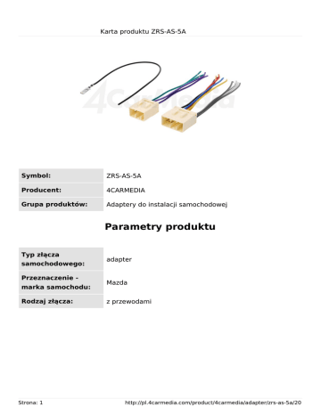 Karta produktu ZRS-AS-5A Symbol: ZRS-AS-5A Producent: 4CARMEDIA Grupa produktów: Adaptery do instalacji samochodowej Parametry produktu Typ złącza samochodowego: Przeznaczenie marka samochodu: Rodzaj złącza: Strona: 1 adapter Mazda z przewodami http://pl.4carmedia.com/product/4carmedia/adapter/zrs-as-5a/20 Karta produktu ZRS-AS-5A Przeznaczenie - Mazda 121 1991->1996, Mazda 323 1989->2001, Mazda model samochodu: 626 1987->2000, Mazda 929 1988->2000, Mazda B-Serie 1996->1999, Mazda Demio 1998->2000, Mazda E-Serie 1999->, Mazda Familia 1990->2000, Mazda MPV 1996>2000, Mazda MX-3 1991->1998, Mazda MX-5 Miata 1990>2000, Mazda MX-6 1987->1998, Mazda Millenia 1994>2001, Mazda Premacy 1999->2000, Mazda Protegé 1990->2000, Mazda RX-7 1993->2000, Mazda Xedos 6 1992->1999, Mazda Xedos 9 1994->2000 Informacje dodatkowe Masa brutto: Strona: 2 0,044 kg http://pl.4carmedia.com/product/4carmedia/adapter/zrs-as-5a/20