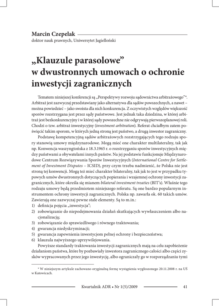 Marcin Czepelak doktor nauk prawnych, Uniwersytet Jagielloński „Klauzule parasolowe” w dwustronnych umowach o ochronie inwestycji zagranicznych Tematem niniejszej konferencji są „Perspektywy rozwoju sądownictwa arbitrażowego”*. Arbitraż jest zazwyczaj przedstawiany jako alternatywa dla sądów powszechnych, a nawet – można powiedzieć – jako swoista dla nich konkurencja. Z oczywistych względów większość sporów rozstrzygana jest przez sądy państwowe. Jest jednak taka dziedzina, w której arbi traż jest bezkonkurencyjny i w której sądy powszechne nie odgrywają pierwszoplanowej roli. Chodzi o tzw. arbitraż inwestycyjny (investment arbitration). Referat chciałbym zatem po święcić takim sporom, w których jedną stroną jest państwo, a drugą inwestor zagraniczny. Podstawę kompetencyjną sądów arbitrażowych rozstrzygających tego rodzaju spo ry stanowią umowy międzynarodowe. Mogą mieć one charakter multilateralny, tak jak np. Konwencja waszyngtońska z 18.3.1965 r. o rozstrzyganiu sporów inwestycyjnych mię dzy państwami a obywatelami innych państw. Na jej podstawie funkcjonuje Międzynaro dowe Centrum Rozwiązywania Sporów Inwestycyjnych (International Centre for Settlement of Investment Disputes – ICSID), przy czym trzeba nadmienić, że Polska nie jest stroną tej konwencji. Mogą też mieć charakter bilateralny, tak jak to jest w przypadku ty powych umów dwustronnych dotyczących popierania i wzajemnej ochrony inwestycji za granicznych, które określa się mianem bilateral investment treaties (BIT’s). Właśnie tego rodzaju umowy będą przedmiotem niniejszego referatu. Są one bardzo popularnym in strumentem ochrony inwestycji zagranicznych. Polska np. zawarła ok. 60 takich umów. Zawierają one zazwyczaj pewne stałe elementy. Są to m.in.: 1) definicja pojęcia „inwestycja”; 2) zobowiązanie do niepodejmowania działań skutkujących wywłaszczeniem albo na cjonalizacją; 3) zobowiązanie do sprawiedliwego i równego traktowania; 4) gwarancja niedyskryminacji; 5) gwarancja zapewnienia inwestycjom pełnej ochrony i bezpieczeństwa; 6) klauzula najwyższego uprzywilejowania. Powyższe standardy traktowania inwestycji zagranicznych mają na celu zapobieżenie działaniom państwa, które by pozbawiały inwestora zagranicznego całości albo części zy sków wypracowanych przez jego inwestycję, albo ograniczały go w rozporządzaniu tymi * W niniejszym artykule zachowano oryginalną formę wystąpienia wygłoszonego 20.11.2008 r. na UŚ w Katowicach. Kwartalnik ADR • Nr 1(5)/2009 41 Czepelak zyskami. Mechanizm tej ochrony polega na umiędzynarodowieniu obowiązków państwa, w którym dokonywana jest inwestycja. Jeżeli wynikające z umowy standardy zostaną na ruszone, inwestor ma prawo dochodzić odszkodowania z tego tytułu przed międzynaro dowym organem arbitrażowym. Dwustronne umowy o ochronie inwestycji zagranicznych przełamują więc w pew nym zakresie zasadę odmawiającą podmiotom prawa prywatnego locus standi w postę powaniu, w którym pozwanym jest państwo. Najczęściej spór inwestycyjny powstaje w związku z konkretnym kontraktem inwe stycyjnym. Dla uniknięcia dwuznaczności będę używał określenia „umowa międzyna rodowa” zamiennie ze słowem „traktat” oraz nazwy „kontrakt” dla oznaczenia umowy inwestycyjnej zawartej między inwestorem zagranicznym a państwem albo jednostką organizacyjną, za którą państwo jest odpowiedzialne. Może to być jednostka terytorial na, np. prowincja albo województwo, lub też spółka kontrolowana przez państwo. Taki kontrakt inwestycyjny oprócz postanowień, które określają treść wiążącego ich stosun ku materialnoprawnego, zawiera też dodatkowe umowy z nim związane, w szczególno ści wybór prawa właściwego dla tego kontraktu i wybór sądu (powszechnego albo arbi trażowego) dla ewentualnych sporów z nim związanych. Skoro, jak powiedziano, spór inwestycyjny powstaje w większości wypadków w zwią zku z konkretnym kontraktem inwestycyjnym, to należy określić, w jakim stosunku po zostają do siebie dwa reżimy odpowiedzialności: kontraktowy i traktatowy (czyli wyni kający z dwustronnej umowy o ochronie inwestycji zagranicznych). Teoretycznie są one odrębne, co ilustruje schemat nr 1. Sąd lub Trybunał Arbitrażowy wybrany przez strony umowy Trybunał Arbitrażowy, którego kompetencje określa Traktat Umowa inwestycyjna Inwestor Naruszenie umowy Podmiot państwowy Naruszenie Traktatu Schemat 1: Relacja między kontraktem inwestycyjnym a traktatem o ochronie inwestycji – model teoretyczny. I tak, jeżeli inwestor zarzuca kontrahentowi naruszenie kontraktu inwestycyjnego i wszczyna postępowanie przed sądem właściwym dla sporów z kontraktem związa nych, to mamy do czynienia z roszczeniem opartym na odpowiedzialności ex contrac42 Kwartalnik ADR • Nr 1(5)/2009 „Klauzule parasolowe” w dwustronnych umowach o ochronie tu, zwanym w literaturze przedmiotu contract-claim, które nie różni się co do zasady od innych sporów rozpoznawanych czy to przez sądy powszechne, czy arbitrażowe. Z kolei jeśli inwestor zarzuca państwu w związku z kontraktem naruszenie standardów ustalo nych w umowie o ochronie inwestycji zagranicznych, co określa się jako treaty-claim, to właściwy w tym zakresie będzie trybunał arbitrażowy powołany zgodnie z postanowie niami tej umowy międzynarodowej. Można więc wskazać następujące różnice między postępowaniem dotyczącym naru szenia kontraktu inwestycyjnego i naruszeniem dwustronnej umowy o ochronie inwe stycji zagranicznych: 1) podstawa prawna roszczenia; 2) prawo właściwe (dla przypisania i określenia zakresu odpowiedzialności); 3) strony postępowania; 4) treść roszczeń – odszkodowanie z tytułu odpowiedzialności kontraktowej. W praktyce okazuje się, że między naruszeniem kontraktu a naruszeniem umowy międzynarodowej zachodzi bardzo silna interakcja oparta z