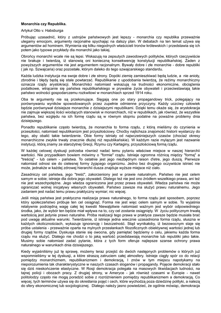Monarchia czy Republika. Artykuł Otto v. Habsburga Próbując uzasadnić, który z ustrojów państwowych jest lepszy - monarchia czy republika przeważnie ulegamy emocjom, argumenty racjonalne spychając na dalszy plan. W debatach na ten temat używa się argumentów ad hominem. Wymienia się kilku niegodnych właścicieli tronów królewskich i przedstawia się ich potem jako typowe przykłady dla monarchii jako takiej. Obrońcy monarchii wcale nie są lepsi. Wskazują na zepsutych zawodowych polityków, których rzeczywiście nie brakuje i twierdzą, iż stanowią oni konieczną konsekwencję konstytucji republikańskiej. Żaden z powyższych argumentów nie jest argumentem racjonalnym. Bywały dobre i złe monarchie - dobre republiki ( jak np. Szwajcaria) oraz pozostałe, którym daleko do tego szwajcarskiego standardu. Każda ludzka instytucja ma swoje dobre i złe strony. Dopóki ziemię zamieszkiwać będą ludzie, a nie anioły, zbrodnie i błędy będą się stale powtarzać. Republikanie z upodobania twierdzą, że reżimy monarchiczny oznacza rządy arystokracji. Monarchiści natomiast wskazują na trudności ekonomiczne, obciążenia podatkowe, wtrącanie się państwa republikańskiego w prywatne życie obywateli i przeciwstawiają takie państwo wolności gospodarczemu rozkwitowi w monarchiach sprzed 1914 roku. Oba te argumenty nie są przekonujące. Sięgają one po stary propagandowy trick, polegający na porównywaniu wyników spowodowanych przez zupełnie odmienne przyczyny. Każdy uczciwy człowiek będzie porównywał dzisiejsze monarchie z dzisiejszymi republikami. Dzięki temu okaże się, że arystokracja nie zajmuje większej ilości wiodących stanowisk w monarchiach, niż w republikach, jak również, że wszystkie państwa, bez względu na ich formę rządu są w równym stopniu podatne na poważne problemy dnia dzisiejszego. Ponadto republikanie często twierdzą, że monarchia to forma rządu, z którą mieliśmy do czynienia w przeszłości, natomiast republikanizm jest przyszłościowy. Choćby najlichsza znajomość historii wystarczy do tego, aby obalić takie twierdzenie. Obie formy istniały od najwcześniejszych czasów (chociaż okresy monarchiczne zwykle trwały znacznie dłużej niż republikańskie). W każdym razie mylącym jest nazwanie instytucji, którą znamy ze starożytnej Grecji, Rzymu czy Kartaginy, przyszłościową formą rządu. W każdej celowej dyskusji potrzeba również nadać temu pytaniu właściwe miejsce w naszej hierarchii wartości. Nie przypadkiem bowiem mówimy o "formie" rządu. Istnieje ogromna różnicą między "formą" a "treścią" - lub celem - państwa. To ostatnie jest jego niezbędnym raison d'etre, jego duszą. Pierwsze natomiast odnosi sie do cielesnej formy żyjącego organizmu. Jedno bez drugiego oczywiście istnieć nie może, jednakże w każdej zdrowej hierarchii dusza znajduje wyższe miejsce niż ciało. Zasadniczy cel państwa, jego "treść", zakorzeniony jest w prawie naturalnym. Państwo nie jest celem samym w sobie; istnieje dla dobra jego obywateli. Dlatego też nie jest ono źródłem wszelkiego prawa, ani też nie jest wszechpotężne. Jego władza ograniczona jest przez prawa obywateli. Władza państwa nie może ograniczać wolnej inicjatywy własnych obywateli. Państwo zawsze ma służyć prawu naturalnemu. Jego zadaniem jest nadać temu prawu praktyczny wymiar; nic więcej. Jeśli misją państwa jest praktyczna realizacja prawa naturalnego, to forma rządu jest sposobem, poprzez który społeczeństwo próbuje ten cel osiągnąć. Forma nie jest więc celem samym w sobie. To wyjaśnia relatywnie podrzędną wagę całej tej kwestii Niewątpliwie natomiast ważnym jest wybór odpowiedniego środka, jako, że wybór ten będzie miał wpływa na to, czy cel zostanie osiągnięty. W życiu politycznym trwałą wartością jest jedynie prawo naturalne. Próba realizacji tego prawa w praktyce zawsze będzie musiała brać pod uwagę aktualne warunki. Twierdzenie, iż istnieje jedna wiecznie uzasadniona forma rządu, słuszna w każdych okolicznościach, wykazuje ignorancję i bezczelność. Stąd wynikałoby, iż bezowocnym staje się próba ustalenia - przeważnie oparta na mylnych przesłankach filozoficznych obiektywnej wartości jednej lub drugiej formy rządów. Dyskusja stanie się owocna, gdy pamiętać będziemy o celu, jakiemu każda forma rządu ma służyć. Dlatego nie chodzi o to jaką wartość przedstawiają monarchie lub republiki jako takie. Musimy sobie natomiast zadać pytanie, która z tych form oferuje najlepsze szanse ochrony prawa naturalnego w warunkach dnia dzisiejszego. Kiedy wyjaśniliśmy już tę sprawę, możemy teraz przejść do dwóch następnych problemów o których już wspomnieliśmy w tej dyskusji, a które straszą zatruciem całej atmosfery. Istnieje ciągły spór co do relacji pomiędzy monarchizmem, republikanizmem i demokracją, I znów w tym miejscu napotykamy na nieporozumienia tak charakterystyczne w naszych czasach sloganów i propagandy. Pojęcie demokracji stało się dziś nieskończenie elastyczne. W Rosji demokracja polegała na masowych likwidacjach ludności, na tajnej policji i obozach pracy. Z drugiej strony, w Ameryce - jak również czasami w Europie - nawet politolodzy często nie mogą poradzić sobie z rozróżnieniem pomiędzy republikanizmem a demokracją. Co więcej, tych terminów używa się do określania pojęć i cech, które wychodzą poza dziedzinę polityki, a nalezą do sfery ekonomicznej lub socjologicznej. Dlatego należy jasno powiedzieć, że ogólnie mówiąc, demokracja oznacza prawo ludzi do uczestniczenia w określaniu ich własnego rozwoju i przyszłości. Jeśli przyjmiemy tę definicję, to zobaczymy, że żadna z tych dwóch klasycznych form rządu z natury nie jest związana z demokracją. Demokracja może istnieć pod obiema formami, tak jak istnieją autorytarne republiki i monarchie. Monarchiści jednakże cz