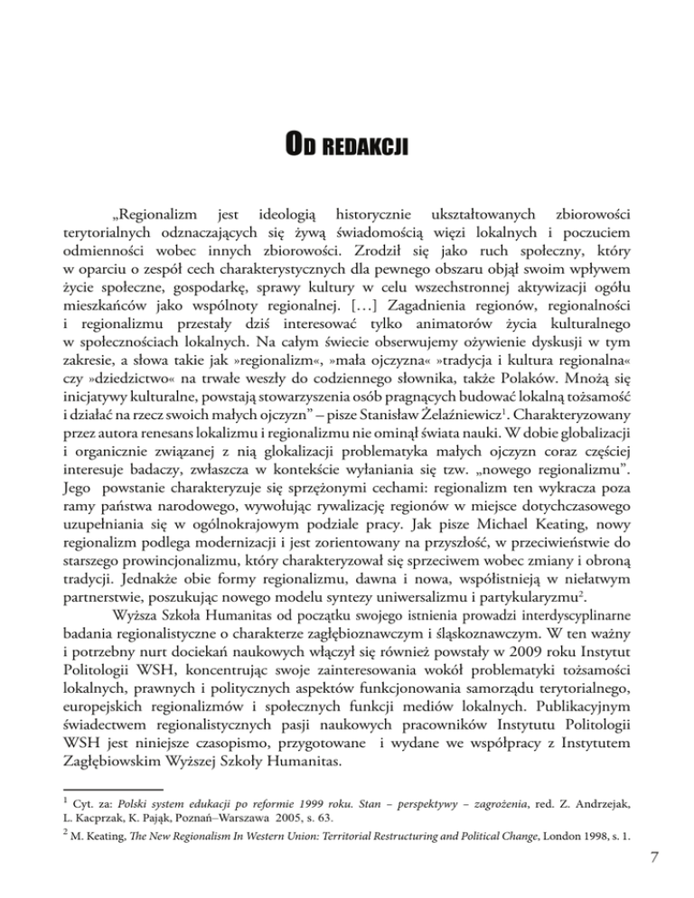 Regionalne i lokalne ustroje polityczne !"#$!%&'() „Regionalizm jest ideologią historycznie ukształtowanych zbiorowości terytorialnych odznaczających się żywą świadomością więzi lokalnych i poczuciem odmienności wobec innych zbiorowości. Zrodził się jako ruch społeczny, który w oparciu o zespół cech charakterystycznych dla pewnego obszaru objął swoim wpływem życie społeczne, gospodarkę, sprawy kultury w celu wszechstronnej aktywizacji ogółu mieszkańców jako wspólnoty regionalnej. […] Zagadnienia regionów, regionalności i regionalizmu przestały dziś interesować tylko animatorów życia kulturalnego w społecznościach lokalnych. Na całym świecie obserwujemy ożywienie dyskusji w tym zakresie, a słowa takie jak »regionalizm«, »mała ojczyzna« »tradycja i kultura regionalna« czy »dziedzictwo« na trwałe weszły do codziennego słownika, także Polaków. Mnożą się inicjatywy kulturalne, powstają stowarzyszenia osób pragnących budować lokalną tożsamość i działać na rzecz swoich małych ojczyzn” – pisze Stanisław Żelaźniewicz1. Charakteryzowany przez autora renesans lokalizmu i regionalizmu nie ominął świata nauki. W dobie globalizacji i organicznie związanej z nią glokalizacji problematyka małych ojczyzn coraz częściej interesuje badaczy, zwłaszcza w kontekście wyłaniania się tzw. „nowego regionalizmu”. Jego powstanie charakteryzuje się sprzężonymi cechami: regionalizm ten wykracza poza ramy państwa narodowego, wywołując rywalizację regionów w miejsce dotychczasowego uzupełniania się w ogólnokrajowym podziale pracy. Jak pisze Michael Keating, nowy regionalizm podlega modernizacji i jest zorientowany na przyszłość, w przeciwieństwie do starszego prowincjonalizmu, który charakteryzował się sprzeciwem wobec zmiany i obroną tradycji. Jednakże obie formy regionalizmu, dawna i nowa, współistnieją w niełatwym partnerstwie, poszukując nowego modelu syntezy uniwersalizmu i partykularyzmu2. Wyższa Szkoła Humanitas od początku swojego istnienia prowadzi interdyscyplinarne badania regionalistyczne o charakterze zagłębioznawczym i śląskoznawczym. W ten ważny i potrzebny nurt dociekań naukowych włączył się również powstały w 2009 roku Instytut Politologii WSH, koncentrując swoje zainteresowania wokół problematyki tożsamości lokalnych, prawnych i politycznych aspektów funkcjonowania samorządu terytorialnego, europejskich regionalizmów i społecznych funkcji mediów lokalnych. Publikacyjnym świadectwem regionalistycznych pasji naukowych pracowników Instytutu Politologii WSH jest niniejsze czasopismo, przygotowane i wydane we współpracy z Instytutem Zagłębiowskim Wyższej Szkoły Humanitas. 1 Cyt. za: Polski system edukacji po reformie 1999 roku. Stan – perspektywy – zagrożenia, red. Z. Andrzejak, L. Kacprzak, K. Pająk, !"#$%&'$()"$*$++,--./+)0+120 2 M. Keating, The New Regionalism In Western Union: Territorial Restructuring and Political Change, London 1998, s. 1. 7 Małgorzata Domagała, Jan Iwanek Do rąk Czytelników oddajemy pierwszy numer rocznika poświęconego szeroko pojętej tematyce lokalnej i regionalnej, analizowanej przede wszystkim z perspektywy politologii, ale również dyscyplin pokrewnych: socjologii, medioznawstwa czy nauk o kulturze. Zawiera on artykuły napisane w większości przez pracowników i współpracowników Instytutu Politologii WSH, choć zdarzają się w nim także teksty, które nie wyszły spod pióra naukowców – szkice autorstwa lokalnych dziennikarzy i miłośników regionu. Periodyk „Regionalne Studia Polityczne Humanitas” podzielony został na trzy części. Pierwszą, zatytułowaną „Studia i materiały”, wypełniają artykuły naukowe, dla których wspólnym mianownikiem jest szeroko rozumiana tematyka lokalna. Część druga – „Szkice zagłębiowskie” – wykracza poza przedmiot zainteresowania nauki o polityce. Składa się z materiałów publicystycznych – artykułów i wywiadów, których celem jest przybliżenie wiedzy o Zagłębiu Dąbrowskim i różnych wymiarach lokalnej tożsamości (aspekt kulturowy, historyczny, społeczny). Naszą intencją było bowiem stworzenie czasopisma, które łączyłoby w sobie walor naukowy z popularyzatorskim, warsztat badacza z warsztatem publicysty i komentatora rozmaitych zjawisk i procesów składających się na życie społeczne zagłębiowskiej „małej ojczyzny”. Trzecia część czasopisma obejmuje recenzje nowości wydawniczych o tematyce regionalistycznej oraz relacje z konferencji naukowych. Jan Iwanek Michał Kaczmarczyk 8