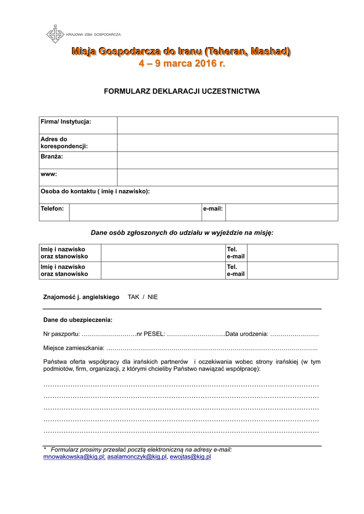 M Miissjjaa G Maasshhaadd)) Goossppooddaarrcczzaa ddoo IIrraannuu ((TTeehheerraann,, M 4 – 9 marca 2016 r. FORMULARZ DEKLARACJI UCZESTNICTWA Firma/ Instytucja: Adres do korespondencji: Branża: www: Osoba do kontaktu ( imię i nazwisko): Telefon: e-mail: Dane osób zgłoszonych do udziału w wyjeździe na misję: Imię i nazwisko oraz stanowisko Tel. e-mail Imię i nazwisko oraz stanowisko Tel. e-mail Znajomość j. angielskiego TAK / NIE Dane do ubezpieczenia: Nr paszportu: ………………………nr PESEL: ………………………..Data urodzenia: …………………… Miejsce zamieszkania: ………………………………………………………………………………………….. Państwa oferta współpracy dla irańskich partnerów i oczekiwania wobec strony irańskiej (w tym podmiotów, firm, organizacji, z którymi chcieliby Państwo nawiązać współpracę): …………………………………………………………………………………………………………… …………………………………………………………………………………………………………… …………………………………………………………………………………………………………… …………………………………………………………………………………………………………… …………………………………………………………………………………………………………… * Formularz prosimy przesłać pocztą elektroniczną na adresy e-mail: [email protected]; [email protected], [email protected]