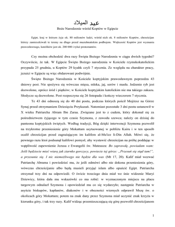 عيد الميلد Boże Narodzenie wśród Koptów w Egipcie Egipt, kraj w którym żyje ok. 80 milionów ludzi, wśród nich ok. 8 milionów Koptów, chrześcijan którzy zamieszkiwali te tereny na długo przed muzułmańskim podbojem. Większość Koptów jest wyznania prawosławnego, katolików jest ok. 200 000 i tyluż protestantów. Czy można obchodzić dwa razy Święta Bożego Narodzenia w ciągu dwóch tygodni? Oczywiście, że tak. W Egipcie Święto Bożego narodzenia w Kościele rzymskokatolickim przypada 25 grudnia, u Koptów 29 kyahk czyli 7 stycznia. Ze względu na charakter pracy, jezuici w Egipcie są więc obdarowani podwójnie. Święto Bożego Narodzenia w Kościele koptyjskim prawosławnym poprzedza 43 dniowy post. Nie spożywa się wówczas mięsa, mleka, jaj, serów i masła. Jedzenie ryb jest dozwolone, oprócz śród i piątków; w Kościele koptyjskim katolickim nie ma takiego zakazu. Słodycze są dozwolone. Post rozpoczyna się 26 listopada i kończy wieczorem 7 stycznia. Te 43 dni odnoszą się do 40 dni postu, podczas których pościł Mojżesz na Górze Synaj przed otrzymaniem Dziesięciu Przykazań. Natomiast pozostałe 3 dni postu ustanowił w X wieku Patriarcha Abram Ibn Zaraa. Związane jest to z cudem, który dokonał się za pośrednictwem żyjącego w tym czasie Szymona, z zawodu szewca; należy on dzisiaj do panteonu koptyjskich świętych. Według tradycji, Bóg dzięki interwencji Szymona pozwolił na trzykrotne przeniesienie góry Mokattam usytuowanej w pobliżu Kairu i w ten sposób ocalił chrześcijan przed zagrażającym im kalifem al-Mu'izz li-Din Allah. Mówi się, że pewnego razu ktoś podsunął kalifowi pomysł, aby wystawić chrześcijan na próbę poddając w wątpliwość zapewnienie Jezusa z Ewangelii św. Mateusza: Bo zaprawdę, powiadam wam: Jeśli będziecie mieć wiarę jak ziarnko gorczycy, powiecie tej górze: „Przesuń się stąd tam!”, a przesunie się. I nic niemożliwego nie będzie dla was (Mt 17, 20). Kalif miał wezwać Patriarchę Abrama i powiedzieć mu, że jeśli odmówi albo nie dokona przeniesienia góry, wówczas chrześcijanie albo będą musieli przyjąć islam albo opuścić Egipt. Patriarcha otrzymał trzy dni na odpowiedź. O świcie trzeciego dnia miał we śnie widzenie Maryi Dziewicy, która dała mu wskazówki co ma robić: w wyznaczonym miejscu na placu targowym odnalazł Szymona i opowiedział mu co się wydarzyło; następnie Patriarcha w asyście biskupów, kapłanów, diakonów i w obecności wiernych odprawił Mszę św. o okolicach góry Mokattam; potem na znak dany przez Szymona miał uczynić znak krzyża w kierunku góry, i tak trzy razy. Kalif widząc przemieszczającą się górę pozwolił chrześcijanom 1 pozostać w Egipcie, pomagając nawet odbudować kościoły. W 1969 roku u stóp góry powstało wysypisko śmieci. Zamieszkali tam chrześcijanie zajmujący się zbieraniem odpadów z miasta. W bardzo wielkiej tajemnicy przed władzą, niechętną w dawaniu pozwolenia na budowę kościołów, wydrążyli w górze groty i tak powstały tam kaplice, jedna z nich może pomieścić nawet ok. 15 000 wiernych. W miejsce to przybywają bardzo liczni pielgrzymi. Ma ono również polskie akcenty, w kaplicach i na ścianach góry znajdują się rzeźby przedstawiające sceny biblijne, z życia Świętej Rodziny, Jezusa i Kościoła koptyjskiego. Ich autorem jest Polak, Mariusz, były seminarzysta jednego ze zgromadzeń zakonnych, który odnalazł swoje powołanie w małżeństwie z egipską chrześcijanką. Na szczycie góry powstała willowa dzielnica Kairu, w której znajduje się nasz jezuicki dom rekolekcyjny otwarty na spotkania dla młodzieży i ludzi pragnących doświadczyć rekolekcji ignacjańskich. 30 ostatnich dni, które poprzedzają Boże Narodzenie w Kościele koptyjskim, określane jest mianem „Kyahk”, od nazwy miesiąca. Jest on również określany jako „miesiąc maryjny”, i jest to czas, który przypomina naszą cześć, którą oddajemy Maryi w Adwencie poprzez Msze roratnie. W tym czasie wierni śpiewają pieśni na cześć Bogarodzicy. W kościołach prawosławnych i klasztorach przez cztery soboty zbierają się bardzo liczni wierni, aby przez cały wieczór i całą noc modlić się, głównie śpiewając psalmy i kantyki po arabsku i koptyjsku na cześć Maryi Dziewicy i Tajemnicy wcielenia. W cztery niedziele przed Bożym Narodzeniem czytane są kolejne fragmenty Ewangelii św. Łukasza: zwiastowanie narodzin Jana Chrzciciela Zachariaszowi przez archanioła Gabriela (Łk 1, 1-25), zwiastowanie narodzin Jezusa Maryi (Łk 1, 26-38), nawiedzenie Elżbiety przez Maryję (Łk 1, 39-56) i narodziny Jana Chrzciciela (Łk 1, 57-80). Święto Bożego Narodzenia rozpoczyna się Mszą Wigilijną 28 kyahk ok. godziny 21, która kończy się po północy 29 kyahk czyli 7 stycznia, który jest odpowiednikiem naszego Pierwszego dnia Świat. Po Mszy wierni gromadzą się w przykościelnej sali, gdzie razem spożywają agapę na wzór pierwszych wspólnot chrześcijańskich. Często po powrocie do domów również jedzą przyrządzone wcześniej smakołyki. W tych dniach wzrasta również przed kościołami liczba policjantów z oddziałów specjalnych i wojska, widzi się także pojazdy opancerzone, zwłaszcza w Górnym Egipcie, gdzie liczba chrześcijan dochodzi nawet do 30% lokalnego społeczeństwa. Nie wszyscy podzielają radość chrześcijan i dochodzi do konfliktów, giną ludzie. Dlatego, po zakończonych uroczystościach, jeśli nic się nie wydarzyło, oficerowie składają życzenia księdzu, lokalnym władzom i wszyscy oddychają z wielką ulgą. 2 Ciekawostką jest tradycja, rozwinięta zwłaszcza w Kościele koptyjskim prawosławnym, dotycząca ucieczki Świętej rodziny do Egiptu: Oto anioł Pański ukazał się Józefowi we śnie i rzekł: „Wstań, weź Dziecię i Jego Matkę i uchodź do Egiptu; pozostań tam, aż ci powiem; bo Herod będzie szukał Dzieci