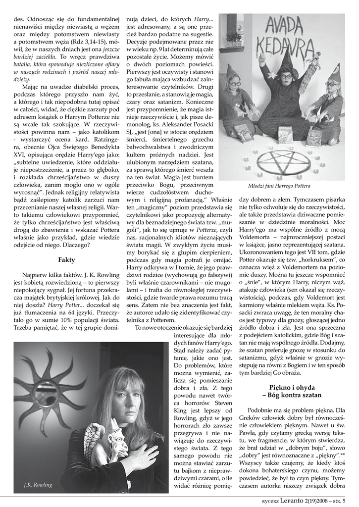 des. Odnosząc się do fundamentalnej nienawiści między niewiastą a wężem oraz między potomstwem niewiasty a potomstwem węża (Rdz 3,14-15), mówił, że w naszych dniach jest ona jeszcze bardziej zaciekła. To wręcz prawdziwa batalia, która spowoduje niezliczone ofiary w naszych rodzinach i pośród naszej młodzieży. Mając na uwadze diabelski proces, podczas którego przyszło nam żyć, a którego i tak niepodobna tutaj opisać w całości, widać, że ciężkie zarzuty pod adresem książek o Harrym Potterze nie są wcale tak szokujące. W rzeczywistości powinna nam – jako katolikom - wystarczyć ocena kard. Ratzingera, obecnie Ojca Świętego Benedykta XVI, opisująca orędzie Harry’ego jako: „subtelne uwiedzenie, które oddziałuje niepostrzeżenie, a przez to głęboko, i rozkłada chrześcijaństwo w duszy człowieka, zanim mogło ono w ogóle wyrosnąć”. Jednak religijny relatywista bądź zaślepiony katolik zarzuci nam przecenianie naszej własnej religii. Warto takiemu człowiekowi przypomnieć, że tylko chrześcijaństwo jest właściwą drogą do zbawienia i wskazać Pottera właśnie jako przykład, gdzie wiedzie odejście od niego. Dlaczego? Fakty Najpierw kilka faktów. J. K. Rowling jest kobietą rozwiedzioną – to pierwszy niepokojący sygnał. Jej fortuna przekracza majątek brytyjskiej królowej. Jak do niej doszła? Harry Potter... doczekał się już tłumaczenia na 64 języki. Przeczytało go w sumie 10% populacji świata. Trzeba pamiętać, że w tej grupie domi- J.K. Rowling nują dzieci, do których Harry... jest adresowany, a są one przecież bardzo podatne na sugestie. Decyzje podejmowane przez nie w wieku np. 9 lat determinują całe pozostałe życie. Możemy mówić o dwóch poziomach powieści. Pierwszy jest oczywisty i stanowi go fabuła mająca wzbudzać zainteresowanie czytelników. Drugi to przesłanie, a stanowią je magia, czary oraz satanizm. Konieczne jest przypomnienie, że magia istnieje rzeczywiście i, jak pisze demonolog, ks. Aleksander Posacki SJ, „jest [ona] w istocie orędziem śmierci, śmiertelnego grzechu bałwochwalstwa i zwodniczym kultem próżnych nadziei. Jest ulubionym narzędziem szatana, za sprawą którego śmierć weszła na ten świat. Magia jest buntem przeciwko Bogu, przeciwnym wierze cudzołóstwem duchowym i religijną profanacją.” Właśnie ten „magiczny” poziom przedstawia się czytelnikowi jako propozycję alternatywy dla beznadziejnego świata tzw. „mugoli”, jak to się ujmuje w Potterze, czyli nas, racjonalnych idiotów nieznających świata magii. W zwykłym życiu musimy borykać się z głupim cierpieniem, podczas gdy magia potrafi je omijać. Harry odkrywa w I tomie, że jego prawdziwi rodzice (wychowują go fałszywi) byli właśnie czarownikami – nie mugolami – i trafia do równoległej rzeczywistości, gdzie twarde prawa rozumu tracą sens. Zatem nie bez znaczenia jest fakt, że autorce udało się zidentyfikować czytelnika z Potterem. To nowe otoczenie okazuje się bardziej interesujące dla młodych fanów Harry’ego. Stąd należy zadać pytanie, jakie ono jest. Do problemów, które można wymienić, zalicza się pomieszanie dobra i zła. Z tego powodu nawet twórca horrorów Steven King jest lepszy od Rowling, gdyż w jego horrorach zło zawsze przegrywa i nie nawiązuje do rzeczywistego świata. Z tego samego powodu nie można stawiać zarzutu bajkom z nieprawdziwymi czarami, o ile widać różnicę pomię- Młodzi fani Harrego Pottera dzy dobrem a złem. Tymczasem pisarka nie tylko odwołuje się do rzeczywistości, ale także przedstawia dziwaczne pomieszanie w dziedzinie moralności. Moc Harry’ego ma wspólne źródło z mocą Voldemorta – najmroczniejszej postaci w książce, jasno reprezentującej szatana. Ukoronowaniem tego jest VII tom, gdzie Potter okazuje się tzw. „horkruksem”, co oznacza więź z Voldemortem na poziomie duszy. Można tu jeszcze wspomnieć o „śnie”, w którym Harry, niczym wąż, atakuje człowieka (sen okazał się rzeczywistością), podczas, gdy Voldemort jest karmiony właśnie mlekiem węża. Ks. Posacki zwraca uwagę, że ten moralny chaos jest typowy dla gnozy, głoszącej jedno źródło dobra i zła. Jest ona sprzeczna z podejściem katolickim, gdzie Bóg i szatan nie mają wspólnego źródła. Dodajmy, że szatan preferuje gnozę w stosunku do satanizmu, gdyż właśnie w gnozie występuję na równi z Bogiem i w ten sposób tym bardziej Go obraża. Piękno i ohyda – Bóg kontra szatan Podobnie ma się problem piękna. Dla Greków człowiek dobry był równocześnie człowiekiem pięknym. Nawet u św. Pawła, gdy czytamy grecką wersję tekstu, we fragmencie, w którym stwierdza, że brał udział w „dobrym boju”, słowo „dobry” jest równoznaczne z „piękny”.** Wszyscy także czujemy, że kiedy ktoś dokona bohaterskiego czynu, możemy powiedzieć, że był to czyn piękny. Tymczasem autorka niszczy związek dobra rycerz Lepanto 2(19)2008 – str.