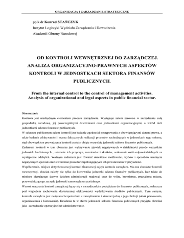 ORGANIZACJA I ZARZĄDZANIE STRATEGICZNE ppłk dr Konrad STAŃCZYK Instytut Logistyki Wydziału Zarządzania i Dowodzenia Akademii Obrony Narodowej OD KONTROLI WEWNĘTRZNEJ DO ZARZĄDCZEJ. ANALIZA ORGANIZACYJNO-PRAWNYCH ASPEKTÓW KONTROLI W JEDNOSTKACH SEKTORA FINANSÓW PUBLICZNYCH. From the internal control to the control of management activities. Analysis of organizational and legal aspects in public financial sector. Streszczenie Kontrola jest niezbędnym elementem procesu zarządzania. Występuje zatem zarówno w zarządzaniu całą gospodarką narodową, jej poszczególnymi dziedzinami oraz jednostkami organizacyjnymi, a wśród nich jednostkami sektora finansów publicznych. W sektorze publicznym celem kontroli jest badanie zgodności postępowania z obowiązującymi aktami prawa, a także badanie efektywności i ocena faktycznych realizacji procesów zachodzących w jednostkach tego sektora, stąd obowiązkiem prowadzenia kontroli zostały objęte wszystkie jednostki sektora finansów publicznych. Zadaniem kontroli w tym obszarze jest wykrywanie zjawisk negatywnych w działalności przede wszystkim jednostek budżetowych , ustalanie ich przyczyn, rozmiarów i skutków, wskazanie osób odpowiedzialnych za wystąpienie odchyleń. Ważnym zadaniem jest również określenie możliwości, trybów i sposobów usunięcia negatywnych zjawisk oraz stworzenie procedur zapobiegających ich powstawaniu w przyszłości. Współcześnie, miejsce dotychczasowej kontroli finansowej zajęła kontrola zarządcza. Ma ona charakter kontroli wewnętrznej, chociaż należy nie tylko do kierownika jednostki sektora finansów publicznych, lecz także do ministra kierującego danym działem administracji rządowej oraz do wójta, burmistrza, prezydenta miasta, przewodniczącego zarządu jednostki samorządu terytorialnego. Wzrost znaczenia kontroli zarządczej łączy się z menadżerskim podejściem do finansów publicznych, zwłaszcza pod względem zachowania dostatecznej efektywności wydatkowania środków publicznych. Tym samym, kontrola zarządcza jest związana bezpośrednio z zarządzaniem i stanowi jedną z jego funkcji (obok planowania, organizowania i kierowania). Działania te w sferze jednostek sektora finansów publicznych przyjęto określać jako zarządzanie operacyjne lub administrowanie. ORGANIZACJA I ZARZĄDZANIE STRATEGICZNE Summary The threat of crisis in public finances enforces regulations aiming at their rehabilitation especially for effective spending and controlling of both the state and European finances. For these purposes the place of the previous financial control has been taken over by the control of management activities. It performs the role of internal control; however it is not subjected only to the manager in charge of the given sector of public finances but also to the minister responsible for the particular department of state administration and local governments. These days the importance and significance of the control of management activities is associated with the managerial attitude to the sector of public finances with especial stress on their effective spending. Słowa kluczowe: finanse publiczne, jednostki sektora finansów publicznych, kontrola wewnętrzna, kontrola zarządcza; Keywords: public finances, units of the sector of public finances, internal control, Control of management activities. Kontrola jest niezbędnym elementem procesu kierowania (zarządzania) każdym zorganizowanym działaniem ludzkim bez względu na dziedzinę, szczebel i rozmiar, na jakim jest realizowane to działanie. Występuje zatem zarówno w zarządzaniu całą gospodarką narodową, jej poszczególnymi dziedzinami oraz jednostkami organizacyjnymi, a wśród nich jednostkami sektora finansów publicznych1. Kontrola to porównanie stanu faktycznego ze stanem wymaganym, rozpatrywanie czegoś; dochodzenie czegoś, wnikanie, wgląd w coś; nadzór nad czymś2. W literaturze przedmiotu kontrola jest traktowana jako jeden z elementów cyklu sprawnego, zorganizowanego działania, obejmującego: 1. Uświadomienie sobie (i – w przypadku działania zbiorowego – przez kierownictwo członkom zespołu) rzeczywistych celów działania oraz ich wzajemnego stosunku; 2. Planowanie działania, czyli obmyślanie środków i sposobów działania dostosowanych zarówno do celów, jak i do warunków, albo inaczej, organizowanie toku działań; 1 2 Por. M. Klimas, Podręczna encyklopedia rachunkowości, Poltext, Warszawa 2000,s. 314. Słownik języka polskiego, Warszawa 1984, t. 1, s. 1001. ORGANIZACJA I ZARZĄDZANIE STRATEGICZNE 3. Pozyskanie i rozmieszczenie zasobów potrzebnych do wykonywania działań, a gdyby ich pozyskanie okazało się niemożliwe, działanie uboczne zmierzające do takiego przekształcenia wewnętrznych i zewnętrznych warunków działania głównego, aby główny cel mógł być osiągnięty za pomocą zasobów będących do dyspozycji (pozyskanie zasobów można scharakteryzować również jako organizowanie w znaczeniu statycznym); 4. Realizowanie zadań: im bardziej udoskonalona struktura organizacyjna, tym bardziej powodzenie całego procesu zależy od dokładności realizacji wszystkich, chociażby pozornie drobnych, szczegółów planu działania; 5. Kontrolę realizacji, polegającą na porównaniu realizacji z odpowiednimi wzorcami i wyciągnięciu z tego porównania wniosków na przyszłość3. Tak rozumiana kontrola, w sensie działalności, czyli w aspekcie czynnościowym posiada złożony charakter, składa się z wielu elementów. Rozumie się ją w wąskim, bądź szerokim znaczeniu. W wąskim rozumieniu kontrolą nazywamy ogół czynności polegających na sprawdzeniu stanu faktycznego4. W szerokim rozumieniu kontrola jest swoistą działalnością, na którą składają się następujące zasadnicze rodzaje czynności: ustalanie stanu obowiązującego (wyznaczeń), ustalanie stanu rzeczywistego (wykonań), porównanie wykonań z obowiązującymi wyznaczenia