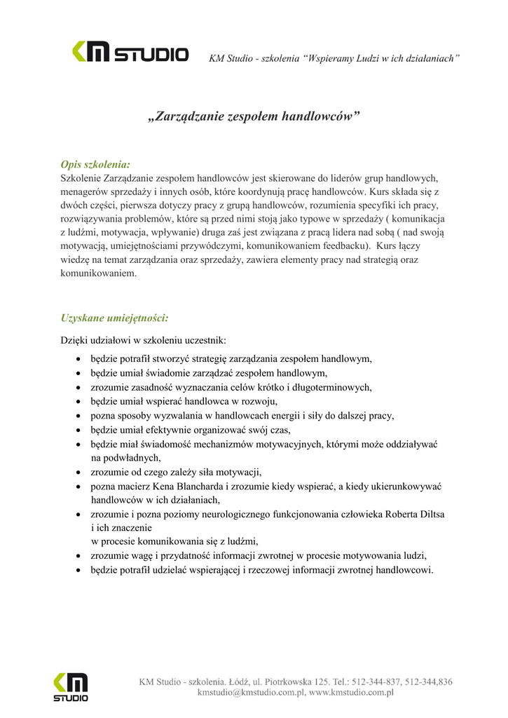 „Zarządzanie zespołem handlowców” Opis szkolenia: Szkolenie Zarządzanie zespołem handlowców jest skierowane do liderów grup handlowych, menagerów sprzedaży i innych osób, które koordynują pracę handlowców. Kurs składa się z dwóch części, pierwsza dotyczy pracy z grupą handlowców, rozumienia specyfiki ich pracy, rozwiązywania problemów, które są przed nimi stoją jako typowe w sprzedaży ( komunikacja z ludźmi, motywacja, wpływanie) druga zaś jest związana z pracą lidera nad sobą ( nad swoją motywacją, umiejętnościami przywódczymi, komunikowaniem feedbacku). Kurs łączy wiedzę na temat zarządzania oraz sprzedaży, zawiera elementy pracy nad strategią oraz komunikowaniem. Uzyskane umiejętności: Dzięki udziałowi w szkoleniu uczestnik: będzie potrafił stworzyć strategię zarządzania zespołem handlowym, będzie umiał świadomie zarządzać zespołem handlowym, zrozumie zasadność wyznaczania celów krótko i długoterminowych, będzie umiał wspierać handlowca w rozwoju, pozna sposoby wyzwalania w handlowcach energii i siły do dalszej pracy, będzie umiał efektywnie organizować swój czas, będzie miał świadomość mechanizmów motywacyjnych, którymi może oddziaływać na podwładnych, zrozumie od czego zależy siła motywacji, pozna macierz Kena Blancharda i zrozumie kiedy wspierać, a kiedy ukierunkowywać handlowców w ich działaniach, zrozumie i pozna poziomy neurologicznego funkcjonowania człowieka Roberta Diltsa i ich znaczenie w procesie komunikowania się z ludźmi, zrozumie wagę i przydatność informacji zwrotnej w procesie motywowania ludzi, będzie potrafił udzielać wspierającej i rzeczowej informacji zwrotnej handlowcowi. Program szkolenia: I. PLANOWANIE STRATEGICZNE Qvo vadis handlowcu?! - czyli korzyści z dobrze skonstruowanej strategii handlowej. Cele krótko i długoterminowe - świadomość priorytetów i kryteriów ich realizacji. Kto ponosi odpowiedzialność za ustalane cele handlowe? Zasoby zewnętrzne i wewnętrzne w kontekście ustalonych celów, czyli analiza SWOT zespołu handlowego. 5. 3 filary sprzedaży: Efektywne generowanie bieżącej sprzedaży, Jak poszerzać krąg nowych klientów? Impregnowanie obecnych klientów przed wpływem konkurencji, czyli jak budować lojalność klientów? 6. Tego się nie da, bo... - hamulce wewnętrzne handlowców. 1. 2. 3. 4. II. WDRAŻANIE W CZYN 1. 2. 3. 4. 5. 6. Najpierw rzecz najważniejsza!!! - Określenie docelowych grup klientów. W tym jesteśmy mistrzami świata, czyli zdefiniowanie obszarów przewagi konkurencyjnej. Marketing edukacyjny, czyli jak nauczać klienta i poszerzać perspektywy dostrzeganych przez niego możliwości. Jak nadać tempo strategii? - Twoja wizja, nasza strategia, ich oddziaływanie na klientów. 20% twoich decyzji wpływa na 80% twoich przychodów. Tylko które 20%?, czyli efektywne organizowanie czasu i zasobów. Analiza aktywności sprzedażowej handlowców - co i kiedy analizować? III. BUDOWANIE ZAANGAŻOWANEGO ZESPOŁU HANDLOWCÓW 1. Masz dwoje uszu i tylko jedne usta, więc tak z nich korzystaj - jak poznać indywidualny system wartości handlowca? 2. Jak generować zmianę w postawach handlowców? 3. Możesz wydawać polecenia, możesz też stawiać wyzwania i inspirować handlowców, czyli na jakim poziomie neurologicznego funkcjonowania ludzi można na nich oddziaływać? 4. Konsekwencja - najmocniejsze narzędzie wywierania wpływu na handlowców. 5. Komunikacja z zespołem i jej wpływ na efektywność w handlu. IV. JA LIDER 1. Kim jesteś i po co to robisz? Tożsamość i misja lidera - jej wpływ na zaangażowanie pozostałych członków zespołu. 2. Handlowcy są różni, czyli jak dostosować styl przywództwa do etapu rozwoju podwładnego? 3. Bądź tym kogo potrzebuje twój handlowiec - model przywództwa sytuacyjnego Kena Blancharda. 4. Jak nagradzać handlowców? 5. Znasz 12 najważniejszych czynników decydujących o zaangażowaniu pracowników? Wyniki badań Instytutu Gallupa. 6. Relacje ze swoim bezpośrednim przełożonym, czyli metaczynnik oddziaływujący na wszystkie inne motywatory świadczące o zaangażowaniu personelu. 7. Co decyduje o sile motywacji handlowca? - odkrycie Victora Vrooma. 8. Jesteś tak dobry, jak dobry jest twój zespół, czyli samoświadomość lidera. V. COACHING HANDLOWCÓW 1. Wspólnie osiągniecie więcej, czyli coaching wspierający w pracy handlowców. 2. Lider obserwuje, wyciąga wnioski i komunikuje czego oczekuje w przyszłości, czyli rola i znaczenie informacji zwrotnej. 3. To koniec? - wypalenie zawodowe, jak wesprzeć człowieka i zaangażować w to zespół? 4. Postaw na orły! - czyli jak dopingować najlepszych i stawiać im wyzwania? 5. Stwórz z nich wojowników sprzedaży, czyli szkolenie umysłów. 6. Jestem fighterem? Model sukcesu - budowanie pewności siebie handlowca. 7. Nie muszę niczego udowadniać - skąd czerpać siłę i energię? Metodologia: Podczas szkolenia wykorzystujemy następujące metody szkoleniowe: wykład case study odgrywanie ról praca z kamerą feedback dyskusja Informacje organizacyjne: Ilość godzin szkolenia: 12 godzin / 2dni Godziny szkolenia: 9:15-15:15 Miejsce szkolenia: Łódź, ul Piotrkowska 125 – KM Studio - szkolenia