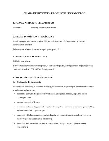 CHARAKTERYSTYKA PRODUKTU LECZNICZEGO 1. NAZWA PRODUKTU LECZNICZEGO Novocef 500 mg, tabletki powlekane 2. SKŁAD JAKOŚCIOWY I ILOŚCIOWY Każda tabletka powlekana zawiera 500 mg cefuroksymu (Cefuroximum) w postaci cefuroksymu aksetylu. Pełny wykaz substancji pomocniczych, patrz punkt 6.1. 3. POSTAĆ FARMACEUTYCZNA Tabletki powlekane Białe tabletki powlekane dwuwypukłe, o kształcie kapsułki, z linią dzielącą na jednej stronie oraz wytłoczeniem „CX 500” na drugiej stronie 4. SZCZEGÓŁOWE DANE KLINICZNE 4.1. Wskazania do stosowania Novocef jest wskazany w leczeniu następujących zakażeń, wywołanych przez drobnoustroje wrażliwe na cefuroksym: zakażenia górnych dróg oddechowych: zapalenie gardła i krtani, zapalenie zatok obocznych nosa; zapalenie ucha środkowego; zakażenia dolnych dróg oddechowych: ostre zapalenie oskrzeli, zaostrzenie przewlekłego zapalenia oskrzeli, zapalenie płuc; zakażenia układu moczowego: odmiedniczkowe zapalenie nerek, zapalenie pęcherza moczowego, zapalenie cewki moczowej; zakażenia skóry i tkanek miękkich: czyraczność, liszajec, ropne zapalenie skóry (piodermia); rzeżączka – ostre niepowikłane gonokokowe zapalenie cewki moczowej i zapalenie szyjki macicy wywołane przez Neisseria gonorrhoeae; borelioza (choroba z Lyme) – wczesna faza oraz zapobieganie jej późnym powikłaniom u dorosłych i dzieci w wieku powyżej 12 lat. Podejmując decyzję o leczeniu produktem Novocef należy uwzględnić oficjalne zalecenia dotyczące prawidłowego stosowania leków przeciwbakteryjnych. 4.2. Dawkowanie i sposób podawania Dorośli W większości zakażeń zaleca się dawkę: 1 tabletka 250 mg 2 razy na dobę. Leczenie trwa zwykle 7 dni. W razie konieczności podania dawki mniejszej niż 500 mg, dostępne są również tabletki o mocy 125 mg i 250 mg. Ciężkie zakażenia dolnych dróg oddechowych, w tym zapalenie płuc: 1 tabletka 500 mg 2 razy na dobę. Zakażenia układu moczowego: zwykle wystarczy 1 tabletka 125 mg 2 razy na dobę. Odmiedniczkowe zapalenie nerek: zazwyczaj 1 tabletka 250 mg 2 razy na dobę. Niepowikłana rzeżączka: 1 g (2 tabletki 500 mg albo 4 tabletki 250 mg) w pojedynczej dawce. Borelioza: dorośli i dzieci w wieku powyżej 12 lat: 500 mg 2 razy na dobę, przez 20 dni. Dzieci Zwykle stosuje się 1 tabletkę 125 mg (lub 10 mg/kg mc.) 2 razy na dobę. Nie należy podawać dawki większej niż 250 mg na dobę. Zapalenie ucha środkowego: u dzieci poniżej 2 lat podaje się dawkę 125 mg (lub 10 mg/kg mc.) 2 razy na dobę. Nie należy podawać dawki większej niż 250 mg na dobę. Dzieciom powyżej 2 lat podaje się 1 tabletkę 250 mg (albo 2 tabletki po 125 mg lub 15 mg/kg mc.) 2 razy na dobę. Nie należy podawać dawki większej niż 500 mg na dobę. Brak doświadczeń dotyczących stosowania produktu u dzieci poniżej 3. miesiąca życia. 2 Pacjenci w podeszłym wieku i pacjenci z zaburzeniami czynności nerek U pacjentów w podeszłym wieku, z zaburzoną czynnością nerek lub poddawanych dializie, nie ma konieczności specjalnego dostosowania dawkowania podczas podawania leku w dawce nie przekraczającej 1 g na dobę. Sposób podawania Novocef w postaci tabletek powlekanych jest stosowany doustnie. Tabletki powlekane należy przyjmować po posiłku w celu zapewnienia optymalnego wchłaniania, połykać w całości. Nie należy ich dzielić ani kruszyć. 4.3. Przeciwwskazania Nadwrażliwość na antybiotyki cefalosporynowe lub którykolwiek składnik produktu. 4.4. Specjalne ostrzeżenia i środki ostrożności dotyczące stosowania Należy zachować ostrożność podczas podawania cefuroksymu pacjentom, u których wystąpiły reakcje nadwrażliwości (zwłaszcza reakcje anafilaktyczne) na penicyliny lub inne antybiotyki laktamowe nie należące do grupy cefalosporyn, z powodu możliwości wystąpienia alergii na te antybiotyki (tzw. alergia krzyżowa). Podobnie, jak w przypadku leczenia innymi antybiotykami, długotrwałe podawanie cefuroksymu może doprowadzić do wyselekcjonowania drobnoustrojów niewrażliwych na antybiotyk (np. Enterococcus spp., Clostridium difficile, Candida spp.), co może powodować konieczność przerwania kuracji. Znane są przypadki wystąpienia rzekomobłoniastego zapalenia jelita grubego po zastosowaniu antybiotyków o szerokim zakresie działania. Dlatego w czasie stosowania leku lub po zakończeniu leczenia, należy wziąć pod uwagę taką diagnozę u pacjentów, u których wystąpiła biegunki, zwłaszcza uporczywa. W lżejszych przypadkach wystarczy odstawić antybiotyk, w cięższych może być konieczne podanie metronidazolu lub wankomycyny. Nie należy stosować leków hamujących perystaltykę jelit ani innych działających zapierająco. Zastosowanie cefuroksymu w leczeniu boreliozy może wywołać reakcję Jarischa-Herxheimera, objawiającą się gorączką, dreszczami, bólami głowy i mięśni, przyspieszoną czynnością serca i oddechu. Jest to częsta reakcja, ustępująca samoistnie, będąca wynikiem działania 3 cefuroksymu lub innego antybiotyku na komórkę bakterii Borrelia burgdorferi, wywołującej chorobę. 4.5. Interakcje z innymi lekami i inne rodzaje interakcji Podobnie, jak inne antybiotyki, cefuroksym może zaburzać skład flory jelitowej, prowadząc do zmniejszonego wchłaniania estrogenów i do obniżenia skuteczności złożonych doustnych leków antykoncepcyjnych. Jednoczesne stosowanie probenecydu powoduje zmniejszenie wydzielania kanalikowego cefuroksymu o 50%. Nie zaleca się jednoczesnego stosowania obu tych leków, gdyż może to spowodować zwiększone stężenie i przedłużone utrzymywanie się antybiotyku w surowicy. Stężenie cefuroksymu w surowicy zwiększa się po dializach. U pacjentów leczonych cefuroksymu aksetylem zaleca się oznaczanie stężenia glukozy we krwi jedną z metod enzymatycznych - z zastosowaniem oksydazy glukozowej lub heksokinazy. Antybiotyk ten nie wpływa na wynik alkalicznej próby pikrynianowej na kreatynin