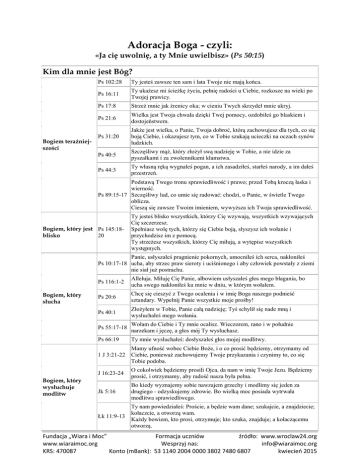 Adoracja Boga - czyli: «Ja cię uwolnię, a ty Mnie uwielbisz» (Ps 50:15) Kim dla mnie jest Bóg? Bogiem teraźniejszości Ps 102:28 Ty jesteś zawsze ten sam i lata Twoje nie mają końca. Ps 16:11 Ty ukażesz mi ścieżkę życia, pełnię radości u Ciebie, rozkosze na wieki po Twojej prawicy. Ps 17:8 Strzeż mnie jak źrenicy oka; w cieniu Twych skrzydeł mnie ukryj. Ps 21:6 Wielka jest Twoja chwała dzięki Twej pomocy, ozdobiłeś go blaskiem i dostojeństwem. Ps 31:20 Jakże jest wielka, o Panie, Twoja dobroć, którą zachowujesz dla tych, co się boją Ciebie, i okazujesz tym, co w Tobie szukają ucieczki na oczach synów ludzkich. Ps 40:5 Szczęśliwy mąż, który złożył swą nadzieję w Tobie, a nie idzie za pyszałkami i za zwolennikami kłamstwa. Ps 44:3 Ty własną ręką wygnałeś pogan, a ich zasadziłeś, starłeś narody, a im dałeś przestrzeń. Podstawą Twego tronu sprawiedliwość i prawo; przed Tobą kroczą łaska i wierność. Ps 89:15-17 Szczęśliwy lud, co umie się radować: chodzi, o Panie, w świetle Twego oblicza. Cieszą się zawsze Twoim imieniem, wywyższa ich Twoja sprawiedliwość. Bogiem, który jest Ps 145:1820 blisko Ty jesteś blisko wszystkich, którzy Cię wzywają, wszystkich wzywających Cię szczerzesz. Spełniasz wolę tych, którzy się Ciebie boją, słyszysz ich wołanie i przychodzisz im z pomocą. Ty strzeżesz wszystkich, którzy Cię miłują, a wytępisz wszystkich występnych. Panie, usłyszałeś pragnienie pokornych, umocniłeś ich serca, nakłoniłeś Ps 10:17-18 ucha, aby strzec praw sieroty i uciśnionego i aby człowiek powstały z ziemi nie siał już postrachu. Bogiem, który słucha Ps 116:1-2 Alleluja. Miłuję Cię Panie, albowiem usłyszałeś głos mego błagania, bo ucha swego nakłoniłeś ku mnie w dniu, w którym wołałem. Ps 20:6 Chcę się cieszyć z Twego ocalenia i w imię Boga naszego podnieść sztandary. Wypełnij Panie wszystkie moje prośby! Ps 40:1 Złożyłem w Tobie, Panie całą nadzieję; Tyś schylił się nade mną i wysłuchałeś mego wołania. Ps 55:17-18 Wołam do Ciebie i Ty mnie ocalisz. Wieczorem, rano i w południe narzekam i jęczę, a głos mój Ty wysłuchasz. Ps 66:19 Ty mnie wysłuchałeś: dosłyszałeś głos mojej modlitwy. Mamy ufność wobec Ciebie Boże, i o co prosić będziemy, otrzymamy od 1 J 3:21-22 Ciebie, ponieważ zachowujemy Twoje przykazania i czynimy to, co się Tobie podoba. Bogiem, który wysłuchuje modlitw J 16:23-24 O cokolwiek będziemy prosili Ojca, da nam w imię Twoje Jezu. Będziemy prosić, i otrzymamy, aby radość nasza była pełna. Jk 5:16 Bo kiedy wyznajemy sobie nawzajem grzechy i modlimy się jeden za drugiego - odzyskujemy zdrowie. Bo wielką moc posiada wytrwała modlitwa sprawiedliwego. Łk 11:9-13 Ty nam powiedziałeś: Proście, a będzie wam dane; szukajcie, a znajdziecie; kołaczcie, a otworzą wam. Każdy bowiem, kto prosi, otrzymuje; kto szuka, znajduje; a kołaczącemu otworzą. Fundacja „Wiara i Moc” Formacja uczniów źródło: www.wroclaw24.org www.wiaraimoc.org Wesprzyj nas: [email protected] KRS: 470087 Konto (mBank): 53 1140 2004 0000 3802 7480 6807 kwiecień 2015 Jeżeli którego z was, ojców, syn poprosi o chleb, czy poda mu kamień? Albo o rybę, czy zamiast ryby poda mu węża? Lub też gdy prosi o jajko, czy poda mu skorpiona? Jeśli więc my, choć źli jesteśmy, umiemy dawać dobre dary swoim dzieciom, o ileż bardziej Ty - Ojcze z nieba dasz Ducha Świętego tym, którzy Cię proszą. Doradcą Bogiem Mk 11:2224 Ty Jezu powiedziałeś, żebyśmy mieli wiarę w Boga! Powiedziałeś, że kto powie tej górze: Podnieś się i rzuć się w morze!, a nie wątpi w duszy, lecz wierzy, że spełni się to, co mówi, tak mu się stanie. Powiedziałeś nam: Wszystko, o co w modlitwie prosicie, stanie się wam, tylko wierzcie, że otrzymacie. Ps 102:18 Bo Ty przychylisz się ku modlitwie opuszczonych i nie odrzucisz ich modłów. 1 J 2:27 Namaszczenie, które otrzymaliśmy od Ciebie, trwa w nas i nie potrzebujemy pouczenia od nikogo, ponieważ Twoje namaszczenie poucza nas o wszystkim. Ono jest prawdziwe i nie jest kłamstwem. Toteż trwamy w nim tak, jak nas nauczyłeś. J 14:26 A Pocieszyciel, Duch Święty, którego Ojciec posłał nam w Twoim imieniu, On nas wszystkiego nauczy i przypomni nam wszystko, co nam powiedziałeś. Ps 16:7 Błogosławię Ciebie, który dałeś mi rozsądek, bo nawet nocami upomina mnie serce. Ps 32:8 Bo Ty pouczysz mnie i wskażesz drogę, którą pójdę; umocnisz Twoje spojrzenie na mnie. Ps 118:6-7 Ty jesteś ze mną, nie lękam się: cóż mi może zrobić człowiek? Ty jesteś ze mną, mój wspomożyciel, ja zaś będę mógł patrzeć z góry na mych wrogów. Ps 18:19 Ludzie napadają na mnie w dzień dla mnie złowrogi, lecz Ty jesteś moją obroną, Ps 56:9 Ty zapisałeś moje życie tułacze; przechowałeś łzy moje w swoim bukłaku: czyż nie są spisane w Twej księdze? J 6:35 Ty jesteś chlebem życia. Kto do Ciebie przychodzi, nie będzie łaknął; a kto w Ciebie wierzy, nigdy pragnąć nie będzie. Chlebem i życiem Kol 3:3-4 Obrońcą Umarliśmy bowiem i nasze życie jest ukryte z Chrystusem w Bogu. Gdy się ukaże Chrystus, nasze życie, wtedy i my razem z Nim ukażemy się w chwale. Ps 65:5 Szczęśliwy, kogo wybierasz i przygarniasz: mieszka on w Twoich pałacach. Niech nas nasycą dobra Twego domu, świętość Twojego przybytku! Iz 52:12 Bo wyjdziecie nie jakby w nagłym pośpiechu ani nie pójdziecie jakby w ucieczce. Raczej Pan pójdzie przed wami i Bóg Izraela zamknie wasz pochód. Iz 54:17 Wszelka broń ukuta na ciebie będzie bezskuteczna. Potępisz wszelki język, który się zmierzy z tobą w sądzie. Takie będzie dziedzictwo sług Pana i nagroda ich słuszna ode Mnie - wyrocznia Pana. Ps 103:6 Pan czyni dzieła sprawiedliwe, bierze w opiekę wszystkich uciśnionych. Ps 105:1315 I wędrowali od szczepu do szczepu, z jednego królestwa do drugiego ludu, nikomu nie p