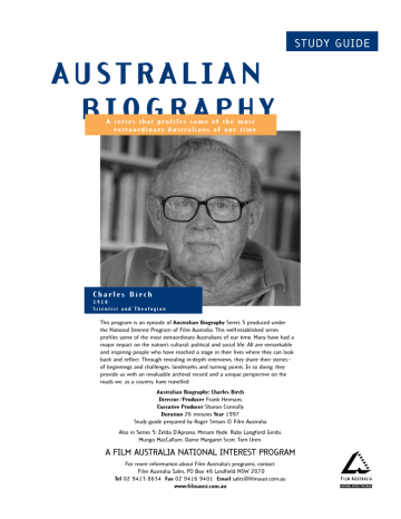 STUDY GUIDE australian biography A series that prof i l e s s o m e o f t h e m o s t extraordinary A u s t ra l i a n s o f o u r t i m e Charles Birch 1918– Scientist and Theologian This program is an episode of Australian Biography Series 5 produced under the National Interest Program of Film Australia. This well-established series profiles some of the most extraordinary Australians of our time. Many have had a major impact on the nation’s cultural, political and social life. All are remarkable and inspiring people who have reached a stage in their lives where they can look back and reflect. Through revealing in-depth interviews, they share their stories— of beginnings and challenges, landmarks and turning points. In so doing, they provide us with an invaluable archival record and a unique perspective on the roads we, as a country, have travelled. Australian Biography: Charles Birch Director/Producer Frank Heimans Executive Producer Sharon Connolly Duration 26 minutes Year 1997 Study guide prepared by Roger Stitson © Film Australia Also in Series 5: Zelda D’Aprano, Miriam Hyde, Ruby Langford Ginibi, Mungo MacCallum, Dame Margaret Scott, Tom Uren. A FILM AUSTRALIA NATIONAL INTEREST PROGRAM For more information about Film Australia’s programs, contact: Film Australia Sales, PO Box 46 Lindfield NSW 2070 Tel 02 9413 8634 Fax 02 9416 9401 Email [email protected] www.filmaust.com.au australian biography: CHARLES BIRCH SYNOPSIS Charles Birch has never shied away from tackling the big questions. As one of the world’s leading geneticists, he has had a hand in discoveries that have revolutionised our thinking. At the same time, he has applied his ever-questing intellect to one of the oldest questions of all—the search for God. As a boy in his native Melbourne, Birch took an early interest in the workings of the insect world and it was logical that he should go on to become an entomologist. At the Waite Institute in Adelaide he sought an explanation for the grasshopper plagues ravaging South Australia in the late 1930s—and received an early lesson in pragmatism when the farmers rejected his elegant solution because it did not suit them. The work gave him an interest in population ecology, a science he felt would allow him to follow his ideal of doing something to help his fellow men. At the same time, discussion with a close friend led to his search for a philosophy that could embrace both science and God, a quest that culminated in his belief in what he calls ‘an ecological model of God’. He went on to explore the inter-reaction of humanity with the environment, studying genetics at Chicago University then later at Oxford. In 1948 he returned to Australia to become senior lecturer in biology at Sydney University where, as Challis Professor of Biology, he was involved in laying the foundations for the new science of ecology—in the course of which he became a close friend of environmentalist Paul Ehrlich. During the Vietnam War, Birch took part in the anti-war campaigns and helped dissident students in their battles against conscription, which he strongly opposed. Meanwhile, he had written the landmark textbook, Confronting the Future. In 1990 he was awarded the prestigious Templeton Prize for Religion. Curriculum Links This program will have interest and relevance for teachers and students at secondary and tertiary levels. Curriculum links include Science, English, History, HSIE/SOSE, Health, Study of Religion and Human Relations. Vocabulary Write a definition for each of the following words and use each one in a meaningful sentence. g g g g g g g g g g entomology ecology environment evangelical genetics theology supernatural interventionist philosophy conscription After Watching What do you recall from viewing the program? What is Charles Birch's view about the relative importance of genetic inheritance and environment on his life? g film australia 2 What is the title of the book, given to Charles by his mother, that had a major influence on him when young? Who was the author of the book? What career choice did he make as a result of reading this book? g Describe Charles's adolescent problems at school, and explain whether the school recognised and dealt with these problems. g Describe Charles's initial research in entomology, and its importance to the South Australian rural environment, when he went to the Waite Institute in Adelaide. g What was the name of the religious group Charles joined in Adelaide, and what was its importance to him as a scientist? g Name three non-scientific values, or 'virtues', that Charles, as a scientist, regarded as important in understanding the universe around him. g Which university did Charles continue his research at after leaving the Waite Institute? Name the important science textbook being published by that university at the time. g Summarise Charles's view about the importance and relevance of the study of ecology to the world. g What other scientific field, beyond the study of insects (entomology), did Charles realise it was necessary to pursue, and for what purpose? g Why did Charles find studying at Oxford University, in England, ‘awful’? g What was the title of the book Charles co-wrote with Professor Andrewartha? g Describe the work Charles did when he visited the Amazon in Brazil. g What was the title of the anti-Vietnam War protest group that Charles formed, and what was the group's purpose? g In Charles’s view, what has science done for theology? Why does he reject the concept of a ‘supernatural God’, a god that can intervene from the outside with ‘miracles’? g g Describe Charles’s ‘ecological model of God’. Why does Charles believe that the God of today is in some ways different from the God at the time of the ‘big bang’, when the universe first came into being? g g List three of the ‘popular books’ Charles has written. What are the three critical aspects that affect the environment? From Charles