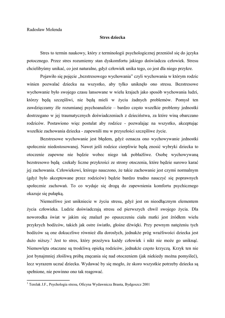 Radosław Molenda Stres dziecka Stres to termin naukowy, który z terminologii psychologicznej przeniósł się do języka potocznego. Przez stres rozumiemy stan dyskomfortu jakiego doświadcza człowiek. Stresu chcielibyśmy unikać, co jest naturalne, gdyż człowiek unika tego, co jest dla niego przykre. Pojawiło się pojęcie „bezstresowego wychowania” czyli wychowania w którym rodzic winien pozwalać dziecku na wszystko, aby tylko uniknęło ono stresu. Bezstresowe wychowanie było swojego czasu lansowane w wielu krajach jako sposób wychowania ludzi, którzy będą szczęśliwi, nie będą mieli w życiu żadnych problemów. Pomysł ten zawdzięczamy źle rozumianej psychoanalizie – bardzo często wszelkie problemy jednostki dostrzegano w jej traumatycznych doświadczeniach z dzieciństwa, za które winą obarczano rodziców. Postawiono więc postulat aby rodzice - pozwalając na wszystko, akceptując wszelkie zachowania dziecka - zapewnili mu w przyszłości szczęśliwe życie. Bezstresowe wychowanie jest błędem, gdyż oznacza ono wychowywanie jednostki społecznie niedostosowanej. Nawet jeśli rodzice cierpliwie będą znosić wybryki dziecka to otoczenie zapewne nie będzie wobec niego tak pobłażliwe. Osobę wychowywaną bezstresowo będą czekały liczne przykrości ze strony otoczenia, które będzie surowo karać jej zachowania. Człowiekowi, którego nauczono, że takie zachowanie jest czymś normalnym (gdyż było akceptowane przez rodziców) będzie bardzo trudno nauczyć się poprawnych społecznie zachowań. To co wydaje się drogą do zapewnienia komfortu psychicznego okazuje się pułapką. Niemożliwe jest unikniecie w życiu stresu, gdyż jest on nieodłącznym elementem życia człowieka. Ludzie doświadczają stresu od pierwszych chwil swojego życia. Dla noworodka świat w jakim się znalazł po opuszczeniu ciała matki jest źródłem wielu przykrych bodźców, takich jak ostre światło, głośne dźwięki. Przy pewnym natężeniu tych bodźców są one dokuczliwe również dla dorosłych, jednakże próg wrażliwości dziecka jest dużo niższy.1 Jest to stres, który przeżywa każdy człowiek i nikt nie może go uniknąć. Niemowlęta otaczane są troskliwą opieką rodziców, jednakże często krzyczą. Krzyk ten nie jest bynajmniej złośliwą próbą znęcania się nad otoczeniem (jak niekiedy można pomyśleć), lecz wyrazem uczuć dziecka. Wydawać by się mogło, że skoro wszystkie potrzeby dziecka są spełnione, nie powinno ono tak reagować. 1 Terelak J.F., Psychologia stresu, Oficyna Wydawnicza Branta, Bydgoszcz 2001 Dziecko w tym okresie nie tylko silniej reaguje na bodźce, ale również inaczej postrzega zdarzenia.2 Jeśli mama odeszła - to dla niemowlęcia odeszła ona na zawsze – stąd jego krzyk, który wyraża rozpacz. Twierdzono, iż stres małego dziecka jest porównywalny do stresu człowieka dorosłego w warunkach ekstremalnych np. wojny. Trudno jest jednoznacznie stwierdzić, czy tak jest naprawdę, jednak dzieci doświadczają bardzo przykrych uczuć. Dziecko musi nauczyć się nie tylko prawdy, że rodzic wróci, lecz czegoś więcej, musi nauczyć się nadziei, czyli tego, iż żadna przykrość nie trwa bez końca. Na okresie niemowlęctwa nie kończą się problemy i przykrości dzieci. Dzieci reagują nieproporcjonalnie silniej na wiele sytuacji. Przyjrzyjmy się – rozstanie z bliskimi, zastrzyk wywołują u nich bardzo silne emocje. Bardzo często jako dorośli lekceważymy je, gdyż wydają nam się one błahe i niepoważne. Niestety, nie mamy (zazwyczaj) racji, gdyż nie da się oceniać sytuacji stresu obiektywnie. To co dla nas wydaje się zbyt słabym bodźcem, aby stać się przyczyną stresu, dla dziecka może być bardzo groźne. Każdy z nas, gdy przypomni sobie ten okres swojego życia, może zobaczyć to w innej perspektywie. Gdy przypomnimy sobie swój pierwszy dzień w szkole (lub w przedszkolu), pierwszą wizytę u dentysty okazuje się, że te momenty w naszym życiu wiązały się z bardzo silnymi i nie zawsze przyjemnymi emocjami. Niestety, zapominamy o tym - i patrząc na problemy dzieci, patrzymy zwykle na nie z naszej perspektywy. Jest to błędem, gdyż stres jest zjawiskiem subiektywnym, uzależnionym od odczuć osoby, która go doświadcza. Badacze stresu próbowali wprawdzie kiedyś stworzyć listę stresujących wydarzeń i przyporządkować im siłę oddziaływania, jednakże okazało się, iż nie da się znaleźć czynników wywołujących stres (tzw. stresorów), które działałyby na każdego człowieka jednakowo.3 Nawet bardzo przykre sytuacje, takie jak śmierć osoby bliskiej wywierają różny wpływ na ludzi (jeden człowiek silnie je przeżywa, lecz po jakimś akceptuje to zdarzenie, inny przez długi czas nie potrafi się z nim pogodzić). Jeśli stresory wywierają odmienny wpływ na osoby dorosłe, to tym bardziej na dzieci. Z wpływu pewnych stresorów wyrastamy, przestajemy traktować je jako źródło silnego stresu. Dobrym przykładem są tu wzmiankowane wyżej zastrzyki czy zabiegi dentystyczne, których boi się większość dzieci, a dorośli...dorośli niekiedy również się ich 2 Harwas-Napierała B., Trempała J., (red. nauk.) Psychologia rozwoju człowieka. Charakterystyka okresów życia człowieka, T. 2, Wydawnictwo Naukowe PWN, Warszawa 2004. 3 Heszen-Niejodek I., Teoria stresu psychologicznego i radzenia sobie, W: Strelau J. (red.) Psychologia. Podręcznik akademicki. Jednostka w społeczeństwie i elementy psychologii stosowanej. tom 3, Gdańskie Wydawnictwo Psychologiczne, Gdańsk 2001 boją, tylko wstydzą się do tego przyznawać. Wyżej wymienione zabiegi były przedmiotem badań i dostarczyły one dość ciekawych wyników.4 Większość dzieci silnie przeżywa zastrzyk lub wizytę u dentysty, lecz w okresie dojrzewania część przestaje się ich bać. Jaki czynnik różnicuje te dwie grupy? Okazało się, że osoby, które w dzieciństwie były prze