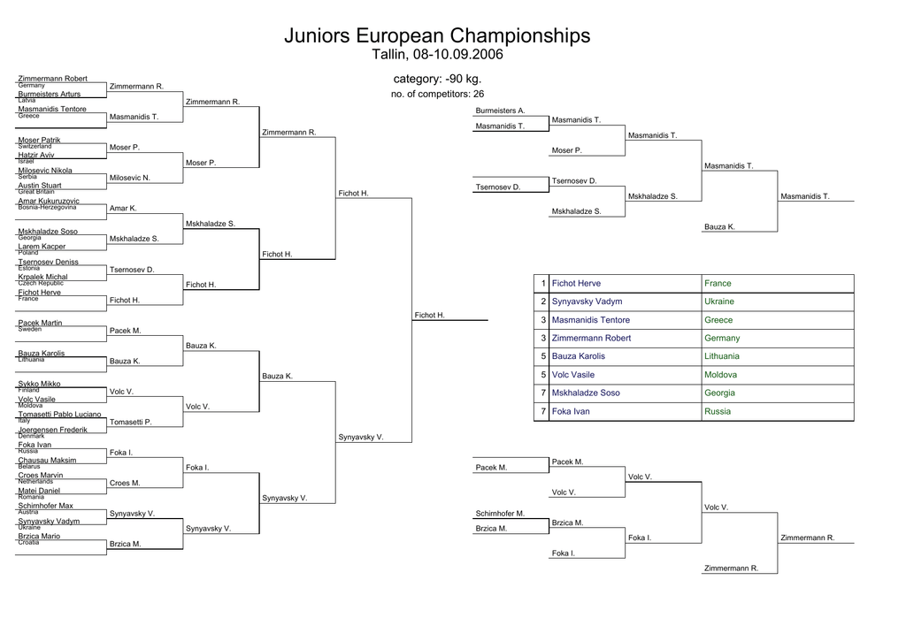 Juniors European Championships Tallin, 08-10.09.2006 Zimmermann Robert Germany Burmeisters Arturs Latvia Masmanidis Tentore Greece Moser Patrik Switzerland Hatzir Aviv Serbia Austin Stuart no. of competitors: 26 Zimmermann R. Burmeisters A. Masmanidis T. Bosnia-Herzegovina Mskhaladze Soso Georgia Larem Kacper Moser P. Moser P. Masmanidis T. Milosevic N. Estonia Krpalek Michal France Pacek Martin Sweden Bauza Karolis Lithuania Sykko Mikko Finland Volc Vasile Italy Joergensen Frederik Bauza K. Mskhaladze S. Fichot H. Tsernosev D. Fichot H. Fichot H. Fichot H. Pacek M. Bauza K. Bauza K. Bauza K. Volc V. Volc V. Russia Chausau Maksim Netherlands Matei Daniel Austria Synyavsky Vadym Foka I. Croatia Ukraine 3 Masmanidis Tentore Greece 3 Zimmermann Robert Germany 5 Bauza Karolis Lithuania 5 Volc Vasile Moldova 7 Mskhaladze Soso Georgia 7 Foka Ivan Russia Pacek M. Pacek M. Volc V. Croes M. Volc V. Synyavsky V. Synyavsky V. Ukraine Brzica Mario 2 Synyavsky Vadym Synyavsky V. Romania Schirnhofer Max France Foka I. Belarus Croes Marvin 1 Fichot Herve Tomasetti P. Denmark Foka Ivan Masmanidis T. Mskhaladze S. Mskhaladze S. Moldova Tomasetti Pablo Luciano Tsernosev D. Mskhaladze S. Amar K. Czech Republic Fichot Herve Tsernosev D. Fichot H. Poland Tsernosev Deniss Masmanidis T. Masmanidis T. Moser P. Great Britain Amar Kukuruzovic Masmanidis T. Zimmermann R. Israel Milosevic Nikola category: -90 kg. Zimmermann R. Volc V. Schirnhofer M. Synyavsky V. Brzica M. Brzica M. Foka I. Brzica M. Zimmermann R. Foka I. Zimmermann R.