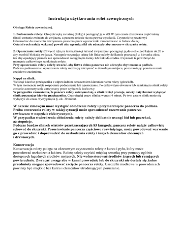 Instrukcja użytkowania rolet zewnętrznych Obsługa Rolety zewnętrznej. 1. Podnoszenie rolety: Chwycić ręką za taśmę (linkę) i pociągnąć ją w dół W tym czasie zluzowana część taśmy (linki) zostanie zwinięta do zwijacza, a pancerz uniesie się na pewną wysokość. Czynność tę powtórzyć kilkakrotnie do momentu zatrzymania pancerza przez ograniczniki zamontowane w listwie dolnej. Ostatni ruch należy wykonać powoli aby ograniczniki nie uderzyły zbyt mocno w skrzynkę rolety. 2. Opuszczanie rolety:Chwycić ręką za taśmę (linkę) tuż nad zwijaczem i pociągnąć ją do siebie pod kątem ok.20 o aby zwolnić blokadę zwijacza. Następnie trzymając taśmę lub linkę należy delikatnie przesunąć w kierunku okna, tak aby opadający pancerz nie spowodował wciągnięcia taśmy lub linki do środka. Czynność tę powtórzyć do momentu całkowitego zamknięcia rolety. Przy opuszczaniu rolety należy uważać, aby listwa dolna pancerza nie uderzyła zbyt mocno o podłoże. Podczas podnoszenia i opuszczania rolety można ją zatrzymać w dowolnym miejscu, pozostawiając pomieszczenie częściowo zacienione. Napęd na silnik. Wcisnąć klawisz przełącznika z odpowiednim oznaczeniem kierunku ruchu rolety (góra/dół). W tym momencie roleta rozpocznie podnoszenie lub opuszczanie. Po całkowitym otwarciu lub zamknięciu silnik rolety zostanie automatycznie zatrzymany przez wyłącznik krańcowy. W przypadku zauważenia, że pancerz rolety zatrzymał się, a silnik wciąż pracuje, należy natychmiast wyłączyć silnik puszczając klawisz przełącznika. Czas ciągłej pracy silnika wynosi 4 minut. Po tym czasie silnik może się wyłączyć do czasu wystygnięcia tj. ok. 30 minut. W okresie zimowym może wystąpić oblodzenie rolety i przymarznięcie pancerza do podłoża. Próba otworzenia rolety w takiej sytuacji może spowodować rozerwanie pancerza (zwłaszcza w napędzie elektrycznym). W przypadku stwierdzenia oblodzenia rolety należy delikatnie usunąć lód lub poczekać, aż stopnieje. Podczas bardzo silnych wiatrów przekraczających 85 km/godz, pancerz rolety należy całkowicie schować do skrzynki. Pozostawienie pancerza częściowo rozwiniętego, może powodować wyrwanie go z prowadnic i doprowadzić do uszkodzenia rolety i innych elementów okiennych i drzwiowych. Konserwacja Konserwacja rolety polega na okresowym czyszczeniu rolety z kurzu i pyłu, który może powodować uszkodzenia lakieru. Roletę należy czyścić miękką szmatką przy pomocy ogólnie dostępnych łagodnych środków myjących. Nie wolno stosować środków żrących lub rysujących powierzchnie. Zwracać uwagę aby w kanał prowadnic lub do skrzynki nie dostały się żadne przedmioty mogące spowodować zacięcie pancerza rolety. Uszczelki środkowe w prowadnicach powinny być miękkie bez kurzu i elementów utrudniających poruszanie. Zasady bezpieczeństwa 1. Nie dopuścić do całkowitego wciągnięcia pancerza do skrzynki rolety. 2. Nie dopuścić do przewinięcia pancerza na rurze nawojowej rolety podczas opuszczania. 3. Nie należy przerywać pracy rolety podczas jej otwierania i zamykania. 4. Należy zwrócić szczególną uwagę, aby pancerz rolety nie napotkał przeszkody podczas opuszczania. 5. Podczas użytkowania rolety należy zwracać uwagę na stan taśmy lub linki. Ich uszkodzenie może spowodować samoczynnie opadnięcie pancerza i uszkodzenie elementów rolety. 6. W przypadku spostrzeżenia uszkodzeń części rolety lub nieprawidłowości w jej działaniu, należy natychmiast zaprzestać jej użytkowania i niezwłocznie powiadomić serwis. 7. Wszelkie prace związane z naprawą rolety lub wymianą uszkodzonych części, może wykonać tylko przeszkolona osoba. Samodzielne próby naprawy skutkują utratą gwarancji. 8. Emisja hałasu przez roletę nie jest uważana za znaczące zagrożenie i jest kwestią komfortu. Poziom emisji ciśnienia akustycznego jest niższy lub równy 70dB. 9. Zabrania się przesuwania pancerza rolety w górę za pomocą rąk lub jakichkolwiek narzędzi. 10. Prosimy nie odłączać rolety od źródła prądu podczas czynności konserwacyjnych w obrębie połączeń elektrycznych grozi porażeniem.