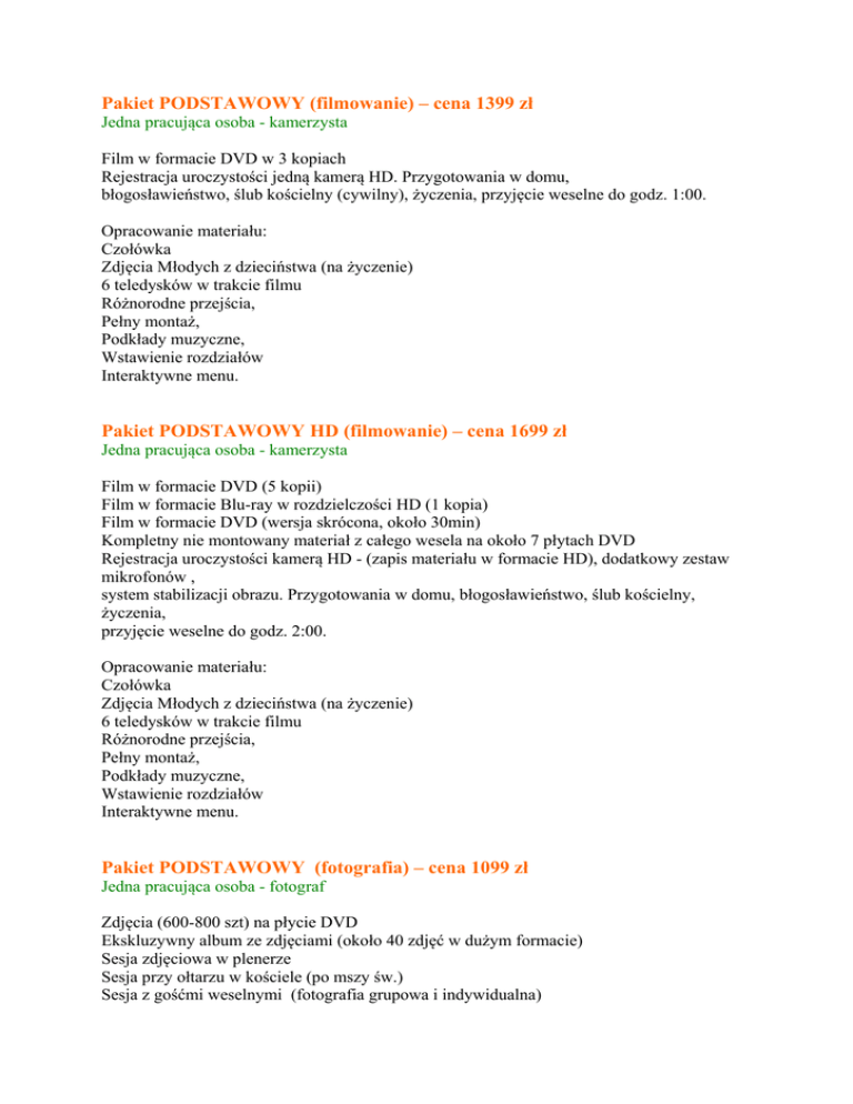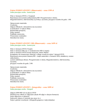 Pakiet PODSTAWOWY (filmowanie) – cena 1399 zł Jedna pracująca osoba - kamerzysta Film w formacie DVD w 3 kopiach Rejestracja uroczystości jedną kamerą HD. Przygotowania w domu, błogosławieństwo, ślub kościelny (cywilny), życzenia, przyjęcie weselne do godz. 1:00. Opracowanie materiału: Czołówka Zdjęcia Młodych z dzieciństwa (na życzenie) 6 teledysków w trakcie filmu Różnorodne przejścia, Pełny montaż, Podkłady muzyczne, Wstawienie rozdziałów Interaktywne menu. Pakiet PODSTAWOWY HD (filmowanie) – cena 1699 zł Jedna pracująca osoba - kamerzysta Film w formacie DVD (5 kopii) Film w formacie Blu-ray w rozdzielczości HD (1 kopia) Film w formacie DVD (wersja skrócona, około 30min) Kompletny nie montowany materiał z całego wesela na około 7 płytach DVD Rejestracja uroczystości kamerą HD - (zapis materiału w formacie HD), dodatkowy zestaw mikrofonów , system stabilizacji obrazu. Przygotowania w domu, błogosławieństwo, ślub kościelny, życzenia, przyjęcie weselne do godz. 2:00. Opracowanie materiału: Czołówka Zdjęcia Młodych z dzieciństwa (na życzenie) 6 teledysków w trakcie filmu Różnorodne przejścia, Pełny montaż, Podkłady muzyczne, Wstawienie rozdziałów Interaktywne menu. Pakiet PODSTAWOWY (fotografia) – cena 1099 zł Jedna pracująca osoba - fotograf Zdjęcia (600-800 szt) na płycie DVD Ekskluzywny album ze zdjęciami (około 40 zdjęć w dużym formacie) Sesja zdjęciowa w plenerze Sesja przy ołtarzu w kościele (po mszy św.) Sesja z gośćmi weselnymi (fotografia grupowa i indywidualna) Opracowanie materiału: postprodukcja podstawowa (balans kolorów, jasność, kontrast, nasycenie, wyostrzanie, maskowanie) wszystkich wybranych zdjęć, postprodukcja profesjonalna (pełen retusz, symulowanie głębi ostrości) wybranych zdjęć, postprodukcja kreacyjna (efekty specjalne, sepia, czarno-białe, inne) wybranych zdjęć. Pakiet PREMIUM mini (filmowanie + fotografia) – cena 1799 zł Dwie pracujące osoby - kamerzysta i fotograf Film w formacie DVD w 2 kopiach Rejestracja uroczystości jedną kamerą HD, dodatkowy zestaw mikrofonów, system stabilizacji obrazu. Przygotowania w domu, błogosławieństwo, ślub kościelny (cywilny), życzenia, przyjęcie weselne do godz. 1:00. Opracowanie materiału filmowego: Czołówka Zdjęcia Młodych z dzieciństwa (na życzenie) 6 teledysków w trakcie filmu Różnorodne przejścia, Pełny montaż, Podkłady muzyczne, Wstawienie rozdziałów Interaktywne menu. Zdjęcia (400-600 szt) na płycie DVD Sesja przy ołtarzu w kościele (po mszy św.) Sesja z gośćmi weselnymi po oczepinach (fotografia grupowa i indywidualna) Przygotowania w domu, błogosławieństwo, ślub kościelny (cywilny), życzenia, przyjęcie weselne do godz. 1:00 Opracowanie materiału: postprodukcja podstawowa (balans kolorów, jasność, kontrast, nasycenie, wyostrzanie, maskowanie) wszystkich wybranych zdjęć, postprodukcja profesjonalna (pełen retusz, symulowanie głębi ostrości) wybranych zdjęć, postprodukcja kreacyjna (efekty specjalne, sepia, czarno-białe, inne) wybranych zdjęć. Pakiet PREMIUM HD !!! (filmowanie + fotografia) – cena 1999 zł Dwie pracujące osoby - kamerzysta i fotograf Film w formacie DVD (5 kopii) nowość w tym pakiecie !!! Film w formacie Blu-ray w rozdzielczości HD (1 kopia) Rejestracja uroczystości kamerą HD - (zapis materiału w formacie HD), dodatkowy zestaw mikrofonów , system stabilizacji obrazu. Przygotowania w domu, błogosławieństwo, ślub kościelny, życzenia, przyjęcie weselne do godz. 2:00. Opracowanie materiału filmowego: Czołówka Zdjęcia Młodych z dzieciństwa (na życzenie) 8 teledysków w trakcie filmu Różnorodne przejścia, Pełny montaż, Podkłady muzyczne, Wstawienie rozdziałów Interaktywne menu. Zdjęcia (600-800 szt) na płycie DVD Ekskluzywny album ze zdjęciami (około 40 zdjęć) Sesja zdjęciowa w plenerze w minimum 3 lokalizacjach Mała sesja przy ołtarzu w kościele (po mszy św.) Mała sesja z gośćmi weselnymi po oczepinach (fotografia grupowa i indywidualna) Opracowanie materiału: postprodukcja podstawowa (balans kolorów, jasność, kontrast, nasycenie, wyostrzanie, maskowanie) wszystkich wybranych zdjęć, postprodukcja profesjonalna (pełen retusz, symulowanie głębi ostrości) wybranych zdjęć, postprodukcja kreacyjna (efekty specjalne, sepia, czarno-białe, inne) wybranych zdjęć. Pakiet LUXUSOWY (filmowanie i fotografia) – cena 2699zł Dwie pracujące osoby - kamerzysta i fotograf Film w formacie DVD (5 kopii) Film w formacie Blu-ray w rozdzielczości HD (1 kopia) Kompletny nie montowany materiał z całego wesela na około 7 płytach DVD Rejestracja uroczystości kamerą HD - (zapis materiału w formacie HD), dodatkowy zestaw mikrofonów , system stabilizacji obrazu. Przygotowania w domu, błogosławieństwo, ślub kościelny, życzenia, przyjęcie weselne do godz. 2:00. Opracowanie materiału filmowego: Czołówka Zdjęcia Młodych z dzieciństwa (na życzenie) Różnorodne przejścia, Pełny montaż, Podkłady muzyczne, 6-9 teledysków Wstawienie rozdziałów Interaktywne menu. Zdjęcia (800-1000 szt) na płycie DVD Dwa ekskluzywne albumy ze zdjęciami z sesji plenerowej i reportażu (około 120 zdjęć) Sesja zdjęciowa w plenerze w minimum 3 lokalizacjach Sesja przy ołtarzu w kościele (po mszy św.) Sesja z gośćmi weselnymi po oczepinach (fotografia grupowa i indywidualna) Film zmontowany ze zdjęć przedstawiający historię dnia ślubu (około 20min) Fotoportret pary młodej w formacie 40x60 cm w szklanej antyramie Opracowanie materiału: postprodukcja podstawowa (balans kolorów, jasność, kontrast, nasycenie, wyostrzanie, maskowanie) wszystkich wybranych zdjęć, postprodukcja profesjonalna (pełen retusz, symulowanie głębi ostrości) wybranych zdjęć, postprodukcja kreacyjna (efekty specjalne, sepia, czarno-białe, inne) wybranych zdjęć.