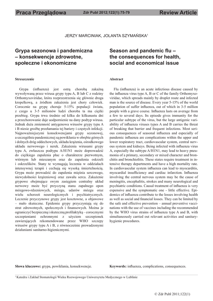 Praca Przeglądowa Zdr Publ 2012;122(1):75-79 Review Article JERZY MARCINIAK, JOLANTA SZYMAŃSKA1 Grypa sezonowa i pandemiczna – konsekwencje zdrowotne, społeczne i ekonomiczne Season and pandemic flu – the consequences for health, social and economical issue Streszczenie Abstract Grypa (influenza) jest ostrą chorobą zakaźną wywoływaną przez wirusa grypy typu A, B lub C z rodziny Orthomyxoviridae, która rozprzestrzenia się głównie droga kropelkową, a źródłem zakażenia jest chory człowiek. Corocznie na grypę choruje 5-15% populacji świata, z czego u 3-5 milionów ludzi choroba ta ma ciężki przebieg. Grypa trwa średnio od kilku do kilkunastu dni a przechorowanie daje uodpornienie na dany podtyp wirusa. Jednak duża zmienność antygenowa wirusów grypy typu A i B niesie groźbę przełamania tej bariery i częstych infekcji. Najpoważniejszymi konsekwencjami grypy sezonowej, a szczególnie pandemicznej są powikłania w obrębie górnych i dolnych dróg oddechowych, układu krążenia, ośrodkowego układu nerwowego i nerek. Zakażenia wirusami grypy typu A, zwłaszcza podtypu A/H1N1 może doprowadzić do ciężkiego zapalenia płuc o charakterze pierwotnym, wtórnym lub mieszanym oraz do zapalenia oskrzeli i oskrzelików. Stany te wymagają leczenia w oddziałach intensywnej terapii i cechują się wysoką śmiertelnością. Grypa może prowadzić do zapalenia mięśnia sercowego, niewydolności krążeniowej oraz zawału serca. Zakażenie grypowe obejmujące swym zasięgiem centralny układ nerwowy może być przyczyną stanu zapalnego opon mózgowo-rdzeniowych, mózgu, udarów mózgu oraz wielu schorzeń neurologicznych i psychiatrycznych. Leczenie przyczynowe grypy jest kosztowne, a objawowe – mało skuteczne. Epidemie grypy przyczyniają się do strat zdrowotnych, społecznych i finansowych. Można je ograniczyć bezpieczną i skuteczną profilaktyką – corocznymi szczepieniami ochronnymi z użyciem szczepionek zawierających rekomendowane przez WHO szczepy wirusów grypy typu A i B, z równocześnie prowadzonymi działaniami sanitarno-higienicznymi. Flu (influenza) is an acute infectious disease caused by the influenza virus type A, B or C of the family Orthomyxoviridae, which spreads mainly by droplet route and infected man is the source of disease. Every year 5-15% of the world population of suffer influenza, out of which in 3-5 million people with a grave course. Influenza lasts on average from a few to several days. Its episode gives immunity for the particular subtype of the virus, but the large antigenic variability of influenza viruses types A and B carries the threat of breaking that barrier and frequent infections. Most serious consequences of seasonal influenza and especially of pandemic influenza are complications within the upper and lower respiratory tract, cardiovascular system, central nervous system and kidneys. Being infected with influenza virus A, especially the subtype A/H1N1, may lead to heavy pneumonia of a primary, secondary or mixed character and bronchitis and bronchiolitis. These states require treatment in intensive therapy departments and have a high mortality rate. In cardiovascular system influenza can lead to myocarditis, myocardial insufficiency and cardiac infarction. Influenza involving the central nervous system may be the cause of meningitis, encephalitis, strokes and many neurological and psychiatric conditions. Causal treatment of influenza is very expensive and the symptomatic one - little effective. Epidemics of influenza contribute to the losses involving health as well as social and financial losses. They can be limited by the safe and effective prevention – annual preventive vaccinations with the use of vaccines including the recommended by the WHO virus strains of influenza type A and B, with simultaneously carried out relevant activities and sanitaryhygienic procedures. Słowa kluczowe: grypa, powikłania, konsekwencje. Keywords: influenza, complications, consequences. 1 Katedra i Zakład Stomatologii Wieku Rozwojowego Uniwersytetu Medycznego w Lublinie © Zdr Publ 2011;122(1) 76 Wprowadzenie W klimacie umiarkowanym na przełomie lato/jesień, wraz ze zmianą pogody oraz dużymi różnicami temperatur, istnieją sprzyjające warunki do rozwoju infekcji górnych i dolnych dróg oddechowych. Wśród drobnoustrojów będących przyczyną tych zakażeń dominują wirusy oddechowe – wirusy grypy typu A, B, C (Ortomyxoviridae), parainfluenzy (typ 1, 2, 3, 4), RSV, rhinovirusy, adenowirusy, koronawirusy, enterowirusy, meta-pneumowirusy i inne. Według Światowej Organizacji Zdrowia (WHO) coroczne zachorowania na infekcje grypowe i grypopodobne dotyczą 5-15% populacji świata. Prawie miliard ludzi walczy z infekcją, przy czym u 3-5 milionów chorych przebieg jest ciężki i wymagają oni bardziej intensywnego leczenia lub hospitalizacji. Każdego roku odnotowuje się ponad 250.000 zgonów, a w okresach zwiększonej wirulencji nawet dwukrotnie więcej [1]. Grypa jest ściśle zdefiniowaną, poważną chorobą zakaźną wywołaną przez wirusy grypy A, B, i C, która szerzy się głównie drogą kropelkową. Najbardziej niebezpieczne dla ludzi są wirusy grypy typu A i podtypy epidemiczne i pandemiczne A/H1N1, A/H2N2, A/H3N2. Mogą one zakażać także niektóre gatunki ssaków (świnie, konie, norki, foki, walenie) i ptaków. Głównym rezerwuarem wirusów grypy typu A, głównie podtypów A/H5N1, A/H9N2, A/H7N7, jest dzikie ptactwo wodne i ptactwo domowe. Zarażone ptactwo domowe stanowi źródło infekcji dla innych zwierząt, najczęściej świń, w organizmach których mają miejsce mutacje prowadzące do powstania szczepów potencjalnie pandemicznych. Wirusy grypy typu B atakują wyłącznie człowieka, będąc przyczyną grypy o nieco łagodniejszym przebiegu w porównaniu do zakażeń powodowanych przez wirusa typu A. Wirusy grypy typu B odpowiedzialne są za występowanie epidemii, rzadko pandemii. Najbar