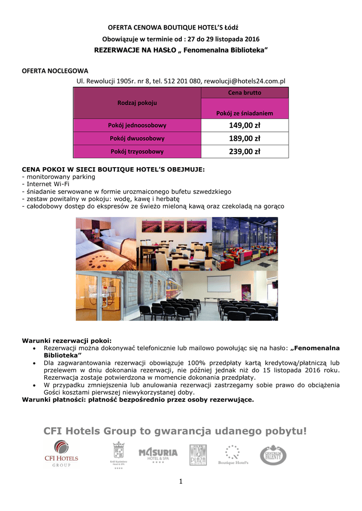 OFERTA CENOWA BOUTIQUE HOTEL’S Łódź Obowiązuje w terminie od : 27 do 29 listopada 2016 REZERWACJE NA HASŁO „ Fenomenalna Biblioteka” OFERTA NOCLEGOWA Ul. Rewolucji 1905r. nr 8, tel. 512 201 080, [email protected] Cena brutto Rodzaj pokoju Pokój ze śniadaniem Pokój jednoosobowy 149,00 zł Pokój dwuosobowy 189,00 zł Pokój trzyosobowy 239,00 zł CENA POKOI W SIECI BOUTIQUE HOTEL’S OBEJMUJE: - monitorowany parking - Internet Wi-Fi - śniadanie serwowane w formie urozmaiconego bufetu szwedzkiego - zestaw powitalny w pokoju: wodę, kawę i herbatę - całodobowy dostęp do ekspresów ze świeżo mieloną kawą oraz czekoladą na gorąco Warunki rezerwacji pokoi: Rezerwacji można dokonywać telefonicznie lub mailowo powołując się na hasło: „Fenomenalna Biblioteka” Dla zagwarantowania rezerwacji obowiązuje 100% przedpłaty kartą kredytową/płatniczą lub przelewem w dniu dokonania rezerwacji, nie później jednak niż do 15 listopada 2016 roku. Rezerwacja zostaje potwierdzona w momencie dokonania przedpłaty. W przypadku zmniejszenia lub anulowania rezerwacji zastrzegamy sobie prawo do obciążenia Gości kosztami pierwszej niewykorzystanej doby. Warunki płatności: płatność bezpośrednio przez osoby rezerwujące. CFI Hotels Group to gwarancja udanego pobytu! 1