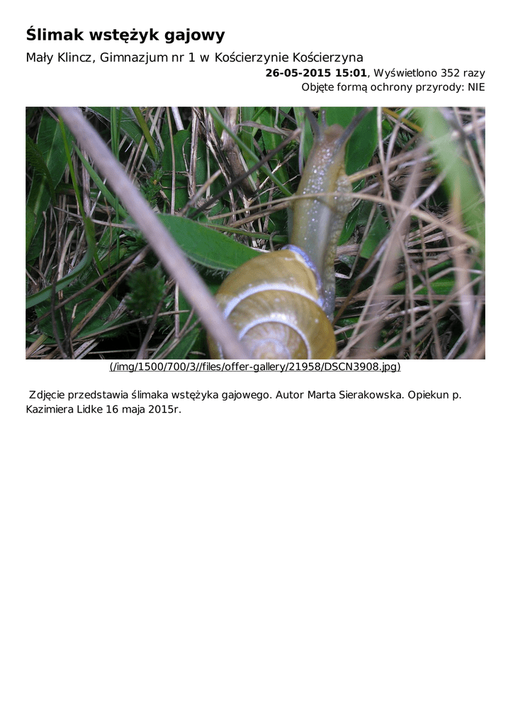 Ślimak wstężyk gajowy Mały Klincz, Gimnazjum nr 1 w Kościerzynie Kościerzyna 26-05-2015 15:01, Wyświetlono 352 razy Objęte formą ochrony przyrody: NIE (/img/1500/700/3//files/offer-gallery/21958/DSCN3908.jpg) Zdjęcie przedstawia ślimaka wstężyka gajowego. Autor Marta Sierakowska. Opiekun p. Kazimiera Lidke 16 maja 2015r.