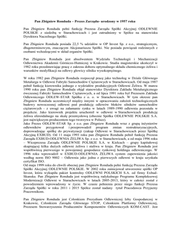 Pan Zbigniew Ronduda – Prezes Zarządu- urodzony w 1957 roku Pan Zbigniew Ronduda pełni funkcję Prezesa Zarządu Spółki Akcyjnej ODLEWNIE POLSKIE z siedzibą w Starachowicach i jest zatrudniony w Spółce na stanowisku Dyrektora Naczelnego Spółki. Pan Zbigniew Ronduda posiada 22,5 % udziałów w OP Invest Sp. z o.o., strategicznym, długoterminowym, znaczącym Akcjonariuszu Spółki. Nie posiada powiązań rodzinnych z osobami wchodzącymi w skład organów Spółki. Pan Zbigniew Ronduda jest absolwentem Wydziału Technologii i Mechanizacji Odlewnictwa Akademii Górniczo-Hutniczej w Krakowie. Studia magisterskie ukończył w 1982 roku przedstawiając pracę z zakresu doboru optymalnego składu chemicznego żeliwa i warunków modyfikacji na odlewy głowicy silnika wysokoprężnego. W roku 1982 pan Zbigniew Ronduda rozpoczął pracę jako technolog w Dziale Głównego Metalurga w Odlewni Fabryki Samochodów Ciężarowych w Starachowicach. Od maja 1987 pełnił funkcję kierownika jednego z wydziałów produkcyjnych Odlewni Żeliwa. W marcu 1990 roku pan Zbigniew Ronduda objął stanowisko Dyrektora Zakładu Metalurgicznego ówczesnej Fabryki Samochodów Ciężarowych, a od lipca 1991 roku był Prezesem Zakładu Odlewniczego ODLEW-STAR Spółka z o. o. w Starachowicach. W tym okresie pan Zbigniew Ronduda uczestniczył między innymi w opracowaniu założeń technologicznych budowy nowoczesnej odlewni pod produkcję odlewów bloków silników samochodów ciężarowych - z uwagi na załamanie rynku w latach 1989-1990 odlewnia pozostała w projekcie. Jako kierownik projektu uruchomił w odlewni w Starachowicach produkcję żeliwa sferoidalnego na skalę przemysłową (obecnie Spółka ODLEWNIE POLSKIE S.A. jest największym producentem tego tworzywa w Polsce). Jako Prezes ODLEW-STAR Sp. z o.o. pan Zbigniew Ronduda wraz z grupą inżynierów odlewników przygotował i przeprowadził program zmian restrukturyzacyjnych, doprowadzając spółkę do prywatyzacji (zakup Odlewni w Starachowicach przez Spółkę Akcyjną EXBUD). Od 11 maja 1993 roku pan Zbigniew Ronduda pełnił funkcję Prezesa Zarządu EXBUD-ODLEWNIA ŻELIWA Sp. z o.o. w Starachowicach, a od maja 1996 roku – Wiceprezesa Zarządu ODLEWNIE POLSKIE S.A. w Kielcach – grupy kapitałowej skupiającej kilka dużych odlewni żeliwa i staliwa w kraju. Pan Zbigniew Ronduda jest współtwórcą pierwszego w powojennej gospodarce rynkowej holdingu odlewniczego. W 1996 roku wprowadził w EXBUD-ODLEWNIA ŻELIWA system zapewnienia jakości według norm ISO 9002 – Odlewnia jako jedna z pierwszych odlewni w kraju uzyskała certyfikat ISO. Od maja 1999 roku do chwili obecnej pan Zbigniew Ronduda pełni funkcję Prezesa Zarządu Spółki Akcyjnej ODLEWNIE POLSKIE. W 2002 roku zainicjował utworzenie spółki OP Invest, która wykupiła pakiet kontrolny ODLEWNI POLSKICH S.A. od firmy ExbudSkanska. Pan Zbigniew Ronduda jest współtwórcą radykalnego Programu Kompleksowej Modernizacji Odlewni w Starachowicach w latach 2005-2013, który w całości został z powodzeniem wprowadzony w życie. W czasie pełnienia przez niego funkcji Prezesa Zarządu Spółki w roku 2011 i 2015 Spółce został nadany tytuł Pracodawca Przyjazny Pracownikom. Pan Zbigniew Ronduda jest Członkiem Prezydium Odlewniczej Izby Gospodarczej w Krakowie, Członkiem Zarządu Głównego STOP, Członkiem Platformy Odlewniczej, Prezesem Stowarzyszenia Producentów Komponentów Odlewniczych KOM-CAST. Jest również Przewodniczącym Rady Nadzorczej Spółki z ograniczoną odpowiedzialnością Odlewnia „ELZAMECH” z siedzibą w Elblągu, która ze względu na produkowany asortyment odlewów nie konkuruje na rynku z ODLEWNIAMI POLSKIMI S.A. Uczestniczył w pracach Zespołu Ekspertów Zewnętrznych Narodowego Programu Foresight Polska 2020. Pan Zbigniew Ronduda nie prowadzi działalności konkurencyjnej wobec Spółki Akcyjnej ODLEWNIE POLSKIE z siedzibą w Starachowicach jako wspólnik spółki cywilnej, spółki osobowej lub jako członek organu spółki kapitałowej i nie uczestniczy w innej konkurencyjnej osobie prawnej jako członek jej organu i nie jest wpisany do Rejestru Dłużników niewypłacalnych, prowadzonym na podstawie ustawy o KRS. Pan Leszek Walczyk – Wiceprezes Zarządu – urodzony w 1959 roku Pan Leszek Walczyk pełni funkcję Wiceprezesa Zarządu Spółki Akcyjnej ODLEWNIE POLSKIE z siedzibą w Starachowicach i jest zatrudniony w Spółce na stanowisku Dyrektora Finansowego. Pan Leszek Walczyk posiada 20% udziałów w OP Invest Sp. z o.o., strategicznym, długoterminowym, znaczącym Akcjonariuszu Spółki. Nie posiada powiązań rodzinnych z osobami wchodzącymi w skład organów Spółki. Pan Leszek Walczyk jest absolwentem Wydziału Ekonomiki i Organizacji Przemysłu Uniwersytetu Ekonomicznego w Krakowie. W roku 2002 zdał egzamin państwowy dla kandydatów na członków rad nadzorczych w spółkach Skarbu Państwa. W latach 1982-1985 pracował jako inspektor w Wydziale Przemysłu Urzędu Wojewódzkiego w Kielcach, w latach 1985-1987 pracował kolejno jako specjalista, Kierownik Zespołu Ekonomicznego, Główny Specjalista ds. Ekonomicznych, Zastępca Dyrektora Biura Ekonomicznego w Przedsiębiorstwie Eksportu Usług Technicznych EXBUD w Kielcach. W latach 1991-2001 był Dyrektorem Finansowym, Głównym Księgowym, Członkiem Zarządu, Wiceprezesem Zarządu EXBUD S.A., a następnie Prezesem Zarządu EXBUD SKANSKA S.A. w Kielcach. Od 2002 do maja 2015 roku pan Leszek Walczyk był Prezesem Zarządu OP Invest Sp. z o.o. Od 2002 roku do chwili obecnej jest Wiceprezesem Zarządu i Dyrektorem Finansowym Spółki. Pan Leszek Walczyk pełnił funkcje w organach nadzorczych następujących podmiotów: w latach 1991-2001 Wiceprzewodniczący i Przewodniczący Rady Nadzorczej Gdańskiego Przedsiębiorstwa Robót Drogowych w Gdańsku, w latach 1999-2001 Przewodniczący Rady Nadzorczej Kieleckiego Przedsiębiorstwa Robót Mostowych S.A. w Kielcach, w latach 1999-