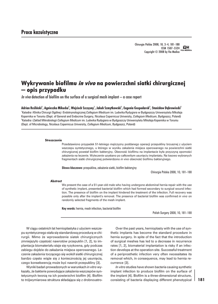 Praca kazuistyczna Chirurgia Polska 2008, 10, 3–4, 181–188 ISSN 1507–5524 Copyright © 2008 by Via Medica Wykrywanie biofilmu in vivo na powierzchni siatki chirurgicznej — opis przypadku In vivo detection of biofilm on the surface of a surgical mesh implant — a case report Adrian Reśliński1, Agnieszka Mikucka2, Wojciech Szczęsny1, Jakub Szmytkowski1, Eugenia Gospodarek2, Stanisław Dąbrowiecki1 1 Katedra i Klinika Chirurgii Ogólnej i Endokrynologicznej Collegium Medicum im. Ludwika Rydygiera w Bydgoszczy Uniwersytetu Mikołaja Kopernika w Toruniu (Dept. of General and Endocrine Surgery, Nicolaus Copernicus University, Collegium Medicum, Bydgoszcz, Poland) 2 Katedra i Zakład Mikrobiologii Collegium Medicum im. Ludwika Rydygiera w Bydgoszczy Uniwersytetu Mikołaja Kopernika w Toruniu (Dept. of Microbiology, Nicolaus Copernicus University, Collegium Medicum, Bydgoszcz, Poland) Streszczenie Przedstawiono przypadek 51-letniego mężczyzny poddanego operacji przepukliny brzusznej z użyciem wszczepu syntetycznego, u którego w wyniku zakażenia miejsca operowanego na powierzchni siatki chirurgicznej powstał biofilm bakteryjny. Obecność biofilmu na implantacie była przyczyną oporności zakażenia na leczenie. Wyleczenie uzyskano po całkowitym usunięciu implantatu. Na losowo wybranych fragmentach siatki chirurgicznej potwierdzono in vivo obecność biofilmu bakteryjnego. Słowa kluczowe: przepuklina, zakażenie siatki, biofilm bakteryjny Chirurgia Polska 2008, 10, 181–188 Abstract We present the case of a 51-year-old male who having undergone abdominal hernia repair with the use of synthetic implant, presented bacterial biofilm which had formed secondary to surgical wound infection. The presence of biofilm on the implant hindered the treatment of the infection. Full recovery was possible only after the implant’s removal. The presence of bacterial biofilm was confirmed in vivo on randomly selected fragments of the mesh implant. Key words: hernia, mesh infection, bacterial biofilm Polish Surgery 2008, 10, 181–188 W ciągu ostatnich lat hernioplastyka z użyciem wszczepu syntetycznego stała się standardową procedurą w chirurgii. Mimo że wprowadzenie siatek chirurgicznych zmniejszyło częstość nawrotów przepuklin [1, 2], to implantacja biomateriału staje się ryzykowna, gdy podczas zabiegu dojdzie do zakażania miejsca operowanego. Leczenie zakażenia toczącego się wokół siatki chirurgicznej bardzo często wiąże się z koniecznością jej usunięcia, czego konsekwencją może być nawrót przepukliny [3]. Wyniki badań prowadzonych w warunkach in vitro wykazały, że bakterie powodujące zakażenia wszczepów syntetycznych tworzą na ich powierzchni biofilm [4]. Biofilm to trójwymiarowa struktura składająca się z drobnoustro- Over the past years, hernioplasty with the use of synthetic implants has become the standard procedure in hernia surgery. In spite of the fact that the introduction of surgical meshes has led to a decrease in recurrence rates [1, 2], biomaterial implantation is risky if an infection develops at the operation site. Successful treatment of a periprosthetic infection very often necessitates its removal which, in consequence, may lead to hernia recurrence [3]. In vitro studies have shown bacteria causing synthetic implant infection to produce biofilm on the surface of the implant [4]. Biofilm is a three-dimensional structure, consisting of bacteria displaying different phenotypical 181 Adrian Reśliński et al. Biofilm in vivo and surgical mesh implant jów o zmienionych właściwościach fenotypowych w stosunku do postaci planktonicznej, otoczonych macierzą pozakomórkową i nieodwracalnie związanych z powierzchnią. Powstawanie biofilmu jest procesem wieloetapowym. Początkowo na powierzchni biomateriału pojawia się film białkowy (wielowymiarowe rusztowanie), który umożliwia kolonizację bakteryjną oraz przyłączanie komórek organizmu gospodarza. Drobnoustroje przemieszczają się w kierunku powierzchni implantu, gdzie zachodzi adhezja niespecyficzna uwarunkowana siłami fizycznymi. Konsekwencją przylegania niespecyficznego jest adhezja specyficzna z udziałem adhezyn i receptorów. Osiadłe bakterie wysyłają cząsteczki sygnałowe regulujące ekspresję wielu genów. Następuje zmiana metabolizmu komórkowego z planktonicznego na stacjonarny oraz wydzielanie polimerów zewnątrzkomórkowych. Powstała struktura biofilmu chroni bakterie przed mechanizmami obronnymi ustroju gospodarza oraz działaniem antybiotyków. Ponadto biofilm może ulec fragmentacji i odklejeniu, w efekcie czego bakterie rozprzestrzeniają się poprzez krew i stają się źródłem kolejnych ognisk zakażenia [5]. Polish Surgery 2008, 10, 3–4 traits than their planktonic forms, surrounded by an extracellular matrix and irreversibly attached to the surface. The formation of biofilm is a multi-stage process. First, a protein film (a multi-dimensional scaffolding) forms on the surface of the biomaterial, enabling bacterial colonization and the attachment of native cells. Microorganisms migrate towards the surface of the biomaterial, where non-specific adhesion occurs, based on physical forces. As a consequence of non-specific adhesion, adhesion and receptor-mediated specific adhesion takes place. The first colonists proceed to secrete signal particles, which serve to regulate the expression of many genes. A change of cellular metabolism from planktonic to stationary occurs, and the secretion of extracellular polymers takes place. The resulting biofilm structure protects the bacteria from the host’s immune mechanisms and antibiotics. Moreover, this biofilm may fragment and detach, leading to the bacteria spreading through the blood and forming secondary foci of infection [5]. Case report Opis przypadku Pacjent AN (28725/08), lat 51, został przyjęty w październiku 2008 roku do Kliniki Chirurgii Ogólnej i Endokrynologicznej Szpitala Uniwersyteck