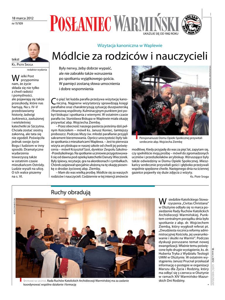 I 18 marca 2012 nr 11/109 UKAZUJE SIĘ OD 1982 ROKU Wizytacja kanoniczna w Waplewie Módlcie za rodziców i nauczycieli Były nerwy, żeby dobrze wypaść, ale nie zabrakło także wzruszenia po spotkaniu wyjątkowego gościa. W pamięci zostaną słowa umocnienia i dobre wspomnienia redaktor wydania W ielki Post przypomina nam, że życie składa się nie tylko z chwil radości i pomyślności, ale pojawiają się także przeszkody, które nas hartują. Na s. IV–V przedstawiamy historię Jadwigi Jurkiewicz, zasłużonej i wieloletniej katechetki ze Szczytna. Chciała zostać siostrą zakonną, ale tata się nie zgodził. Poświęciła jednak swoje życie Bogu i ludziom w inny sposób. Dramatyczne wydarzenia towarzyszą także w ostatnim czasie mieszkańcom Ostródy. Ludzie wyszli na ulicę. O ich walce piszemy na s. VI. Małgorzata Jaroszewska tekst Ks. Piotr Sroga C o pięć lat każda parafia przeżywa wizytację kanoniczną. Najpierw wizytatorzy sprawdzają księgi parafialne oraz charakteryzują sytuację duszpasterską i finansową wspólnoty. Kulminacyjnym punktem jest pobyt biskupa i spotkania z wiernymi. W ostatnim czasie parafia św. Stanisława Biskupa w Waplewie miała okazję przywitać abp. Wojciecha Ziembę. – Przez obecność naszego pasterza jesteśmy dziś pełnym Kościołem – mówił ks. Janusz Koniec, tamtejszy proboszcz. Podczas Mszy św. młodzi parafianie przyjęli sakrament bierzmowania. Oprócz uroczystości były także spotkania z mieszkańcami Waplewa. – Jest to pierwsza wizyta arcybiskupa w naszej szkole od chwili jej poświęcenia – mówił Krzysztof Szot, dyrektor Zespołu Szkolno-Przedszkolnego. Na spotkanie uczniowie przygotowywali się od dawna pod opieką katechetki Danuty Wieczorek. Były śpiewy, recytacje, gra na akordeonach i cymbałkach. Chórek zaśpiewał specjalnie ułożoną na tę okazję piosenkę o drodze życiowej abp. Ziemby. – Mam do was wielką prośbę. Módlcie się za waszych rodziców i nauczycieli. Codziennie w tej intencji zmówcie Beata Zembrzycka Ruchy obradują modlitwę. Kiedy przyjadę do was za pięć lat, zapytam się, czy spełniliście moją prośbę – mówił do zgromadzonych uczniów i przedszkolaków arcybiskup. Wzruszające były także odwiedziny w Domu Opieki Społecznej. Mieszkańcy serdecznie przywitali gości i głęboko przeżywali wspólnie spędzone chwile. Następnego dnia na ściennej gazetce pojawiły się duże zdjęcia z wizyty. Ks. Piotr Sroga W siedzibie Katolickiego Stowarzyszenia „Civitas Christiana” w Olsztynie odbyło się 10 marca posiedzenie Rady Ruchów Katolickich Archidiecezji Warmińskiej. Punktem centralnym porządku dnia było spotkanie z abp. dr. Wojciechem Ziembą, który wygłosił referat pt. „Dwudziesta rocznica reformy administracyjnej Kościoła, jej uwarunkowanie i skutki na Warmii”. Podczas dyskusji poruszano temat nowej ewangelizacji. Właśnie temu poświęcone było drugie wystąpienie, ks. dr. Huberta Tryka z Wydziału Teologii UWM w Olsztynie. W ostatnim wystąpieniu Janusz Prucnal przekazał informację o postępie w organizacji Marszu dla Życia i Rodziny, który ma odbyć się 3 czerwca w Olsztynie w ramach XIV Warmińsko-Mazurskich Dni Rodziny. • 18 marca 2012 Gość Niedzielny Spotkanie na szczycie. Rada Ruchów Katolickich Archidiecezji Warmińskiej ma za zadanie koordynować wspólne działanie i formację Pensjonariusze Domu Opieki Społecznej przywitali serdecznie abp. Wojciecha Ziembę posłaniec warmiński posłaniec warmiński Formacja kapłańska O lsztynek . W Galerii Muzeum Budownictwa Ludowego odbyły się autorskie spotkanie z ks. Adamem Bonieckim i promocja książki „Lepiej palić fajkę niż czarownice”. Alina Wołodkiewicz przedstawiła krótką notę biograficzną. Uczestnicy mogli wysłuchać „przepytywania” gościa przez Henrykę Żebrowską, prowadzącą rozmowę. Ks. Adam odpowiadał na pytania w sposób refleksyjny, z poczuciem humoru i z dystansem do siebie. Wśród podjętych tematów były kwestie wiary, Dobre Miasto. 28 marca w prastarej kolegiacie spotkali się na skupieniu kapłani należący do stowarzyszenia Unii Apostolskiej Kapłanów. Przybyło 19 duchownych. Nieszpory poprowadził ks. diakon Przemysław Chlewicki, kandydujący do stowarzyszenia. Konferencję wygłosił ks. bp dr Jacek Jezierski. Tematem było spojrzenie na dokumenty Soboru Watykańskiego II w związku ze zbliżającą się 50. rocznicą zwołania tego Soboru. Następnie ks. diakon Przemysław Chlewicki, odbywający praktykę duszpasterską w Dobrym Mieście, złożył zaprzysiężenie i został przyjęty do stowarzyszenia. Ku radości zebranych również ks. Radosław Czerwiński, tamtejszy wikariusz, został przyjęty do stowarzyszenia. Uczestnicy spotkania w tajnym głosowaniu wybrali nowy zarząd na czteroletnią kadencję. Do zarządu weszli: dyrektor – ks. Stanisław Zinkiewicz, sekretarz – ks. Edward Goliński, skarbnik – ks. Romuald Zapadka. Następnie w trakcie wystawienia Najświętszego Sakramentu poprowadzono medytację przeplataną wspólnym śpiewem pieśni eucharystycznych. Abp Wojciech Ziemba Gość spotkania wpisywał dedykacje do swojej książki Żywność do wzięcia Warmińską odbyły się w Nidzicy, Olsztynie, Kętrzynie i Braniewie. Zgromadzeni zapoznali się ze sposobami uzyskiwania pomocy żywnościowej dla potrzebujących w ramach tego programu. Wszelkie informacje na ten temat można uzyskać pod tel. 89 5236402 dem Wiele parafii w archidiecezji warmińskiej korzysta z pomocy unijnej dla potrzebujących Słowo metropolity warmińskiego z listu pasterskiego z okazji 20 rocznicy reformy administracji Kościoła w Polsce i zakończenia I Synodu Archidiecezji Warmińskiej. „Solidarność” w 3. postulacie domagała się wolności słowa, druku i publikacji. „Solidarność” wygrała, a wolność słowa? Ks. Edward Goliński Kapłani archidiecezji warmińskiej potrzebują także formacji, którą otrzymują 