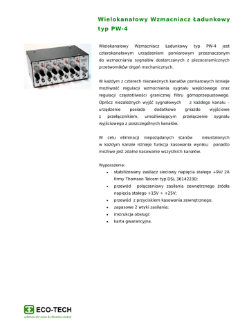 Wielokanałowy Wzmacniacz Ładunkowy typ PW-4 Wielokanałowy Wzmacniacz czterokanałowym urządzeniem Ładunkowy typ pomiarowym PW-4 jest przeznaczonym do wzmacniania sygnałów dostarczanych z piezoceramicznych przetworników drgań mechanicznych. W każdym z czterech niezależnych kanałów pomiarowych istnieje możliwość regulacji wzmocnienia sygnału wejściowego oraz regulacji częstotliwości granicznej filtru górnoprzepustowego. Oprócz niezależnych wyjść sygnałowych urządzenie z posiada przełącznikiem, dodatkowe umożliwiającym z każdego kanału – gniazdo wyjściowe przełączenie sygnału wyjściowego z poszczególnych kanałów. W celu eliminacji niepożądanych stanów nieustalonych w każdym kanale istnieje funkcja kasowania wyniku; ponadto możliwe jest zdalne kasowanie wszystkich kanałów. Wyposażenie: stabilizowany zasilacz sieciowy napięcia stałego +9V/ 2A firmy Thomson Telcom typ DSL 36142230; przewód połączeniowy zasilania zewnętrznego źródła napięcia stałego +15V ÷ +25V; przewód z przyciskiem kasowania zewnętrznego; zapasowe 2 wtyki zasilania; instrukcja obsługi; karta gwarancyjna. Dane techniczne Liczba kanałów pomiarowych 4 Zakres częstotliwości (-3 dB) 0,3 Hz ÷ 40 kHz Zakres pomiarowy przyśpieszenia drgań mechanicznych od 1 m/s2 do 3000 m/s2 Filtr górnoprzepustowy fg = 0,3 Hz, 1 Hz, 3 Hz, 10 Hz, 30 Hz Poziom szumów własnych < -68 dB re 1VRMS na wyjściu Tłumienie filtrów górnoprzepustowych w paśmie przepustowym < ± 0,2 dB Zakres wzmocnienia -10 dB ÷ + 60 dB Zniekształcenia własne < 0,01 % Przesłuch międzykanałowy < - 70 dB @ 160 Hz Impedancja wyjściowa < 10 Ω Maksymalne napięcie wyjściowe 28 Vp-p Maksymalna dopuszczalna wartość szczytowa napięcia wejściowego: Zabezpieczenie przed zakłóceniami EMI ± 100 Vp gniazda sygnałowe i gniazda zasilania zabezpieczone filtrami EMIFIL Złącza sygnałowe we/wy typu BNC Przełącznik kanałów wyjściowych 4 wyjścia kanałów/ 1 WY Warunki obciążenia wyjścia: maksymalna pojemność obciążenia: CL = 22 nF minimalna oporność obciążenia: RL = 10 kΩ Warunki środowiskowe użytkowania: zakres temperatury 0°C÷ 50°C zakres wilgotności 0 ÷ 80% RH - bez kondensacji pary wodnej Funkcja zdalnego sterowania kasowaniem odseparowanie galwaniczne obwodu sterowania, (Remote Reset Control) kasowanie jednoczesne w 4 kanałach zasilacz sieciowy +9V/ 0,3 A, lub źródło napięcia stałego Zasilanie o napięciu +15V ÷ 25V i prądzie min. 0,3 A Pobór prądu ok. 120 mA Wymiary (200x100x130) mm Masa 2,2 kg Zastrzegamy sobie prawo do zmian specyfikacji technicznej 0 3 - 3 1 0 Wa r s z a w a Te l . 2 2 3 7 8 3 9 2 2 [email protected] u l . ś w. J a c k a O d r o w ą ż a 9 Fa x 2 2 3 7 8 3 9 2 3 w w w. e c o t e c h . b i z . p l Rev 11/16