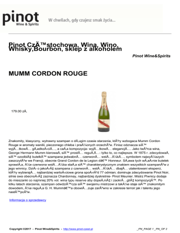 Pinot CzÄ™stochowa, Wina, Wino, Whisky,Bourbon, sklep z alkoholem Pinot Wine&Spirits MUMM CORDON ROUGE 179.00 zÅ‚ Znakomity, klasyczny, wytrawny szampan o dÅ‚ugim czasie starzenia, który wzbogaca Mumm Cordon Rouge w aromaty wanilii, pieczonego chleba i prażonych orzechów. Finisz odznacza siÄ™ wyjÄ…tkowÄ… gÅ‚adkoÅ›ciÄ…, a caÅ‚a kompozycja- wyjÄ…tkowÄ… elegancjÄ…. Jako twórca wina, George Hermann Mumm kierowaÅ‚ siÄ™ prostÄ… regułą- tylko to, co najlepsze. W 1875 r. zdecydowaÅ‚ siÄ™ ozodbić butelkÄ™ szampana jedwabnÄ… czerwonÄ… wstążkÄ…, symbolem najwyższych zaszczytów we Francji, obecnie Grand Cordon de la Legion d’ Honneur. SÅ‚awa tych wÅ‚aÅ›nie butelek sprawiÅ‚a, że czerwona wstążka staÅ‚a siÄ™ charakterystycznym znakiem wszystkich szampanów z jego winnicy. DziÅ› o jakość szampana z czerwonÄ… wstążkÄ… dbajÄ… utalentowani eksperci, który wybierajÄ… najbardziej wartoÅ›ciowe grona spoÅ›ród 77 odmian; dominuje zdecydowanie Pinot Noir, silnie swa obecność zaznacza Chardonnay, najbardziej dyskretnie- Pinot Meunier. Mistrz Piwnicy dodaje do mieszanki co najmniej 20% vol. wina typu reserve aby dopeÅ‚nić i zaokrÄ…glić kompozycjÄ™. Po kilku latach starzenia, szampan odwdziÄ™cza siÄ™ swojemu mistrzowi a także staje siÄ™ znakomitym dowodem, że reguÅ‚a G. H. Mumm’a obowiÄ…zuje zarówno w zakresie terroir jak i talentu jego nastÄ™pców. Informacja o sprzedawcy Copyright ©2017 - Pinot Wine&Spirits - http://www.pinot-czest.pl _PN_PAGE 1 _PN_OF 2 Recenzje klientów: Nikt jeszcze nie recenzowaÅ‚ tego produktu. Aby dodać recenzjÄ™, zaloguj siÄ™. Copyright ©2017 - Pinot Wine&Spirits - http://www.pinot-czest.pl _PN_PAGE 2 _PN_OF 2