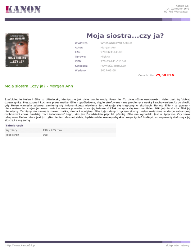 Kanon s.c. Ul. Zamiany 16/2 02-786 Warszawa Moja siostra...czy ja? Wydawca: WYDAWNICTWO AMBER Autor: Morgan Ann EAN: 9788324161188 Oprawa: Miękka ISBN: 978-83-241-6118-8 Kategoria: POWIEŚĆ,THRILLER Wydano: 2017-02-08 Cena brutto: 29,50 PLN Moja siostra...czy ja? - Morgan Ann Sześcioletnie Helen i Ellie to bliźniaczki, identyczne jak dwie krople wody. Pozornie. To dwie różne osobowości. Helen jest tą 'dobrą' dziewczynką. Pieszczona i kochana przez matkę. Ellie - upośledzona, ciągle strofowana - ma problemy z nauką i zachowaniem.Aż do chwili, gdy Helen wymyśla zabawę: zamienią się imionami.Lecz niewinny żart okazuje się tragiczny w skutkach. Bo oto Ellie - ta gorsza nieoczekiwanie przejmuje dowodzenie i odmawia powrotu do swojej tożsamości.Tak zaczyna się koszmar Helen. Nikt jej nie słucha. Nikt jej nie wierzy. Zamiany nie zauważa nawet matka, zimna i obojętna. Ellie żyje udanym życiem siostry. Helen uwięziona w klatce zaburzonej osobowości coraz bardziej traci świadomość tego, kim jest.Dwadzieścia pięć lat później. Ellie ma wypadek. Jest w śpiączce. Czy teraz udręczona Helen, która jest już tylko cieniem dawnej siebie, będzie miała szansę odzyskać swoje życie? I odkryć, co naprawdę stało się z jej siostrą i z nią samą. Tabela cech Wymiary 130 x 205 mm Ilość stron 368 http://www.kanon24.pl sklep internetowy