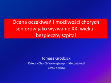 Ocena oczekiwań i możliwości chorych seniorów jako wyzwanie XXI wieku bezpieczny szpital Tomasz Grodzicki Katedra Chorób Wewnętrznych i Gerontologii CMUJ Kraków The good physician treats the disease, the great physician treats the patient who has the disease” Sir William Osler Liczba osób w Polsce w wieku 75 lat i więcej według Rocznika Demograficznego GUS 2014 ( w tysiącach) W okresie 1980-2013 liczba osób, które ukończyły 80 lat zwiększyła się z 522 tysięcy (1980) do 1483 tysięcy (2013) ! Hospitalizacje w Polsce Raport NFZ 2009 Struktura wieku mieszkańców i pacjentów w wieku starszym w Małopolsce wg NFZ Liczba pacjentów, hospitalizacji i koszty hospitalizacji w wieku starszym (60+) w Małopolsce wg NFZ Ryzyko chorób niezakaźnych (NCD) na przestrzeni życia Age PA: physical activity SEP: socio-economic position Aboderin , Kalache.A WHO, 2002 Częstość współwystępowania schorzeń u osób starszych 30 25 20 55-59 15 >65 10 5 0 0 1 2 3 4 5 6 7 8 9 10 The Dysfunctional Syndrome Osoba starsza sprawna Ostre schorzenie Hospitalizacja Nieprzyjazne otoczenie Depersonalizacja Unieruchomienie Głodzenie Leki Procedury Obniżenie nastroju/ delirium Pogorszenie sprawności Osoba starsza niesprawna Palmer et al. Clin Ger Med 1998 “Cascade to Dependency” Creditor. Ann Int Med. 1993. Procent osób starszych wymagających pomocy w codziennych aktywnościach (np. mycie, ubieranie, korzystanie z toalety, jedzenie) i czynnościach złozonych (zakupy, przygotowanie posiłków, kontrola rachunków) z powodu obecności schorzeń przewlekłych Solid bars denote basic activities, and hatched bars homemanagement activities Rowe JW. N Engl J Med 1985;312:827-835. Wykonywanie złożonych czynności życia codziennego w skali Lawtona iADL wśród badanych w wieku 65 lat i powyżej w Polsce Procent osób wykazujących wybrane zespoły geriatryczne w populacji POLSENIOR Analizowane zespoły: Zaburzenie wzroku, Zaburzenia słuchu, Demencja , Depresja, Upadki, Zależność funkcjonalna , Niesprawność zwieraczy, Niedożywienie Piotrowicz K i wsp. dane niepublikowane Functional limitations of subjects with history of heart failure hospitalisation Wpływ hospitalizacji na sprawność funkcjonalną Sager i wsp 1996 Zmiana w stanie funkcjonalnym po rozpoczęciu dializ Kurella Tamura M et al. N Engl J Med 2009;361:1539-1547 Powikłania hospitalizacji – pogorszenie sprawności 2000 chorych ≥ 70 r.ż. przyjętych do oddziałów ogólnych A. 45% chorych utrzymało sprawność ADL sprzed 2 tygodni przed zachorowaniem, B. 20% chorych utraciło sprawność, ale następnie ją odzyskało do wypisu C. 35% chorych nie odzyskało utraconej sprawności Covinsky KE i wsp. JAGS 2003, 51, 451 Upadki w szpitalach 2-12% doświadcza upadku w szpitalu 30% z niewielkim urazem, 4% ze poważnym urazem Zwiększone koszty hospitalizacji ($4233) Wydłużony czas pobytu w szpitalu (12 dni) Gorsza jakość życia i sprawność przy wypisie JAGS 2007;56:29-36 EPIDEMIOLOGIA DELIRIUM Delirium - częstość Szpital: • Przy przyjęciu 10-40% • W trakcie pobytu 15-60% Po zabiegu operacyjnym: 15-53% OIOM: 70-87% Delirium - Śmiertelność Wewnątrzszpitalna: 22-76% 1-roczna śmiertelność: 35-40% Delirium i funkcja poznawcza po zabiegu kardiochirurgicznym. • W obserwacji prospektywnej: • 46% pacjentów kardiochirurgii rozwinęło delirum po zabiegu • Po 6 miesiącach jedynie 60% powróciło do stanu wyjściowego w porównaniu z 76 % chorych bez delirium Saczynski JS et al. N Engl J Med 2012;367:30-39 Powikłania hospitalizacji - delirium 118 chorych ≥ 65 r.ż. przyjętych do OIOM • Ocena przy przyjęciu, w trakcie pobytu i 7 dni po wypisie • Tylko 45 chorych prawidłowe funkcje poznawcze • U 83 tj. 70% - majaczenie – U 37 tj. 31% - w trakcie pobytu – U 40% po wypisie z OIOM • U chorych z otępieniem ryzyko majaczenia 40% wyższe Mc Nicol i wsp. JAGS 2003, 51, 591-8 Adverse Drug Reactions Inpatient Elderly •Prospective, observational design ADR in the very elderly (≥80 years old) Preventability, severity and type of ADR •560 pts (mean 85 yrs; 63% female) 1 in 8 experienced ADR Majority serious (69%) some lifethreatening(4%) 63% preventable Tangiisuran et al; J Nutr HealthAgeing.2009 Najczęstsze infekcje wewnątrzszpitalne – czynniki ryzyka URINARY TRACT INFECTIONS Urinary catheter Urinary invasive procedures 34% 13% Advanced age Severe underlying disease Urolitiasis Pregnancy Diabetes Mechanical ventilation Aspiration Nasogastric tube Central nervous system depressants Antibiotics and anti-acids Prolonged health-care facilities stay Malnutrition Advanced age Surgery Immunodeficiency SURGICAL SITE INFECTIONS BLOOD INFECTIONS Inadequate antibiotic prophylaxis Incorrect surgical skin preparation Inappropriate wound care Surgical intervention duration Type of wound Poor surgical asepsis Diabetes Nutritional state Immunodeficiency Lack of training and supervision LOWER RESPIRATORY TRACT INFECTIONS Vascular catheter Neonatal age Critical care 17% 14% Severe underlying disease Neutropenia Immunodeficiency New invasive technologies Lack of training and supervision Hospitalizacja w oddziałach geriatrycznych zwiększa szansę wypisu do domu Moment wypisu 3 m-ce później Baztan, J. J et al. BMJ 2009;338:b50 Copyright ©2009 BMJ Publishing Group Ltd. Pogorszenie sprawności funkcjonalnej jest mniejsze w szpitalach o profilu geriatrycznym Baztan, J. J et al. BMJ 2009;338:b50 Mount Sinai Opens New York City’s First Emergency Room for Geriatric Patients The Mount Sinai Hospital, a leader in geriatric care with the most highly rated program in the country, has opened New York City’s first emergency room exclusively for patients 65 and older. NEW YORK, NY – April 6, 2012 /Press Release/ –– Pertrilla Henry watching an iPad, which can be used to communicate with nurses or family A simulated skylight in the new geriatric emergency room at Mount Sinai Hospital is intended to help patients w