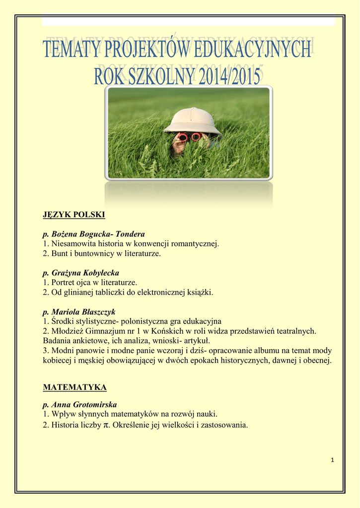 JĘZYK POLSKI p. Bożena Bogucka- Tondera 1. Niesamowita historia w konwencji romantycznej. 2. Bunt i buntownicy w literaturze. p. Grażyna Kobyłecka 1. Portret ojca w literaturze. 2. Od glinianej tabliczki do elektronicznej książki. p. Mariola Błaszczyk 1. Środki stylistyczne- polonistyczna gra edukacyjna 2. Młodzież Gimnazjum nr 1 w Końskich w roli widza przedstawień teatralnych. Badania ankietowe, ich analiza, wnioski- artykuł. 3. Modni panowie i modne panie wczoraj i dziś- opracowanie albumu na temat mody kobiecej i męskiej obowiązującej w dwóch epokach historycznych, dawnej i obecnej. MATEMATYKA p. Anna Grotomirska 1. Wpływ słynnych matematyków na rozwój nauki. 2. Historia liczby π. Określenie jej wielkości i zastosowania. 1 p. Ewa Sadorska 1. „Człowiek witruwiański”. 2. Od szyfru Cezara do klucza publicznego, czyli jak chronimy tajemnice? p. Aldona Mirecka 1. Moja klasa z matematyką w tle. 2. Znani polscy matematycy. HISTORIA p. Danuta Lenart 1. Harcerstwo czasu wojny- nie tylko Szare Szeregi. 2. Odzyskanie niepodległości w 1918 r. na terenie powiatu koneckiego „zapomniany bohater”. p. Marta Długosz 1. Stosunki polsko- krzyżackie od XIII do XVI wieku. 2. W cieniu męża….- o życiu i działalności królewskich małżonek. WIEDZA O SPOŁECZEŃSTWIE p. Alina Gwardecka 1. Patriota- puste słowo czy autentyczna wartość? BIOLOGIA p. Dorota Parszewska 1.Wszystko zaczyna się od nasion, czyli co jest potrzebne roślinom do kiełkowania i wzrostu. p. Urszula Kołodziejczyk 1. Tajemnice podwodnego świata zwierząt. CHEMIA p. Halina Mika 1. Prawda o tłuszczach. GEOGRAFIA p. Krystyna Wiśniewska 1. Step jako środowisko życia. 2. Śladami koneckich fabrykantów. 3. Wycieczka krajoznawcza w Góry Świętokrzyskie. 2 FIZYKA p. Małgorzata Piecuch 1. Zaprojektowanie i wykonanie pomocy dydaktycznych do demonstrowania wybranych zjawisk fizycznych. 2. Pokaz doświadczeń fizycznych z wykorzystaniem przedmiotów codziennego użytku. 3. Wykorzystanie zjawisk i praw fizyki w medycynie. INFORMATYKA p. Artur Kołodziejczyk 1.Darmowe oprogramowanie jako alternatywa dla oprogramowania komercyjnego. 2. Internet i nowoczesne technologie- korzyści czy zagrożenia? p. Krzysztof Kosidło 1. Historia komputera- od starożytności do dnia dzisiejszego. 2. Jak komputer zmienił życie człowieka? JĘZYK NIEMIECKI, JĘZYK ANGIELSKI p. Jolanta Boba 1. Zwyczaje świąteczne w krajach niemieckojęzycznych, anglojęzycznych oraz w Polsce. 2. Współczesny savoir- vivre dla nastolatków, czyli zasady zachowania się wobec niepełnosprawnych. 3. Najważniejsze momenty z życia zatrzymane w kadrze. p. Jadwiga Bernat 1. Język niemiecki w rytmie Hip- hopu. 2. Niemcy w moich oczach. p. Dorota Kowalska 1. Ślub w krajach anglojęzycznych- zwyczaje i przesądy. 2. Zwyczaje w Wielkiej Brytanii. p. Katarzyna Gonciarz 1. Zwyczaje bożonarodzeniowe w krajach niemieckojęzycznych. p. Justyna Dunajska 1. Znane kobiety w historii Wielkiej Brytanii. 2. Twórczość znanych poetów brytyjskich. 3. Odrębność kulturowa Królestwa Zjednoczonego. 3 p. Ewelina Makówka 1. Znani brytyjscy poeci i ich twórczość- projekt dwujęzyczny (prezentacja multimedialna, recytacja). 2. Legendy brytyjskiej i amerykańskiej muzyki rozrywkowej- projekt dwujęzyczny, prezentacja multimedialna. PLASTYKA p. Wanda Pobocha 1. Medialny charakter współczesnych wydarzeń artystycznych. 2. Przyczyny i formy przemian w architekturze na przykładzie sześciu najsłynniejszych budowli stulecia 1850- 1950. TECHNIKA p. Krzysztof Kosidło 1. Urządzenia techniczne wokół nas. 2. Oszczędzamy energię elektryczną w naszych domach. RELIGIA s. E. Bigaj 1. Rozwój życia zakonnego w Polsce. 2. Bł. o. Honorat Koźmiński- założyciel zgromadzeń bezhabitowych. p. Małgorzata Krupa 1. Jerozolima- miejsce pielgrzymek. 2. Tradycje i kultura żydowska. 3. Wielkie religie świata. WYCHOWANIE FIZYCZNE p. Ewa Staniszewska 1. X- lecie działalności zespołu „Brush”. 2. Taniec formą aktywności ruchowej. p. Jacek Dzitkowski 1. Wpływ wzmożonej aktywności ruchowej człowieka na zdrowie i profilaktykę chorób cywilizacyjnych. 2. Ruch jako czynnik stymulujący, adaptacyjny, wyrównawczy i korekcyjny. 4 p. Barbara Kania 2. Walory turystyczne i rekreacyjne mojej gminy. 3. Wpływ aktywności fizycznej na zdrowie człowieka. p. Ewa Janus 1. Sukcesy polskich siatkarzy w XXI w. – charakterystyka reprezentacji Polski mężczyzn i jej osiągnięć od 2001 roku. 2. Równość i akceptacja- udział osób niepełnosprawnych w sporcie- prezentacja multimedialna. p. Mirosław Dworak 1. Największe osiągnięcia sportowe Gimnazjum nr 1 w Końskich w Wojewódzkich Igrzyskach Młodzieży Szkolnej w latach 2001- 2014- prezentacja multimedialna. PROJEKT INTERDYSCYPLINARNY CHEMIA, BIOLOGIA p. Halina Mika, p. Dorota Parszewska 1. Od łąki do łazienki, czyli wykorzystanie kosmetyków naturalnych do higieny osobistej. WYCHOWANIE FIZYCZNE, PLASTYKA, INFORMATYKA p. Mirosław Dworak, p. Wanda Pobocha, p. Krzysztof Kosidło 1. Sport w wyobraźni ucznia. INFORMACJA DLA UCZNIÓW: Temat projektu edukacyjnego należy wybrać do 31 października 2014r. 5 6