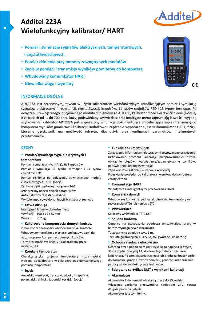 Additel 223A Wielofunkcyjny kalibrator/ HART ▪ Pomiar i symulacja sygnałów elektrycznych, temperaturowych, i częstotliwościowych ▪ Pomiar ciśnienia przy pomocy zewnętrznych modułów ▪ Zapis w pamięci i transmisja wyników pomiarów do komputera ▪ Wbudowany komunikator HART ▪ Niewielka waga i wymiary INFORMACJE OGÓLNE ADT223A jest przenośnym, łatwym w użyciu kalibratorem wielofunkcyjnym umożliwiającym pomiar i symulację sygnałów elektrycznych,, rezystancji, częstotliwości, częstotliwości impulsów, 11 typów czujników RTD i 13 typów termopar. Po dołączeniu zewnętrznego,, opcjonalnego modułu ciśnieniowego ADT160, kalibrator może mierzyć ci ciśnienie (moduły o zakresach od -1 do 700 bar). Duży, podświetlany wyświetlacz oraz intuicyjne menu zapewniają łatwość i wygodę użytkowania. Kalibrator ADT223A jest wyposażony w funkcje dokumentujące umożliwiające zapis i transmisję do komputera wyników pomiarów i kalibracji. Dodatkowo urządzenie wyposażone jest w komunikator HART HART, dzięki któremu użytkownik ma możliwość odczytu, diagnostyki oraz konfiguracji parametr parametrów inteligentnych przetworników. CECHY ▪ Funkcje dokumentujące ▪ Pomiar/symulacja sygn. elektrycznych i Zarządzanie informacjami dotyczącymi testowanego urządzenia Definiowanie procedur kalibracji, przeprowadzanie testów, obliczanie błędów, wyświetlanie/zapamiętywanie wyników, podświetlenie błędnych wartości Zapis wyników kalibracji wstępnej i końcowej Przesyłanie procedur do kalibratora i wyników do komputera Zrzuty ekranu temperatury Pomiar i symulacja mV, mA, Ω,, Hz i impulsów Pomiar i symulacja 13 typów termopar i 11 typów czujników RTD Pomiar ciśnienia po dołączeniu zewnętrznego modułu ciśnieniowego ADT160 (opcja) Zasilanie pętli prądowej napięciem 24V Jednoczesny odczyt dwóch parametrów Automatyczny test stanu styków Wyjście impulsowe lsowe do kalibracji liczników przepływu ▪ Łatwa obsługa ▪ Komunikacja HART Współpraca z inteligentnymi przetwornika HART ▪ Konwersja danych Wbudowany konwerter jednostek ciśnienia, iśnienia, temperatury na rezystancję (RTD) lub napięcie (TC) Intuicyjne i łatwe w obsłudze menu Wymiary: 100 x 19 x 52mm Waga: 0.7 kg ▪ Wyświetlacz ▪ Kalibrowana kompensacja zimnych końców Odporna na uszkodzenia obudowa umożliwiająca pracę w bardzo wymagających warunkach. Testowany na upadek z wys. 1 m. Trzy lata gwarancji na ADT223A,, rok gwarancji na baterię Zimne końce termopary wbudowane w kalibratorze Wbudowany termistor z elastycznymi przewodami do automatycznej kompensacji zimnych końców. końców Termistor może być wyjęty i skalibrowany kalibrowany przez użytkownika ▪ Korekcja temperatur Charakterystyka czujnika temperatury może zostać wpisana do kalibratora w celu uzyskania dokładniejszego pomiaru temperatury. ▪ Język Angielski, niemiecki, francuski, włoski, hiszpański, portugalski, chiński. Japoński, rosyjski (opcja). (opcja) Kolorowy wyświetlacz TFT, 3.5” ▪ Solidna budowa ▪ Ochrona i izolacja elektryczna Ochrona przed podpięciem zbyt wysokiego napięcia (powyżej 30V) V) i prądu (powyżej 1A) do dowolnych dwóch zacisków kalibratora. Po zmniejszeniu napięcia lub prądu kalibrator wróci do normalnej pracy. Obwody pomiaru, generacji oraz zasilania pętli są od siebie elektrycznie izolowane. ▪ Fabryczny certyfikat NIST z wynikami kalibracji ▪ Akumulator Akumulator Li-ion ion umożliwia ciągłą pracę do 15 godzin. Włączenie zasilania przetwornika napięciem 24V 24V, skraca długość pracy na baterii. Akumulator jest wymienny. APLIKACJE Wielofunkcyjny kalibrator ADT223A to narzędzie do pomiaru generowania/symulacji sygnałów prądowych (mA), napięciowych (V, mV), czujników RTD i TC, Ohm, częstotliwości, impulsów, ciśnienia, umożliwia testowanie stanu styków łączników oraz zasilanie pętli pomiarowej napięciem 24V. ▪ Sygnały elektryczne i temperatury Pomiar/symulacja rezystancji Pomiar/symulacja częstotliwości Test stanu styków Pomiar/symulacja napięcia Zliczanie/symulacja impulsów ▪ Temperatura Pomiar/symulacja czujników RTD ▪ ▪ Pomiar/symulacja prądu Zasilanie pętli pomiarowej napięciem 24V Pomiar/symulacja TC Certyfikat kalibracji zgodny z NIST Gwarancja: 3 lata SPECYFIKACJA ▪ Sygnały elektryczne ▪ Specyfikacja ogólna Warunki pracy Dokładność pomiaru Napięcie DC Prąd DC Zakres Rozdzielczość Dokładność Temperatura pracy -10 do 50°C ±75.0000mV 0.1µV 0.01%wsk+0.005%FS Temperatura przechowywania -20 do 60°C ±30.0000V 0.1mV 0.01%wsk+0.005%FS Wilgotność <90% ±30.0000mA 0.1µA 0.01%wsk+0.005%FS Rezystan- 2-przew. 0 do 400.000Ω cja 3-przew. 0 do 400.000Ω 1mΩ Ω 0.02%wsk+0.005%FS 1mΩ Ω 0.02%wsk+0.005%FS 4-przew. 0 do 400.000Ω 1mΩ Ω 0.01%wsk+0.005%FS 2-przew. 0 do 4000.000Ω 10mΩ Ω 0.02%wsk+0.005%FS 3-przew. 0 do 4000.000Ω 10mΩ Ω 0.02%wsk+0.005%FS 4-przew. 0 do 4000.000Ω 10mΩ Ω 0.01%wsk+0.005%FS Częstotliwość 1 do 50000.0Hz 0.1Hz 0.005%wsk+0.002%FS Impulsy 0 do 999 999 1 N/A Dla styków pod napięciem – zakres dopuszczalny: 3 do 24V Test styków Dokładność generowania/symulacji Zakres Rozdzielczość Dokładność -10.00 do 75.000mV 1µV 0.02%wsk+0.005%FS 0 do 12.0000V 0.1mV 0.02%wsk+0.005%FS 0 do 22.000mA 1µA 0.02%wsk+0.005%FS 1 do 400.0Ω 10mΩ 0.02%wsk+0.005%FS 1 do 4000.0Ω 100mΩ 0.03%wsk+0.01%FS Częstotliwość 1 do 50000.0Hz 0.1Hz 0.005%wsk+0.002%FS Impulsy 0 do 999 999 1 N/A 24 V DC N/A N/A 0.5V Oznaczenia/bezpieczeństwo Specyfikacja mechaniczna Wyświetlacz TFT, kolorowy, przekątna: 3.5” Przyłacza elektryczne przyłącza 4mm oraz przyłącze na termoparę RS232 Standardowy port RS232 RS232-DB9 Wymiary 100mm x 192mm x 52mm Waga 0.7 kg Zasilanie Akumulator Li Li-ion lub zasilacz 10V DC Bateria Akumulator Li Li-ion (standardowe wyposażenie) Żywotność baterii Napięcie DC Prąd DC Rezystancja Pomiar ciśnienia Zewnętrzne moduły ciśnienia AD