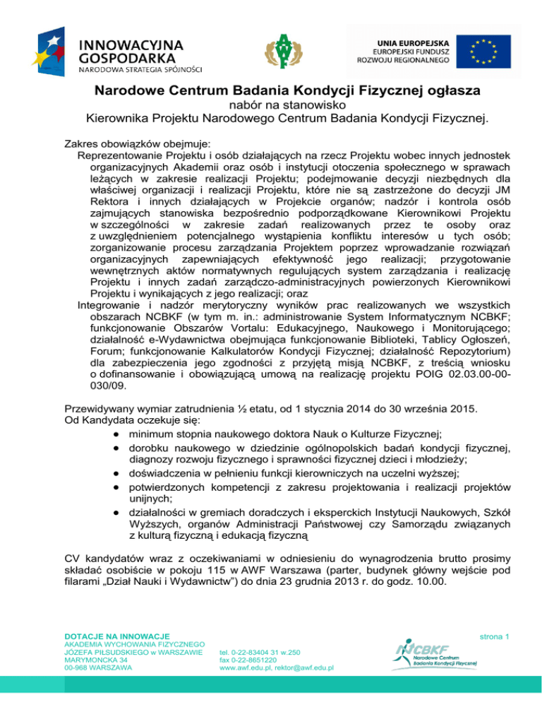 Narodowe Centrum Badania Kondycji Fizycznej ogłasza nabór na stanowisko Kierownika Projektu Narodowego Centrum Badania Kondycji Fizycznej. Zakres obowiązków obejmuje: Reprezentowanie Projektu i osób działających na rzecz Projektu wobec innych jednostek organizacyjnych Akademii oraz osób i instytucji otoczenia społecznego w sprawach leżących w zakresie realizacji Projektu; podejmowanie decyzji niezbędnych dla właściwej organizacji i realizacji Projektu, które nie są zastrzeżone do decyzji JM Rektora i innych działających w Projekcie organów; nadzór i kontrola osób zajmujących stanowiska bezpośrednio podporządkowane Kierownikowi Projektu w szczególności w zakresie zadań realizowanych przez te osoby oraz z uwzględnieniem potencjalnego wystąpienia konfliktu interesów u tych osób; zorganizowanie procesu zarządzania Projektem poprzez wprowadzanie rozwiązań organizacyjnych zapewniających efektywność jego realizacji; przygotowanie wewnętrznych aktów normatywnych regulujących system zarządzania i realizację Projektu i innych zadań zarządczo-administracyjnych powierzonych Kierownikowi Projektu i wynikających z jego realizacji; oraz Integrowanie i nadzór merytoryczny wyników prac realizowanych we wszystkich obszarach NCBKF (w tym m. in.: administrowanie System Informatycznym NCBKF; funkcjonowanie Obszarów Vortalu: Edukacyjnego, Naukowego i Monitorującego; działalność e-Wydawnictwa obejmująca funkcjonowanie Biblioteki, Tablicy Ogłoszeń, Forum; funkcjonowanie Kalkulatorów Kondycji Fizycznej; działalność Repozytorium) dla zabezpieczenia jego zgodności z przyjętą misją NCBKF, z treścią wniosku o dofinansowanie i obowiązującą umową na realizację projektu POIG 02.03.00-00030/09. Przewidywany wymiar zatrudnienia ½ etatu, od 1 stycznia 2014 do 30 września 2015. Od Kandydata oczekuje się: minimum stopnia naukowego doktora Nauk o Kulturze Fizycznej; dorobku naukowego w dziedzinie ogólnopolskich badań kondycji fizycznej, diagnozy rozwoju fizycznego i sprawności fizycznej dzieci i młodzieży; doświadczenia w pełnieniu funkcji kierowniczych na uczelni wyższej; potwierdzonych kompetencji z zakresu projektowania i realizacji projektów unijnych; działalności w gremiach doradczych i eksperckich Instytucji Naukowych, Szkół Wyższych, organów Administracji Państwowej czy Samorządu związanych z kulturą fizyczną i edukacją fizyczną CV kandydatów wraz z oczekiwaniami w odniesieniu do wynagrodzenia brutto prosimy składać osobiście w pokoju 115 w AWF Warszawa (parter, budynek główny wejście pod filarami „Dział Nauki i Wydawnictw”) do dnia 23 grudnia 2013 r. do godz. 10.00. DOTACJE NA INNOWACJE AKADEMIA WYCHOWANIA FIZYCZNEGO JÓZEFA PIŁSUDSKIEGO w WARSZAWIE MARYMONCKA 34 00-968 WARSZAWA strona 1 tel. 0-22-83404 31 w.250 fax 0-22-8651220 www.awf.edu.pl, [email protected]