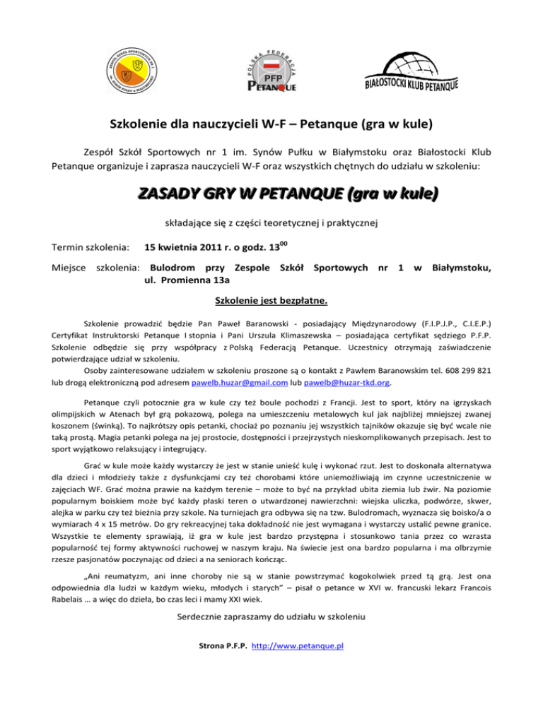 Szkolenie dla nauczycieli W-F – Petanque (gra w kule) Zespół Szkół Sportowych nr 1 im. Synów Pułku w Białymstoku oraz Białostocki Klub Petanque organizuje i zaprasza nauczycieli W-F oraz wszystkich chętnych do udziału w szkoleniu: ZASADY GRY W PETANQUE (gra w kule) składające się z części teoretycznej i praktycznej Termin szkolenia: 15 kwietnia 2011 r. o godz. 1300 Miejsce szkolenia: Bulodrom przy Zespole Szkół Sportowych nr 1 w Białymstoku, ul. Promienna 13a Szkolenie jest bezpłatne. Szkolenie prowadzić będzie Pan Paweł Baranowski - posiadający Międzynarodowy (F.I.P.J.P., C.I.E.P.) Certyfikat Instruktorski Petanque I stopnia i Pani Urszula Klimaszewska – posiadająca certyfikat sędziego P.F.P. Szkolenie odbędzie się przy współpracy z Polską Federacją Petanque. Uczestnicy otrzymają zaświadczenie potwierdzające udział w szkoleniu. Osoby zainteresowane udziałem w szkoleniu proszone są o kontakt z Pawłem Baranowskim tel. 608 299 821 lub drogą elektroniczną pod adresem [email protected] lub [email protected]. Petanque czyli potocznie gra w kule czy też boule pochodzi z Francji. Jest to sport, który na igrzyskach olimpijskich w Atenach był grą pokazową, polega na umieszczeniu metalowych kul jak najbliżej mniejszej zwanej koszonem (świnką). To najkrótszy opis petanki, chociaż po poznaniu jej wszystkich tajników okazuje się być wcale nie taką prostą. Magia petanki polega na jej prostocie, dostępności i przejrzystych nieskomplikowanych przepisach. Jest to sport wyjątkowo relaksujący i integrujący. Grać w kule może każdy wystarczy że jest w stanie unieść kulę i wykonać rzut. Jest to doskonała alternatywa dla dzieci i młodzieży także z dysfunkcjami czy też chorobami które uniemożliwiają im czynne uczestniczenie w zajęciach WF. Grać można prawie na każdym terenie – może to być na przykład ubita ziemia lub żwir. Na poziomie popularnym boiskiem może być każdy płaski teren o utwardzonej nawierzchni: wiejska uliczka, podwórze, skwer, alejka w parku czy też bieżnia przy szkole. Na turniejach gra odbywa się na tzw. Bulodromach, wyznacza się boisko/a o wymiarach 4 x 15 metrów. Do gry rekreacyjnej taka dokładność nie jest wymagana i wystarczy ustalić pewne granice. Wszystkie te elementy sprawiają, iż gra w kule jest bardzo przystępna i stosunkowo tania przez co wzrasta popularność tej formy aktywności ruchowej w naszym kraju. Na świecie jest ona bardzo popularna i ma olbrzymie rzesze pasjonatów poczynając od dzieci a na seniorach kończąc. „Ani reumatyzm, ani inne choroby nie są w stanie powstrzymać kogokolwiek przed tą grą. Jest ona odpowiednia dla ludzi w każdym wieku, młodych i starych” – pisał o petance w XVI w. francuski lekarz Francois Rabelais … a więc do dzieła, bo czas leci i mamy XXI wiek. Serdecznie zapraszamy do udziału w szkoleniu Strona P.F.P. http://www.petanque.pl